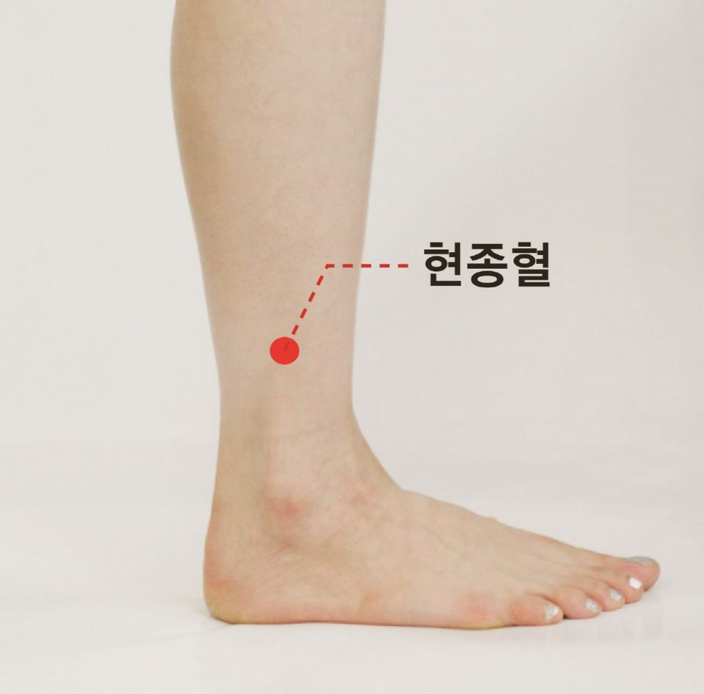 현종혈은 발목 바깥쪽 복사뼈 위로 손가락 세 마디 정도 올라간 곳에 위치한 경혈입니다.