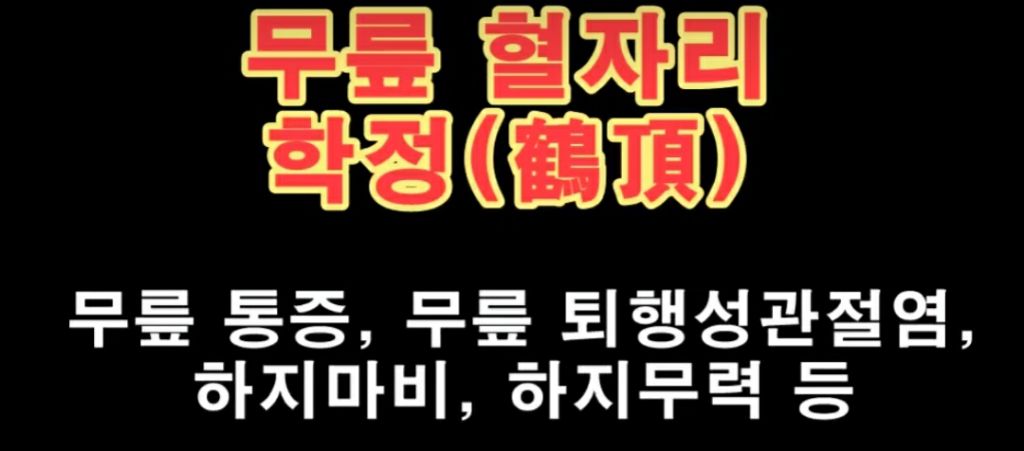 학정혈(鶴頂穴)은 학의 정수리란 뜻을 가진 혈로, 무릎근육을 강화해 걸을 때 무릎 충격을 흡수하고, 무릎통증을 완화시킨다.