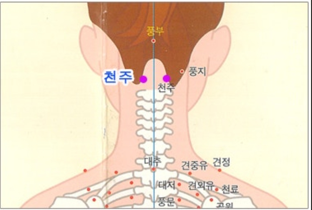천주혈은 목 뒤쪽, 머리카락 경계선의 중앙에서 양 옆으로 1~3cm 떨어진 곳에 위치하며, 승모근의 바깥쪽 경계선에 있는 혈자리입니다. 주로 두통, 뒷목 통증, 어깨 결림, 고혈압, 비염 등에 효과가 있다고 알려져 있습니다.