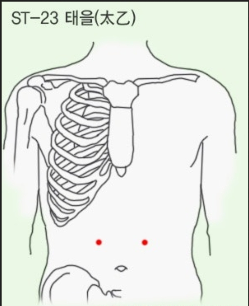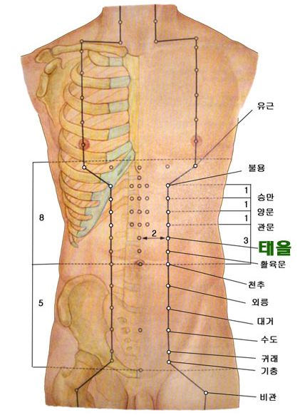 태을(太乙) : 배꼽 위 2촌, 관문 아래 1촌, 하완 양옆 2촌.