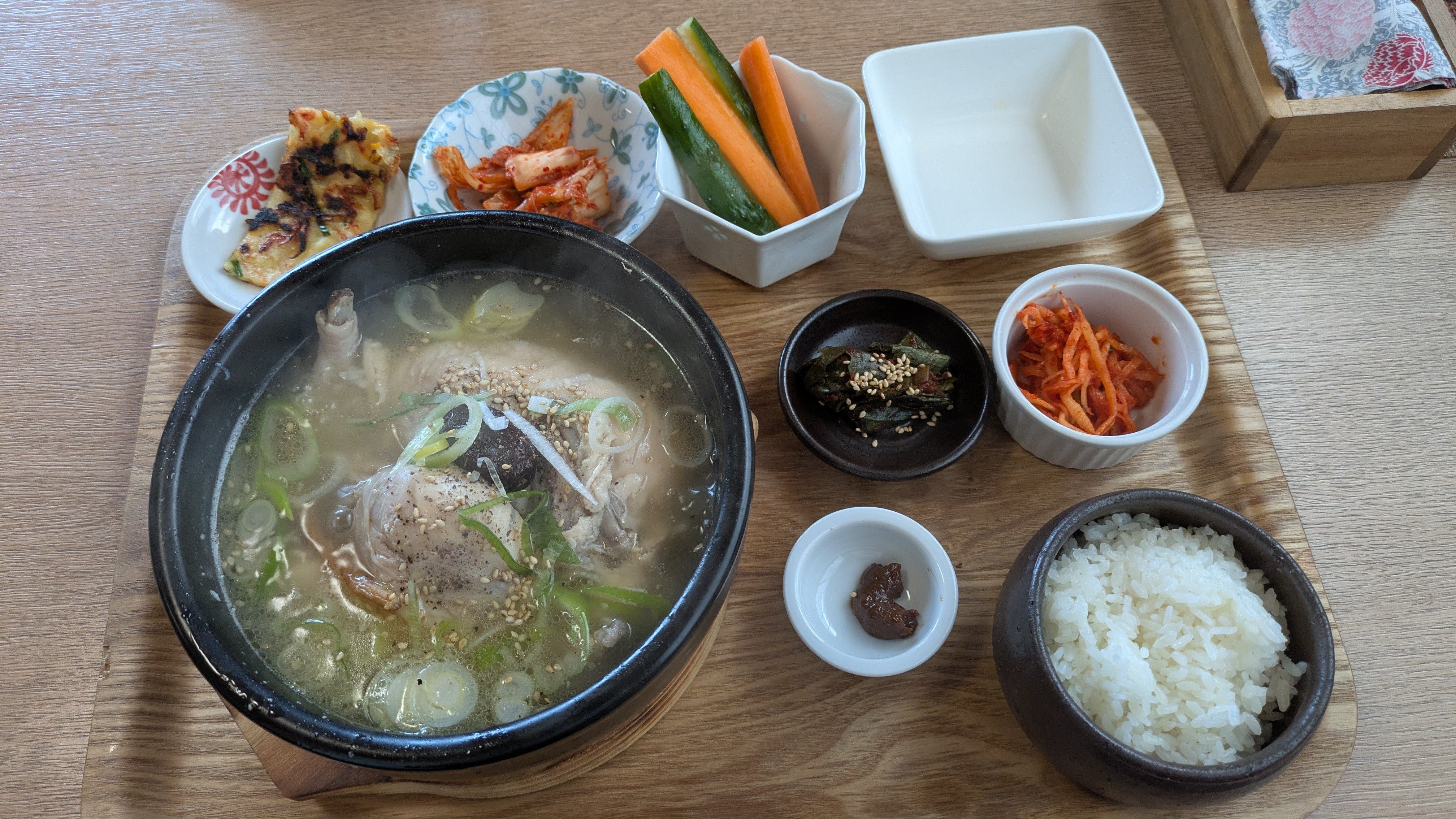 10분 정도 기다리니까 삼계탕이 나왔습니다. 기본 반찬에 깔끔한 삼계탕이였는데요.