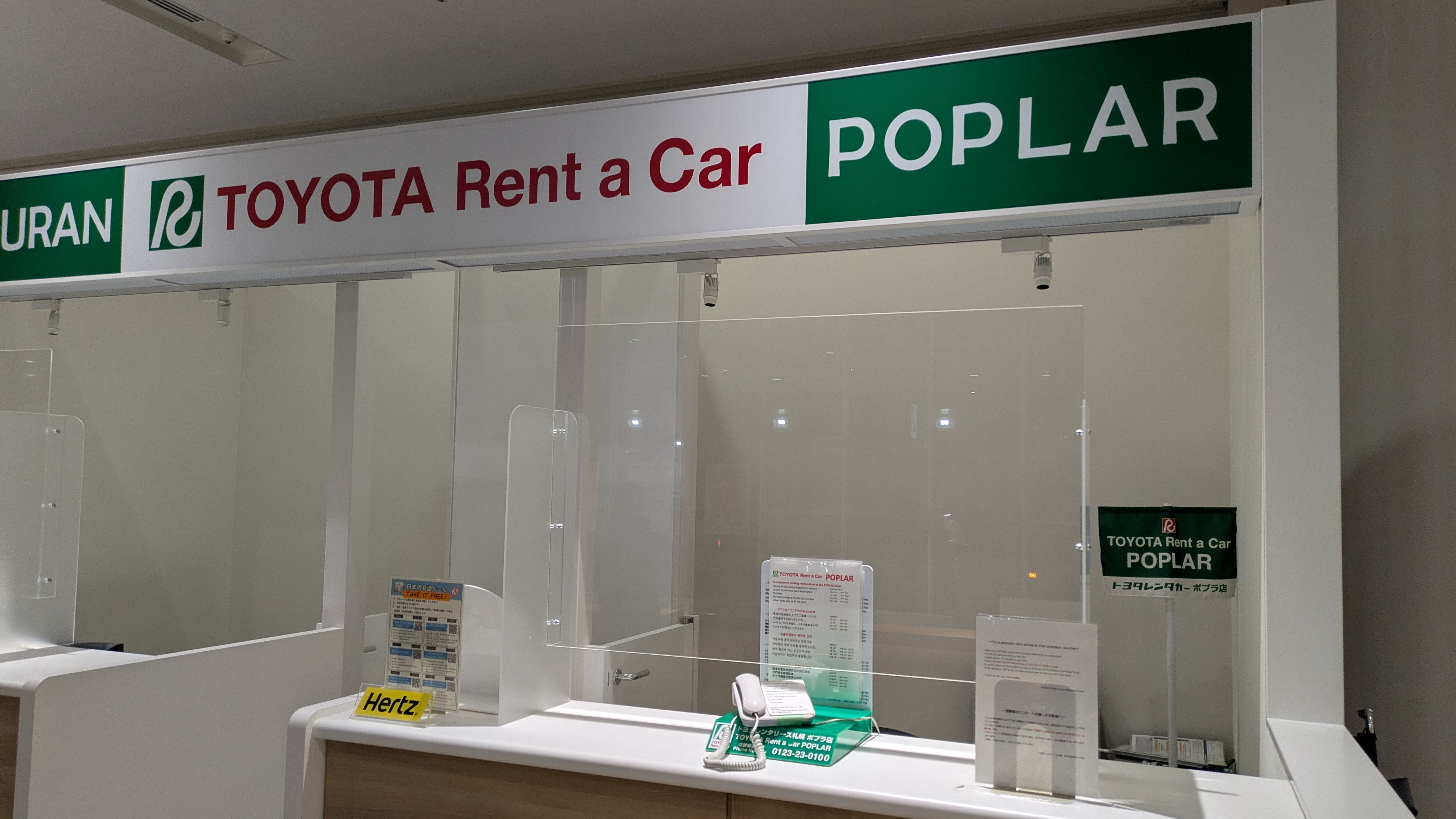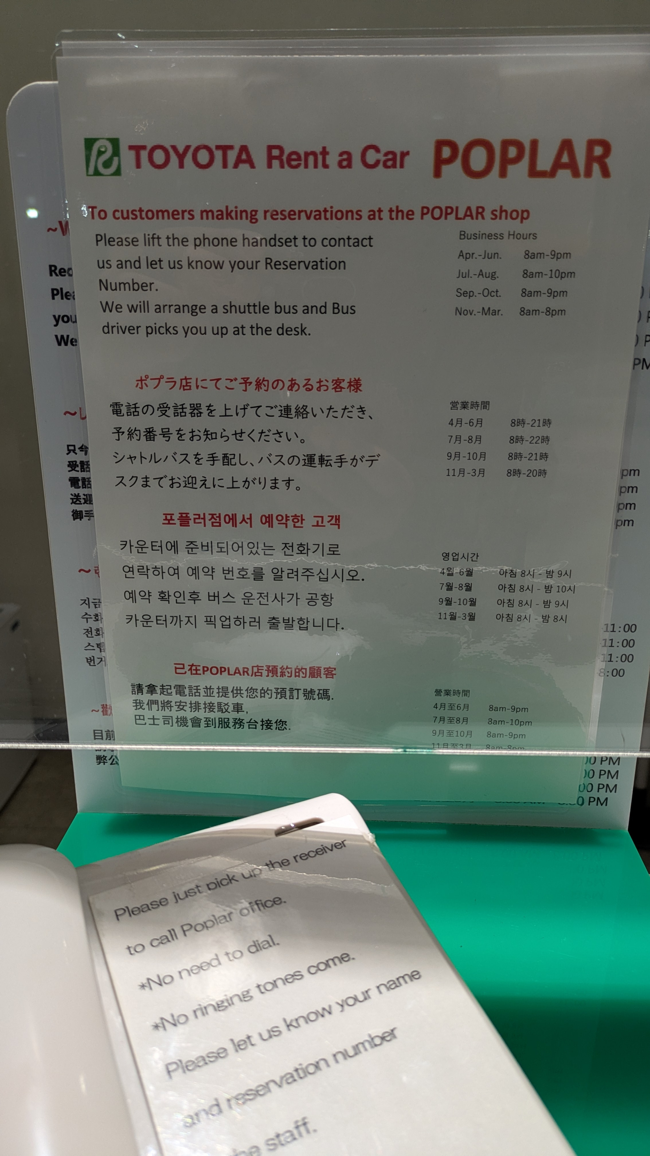 ✔ 렌터카 안내 창구에는 전화기와 한국어 안내가 있습니다.