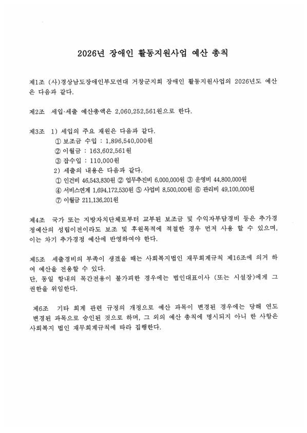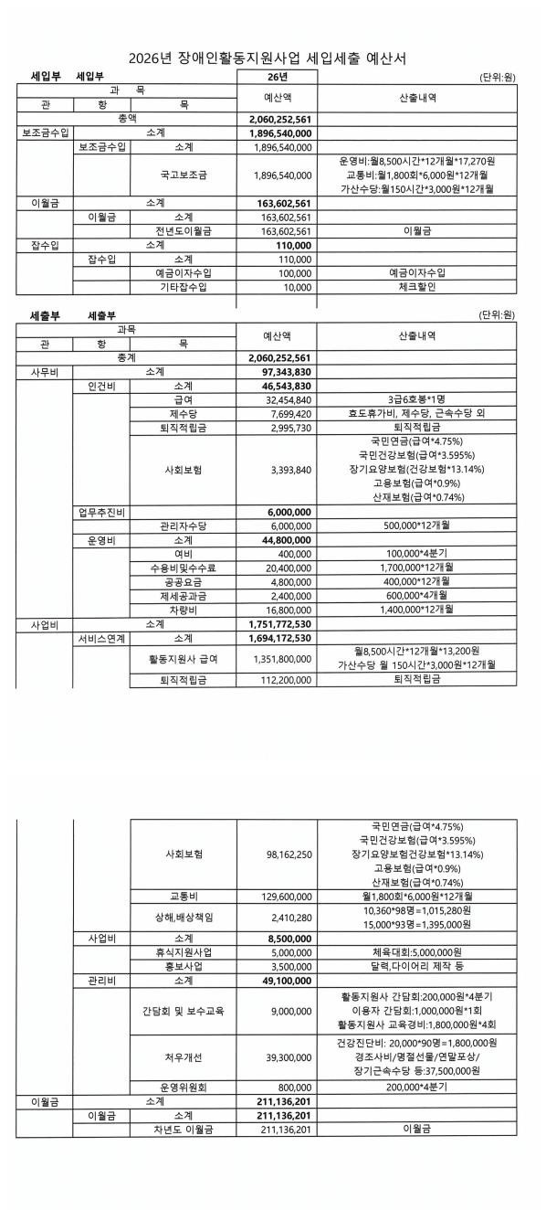 2026년 장애인활동지원사업 세입·세출 예산서·예산총칙 작성자느티나무|작성시간26.01.02|조회수5 목록 댓글 0 글자크기 작게가 글자크기 크게가 다음검색 현재 게시글 추가 기능 열기 북마크 신고 센터로 신고 댓글 댓글 0 댓글쓰기 답글쓰기 댓글 리스트