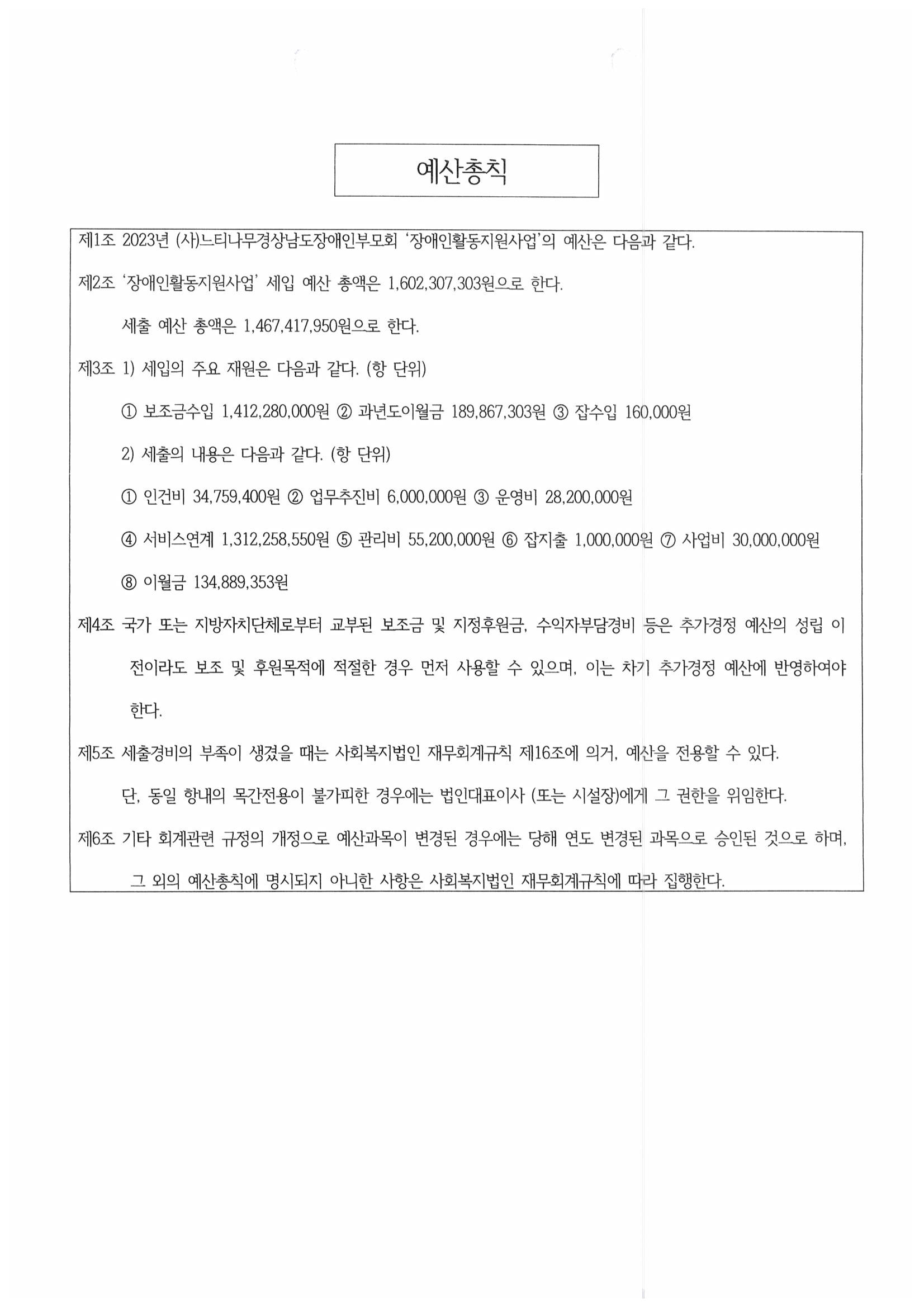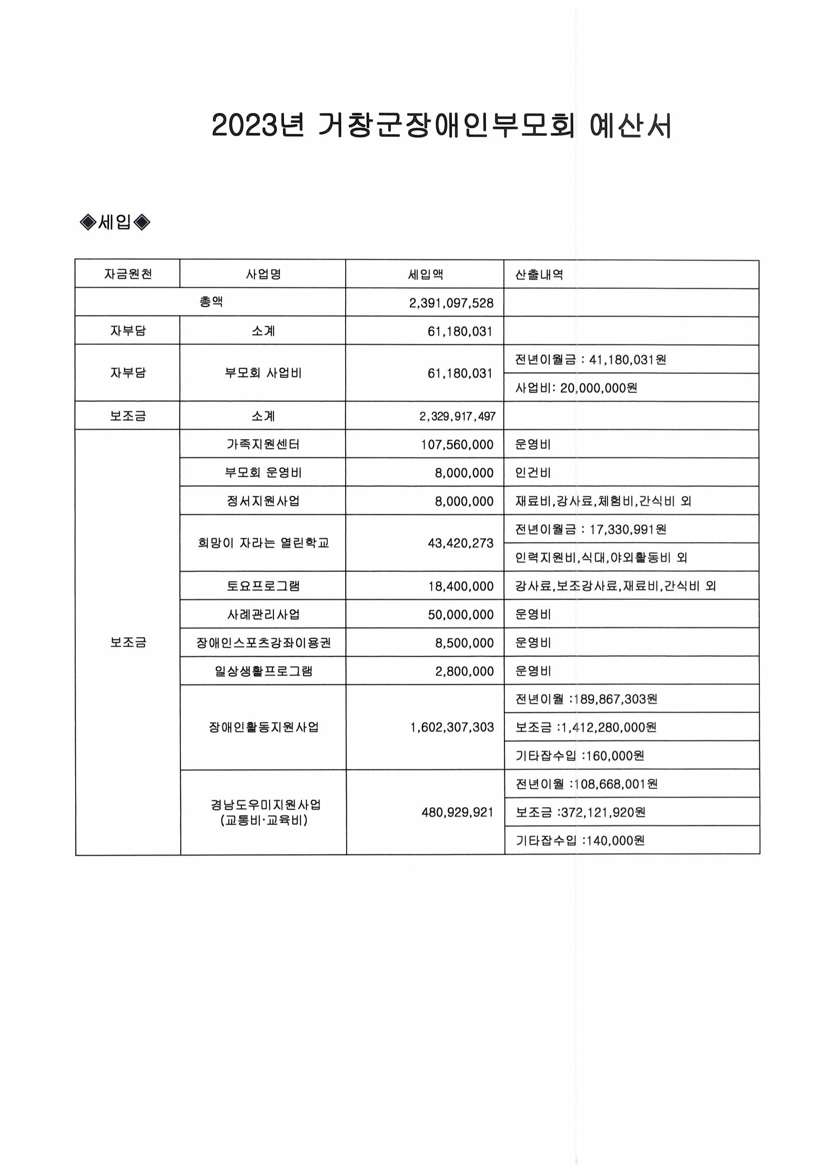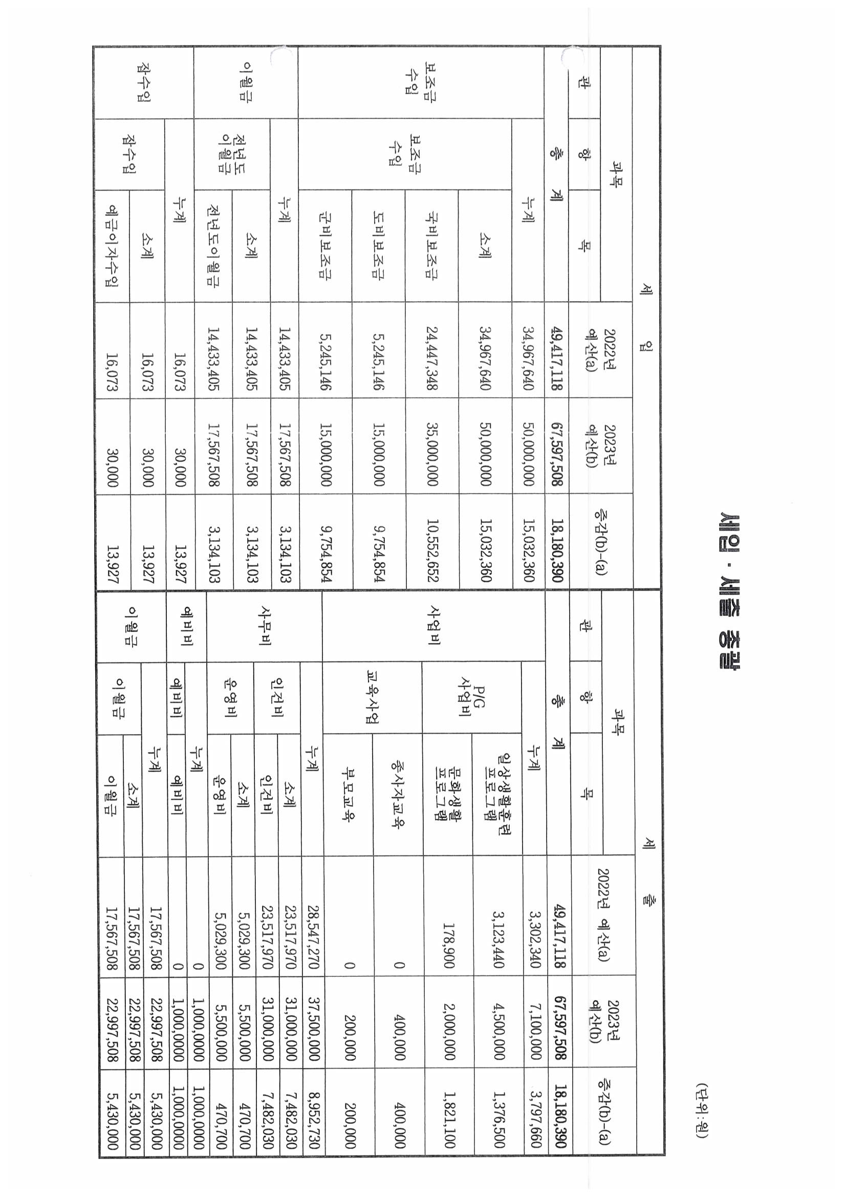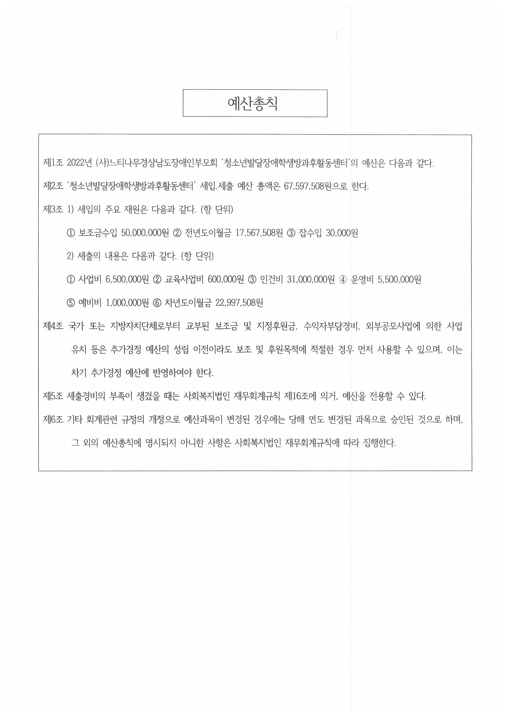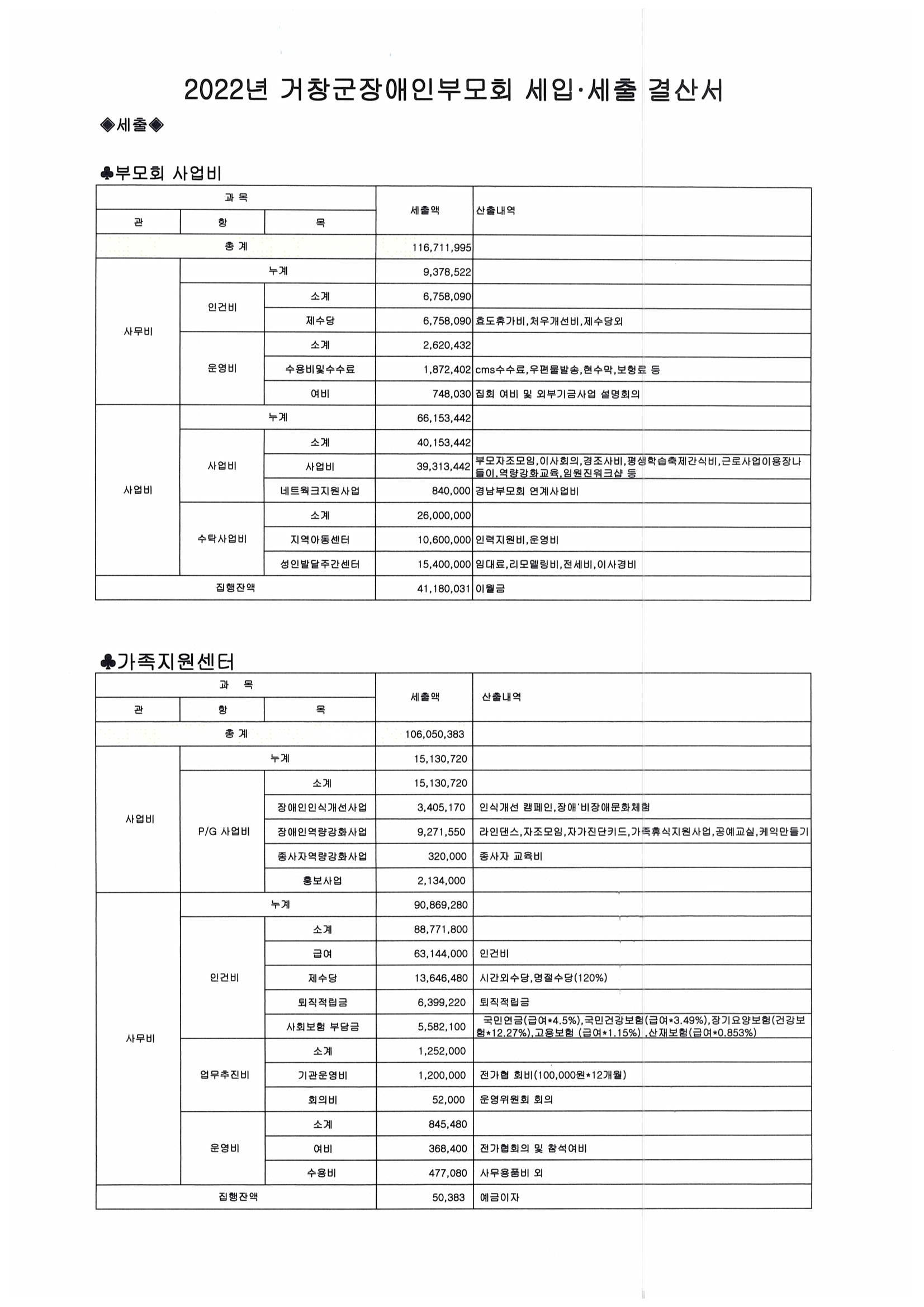 2022년 느티나무장애인부모회 거창군지부 세입·세출 결산서 및 2023년 세입·세출 예산서·예산총칙 작성자느티나무|작성시간25.05.15|조회수50 목록 댓글 0 글자크기 작게가 글자크기 크게가 다음검색 현재 게시글 추가 기능 열기 북마크 공유하기 신고 센터로 신고 댓글 댓글 0 댓글쓰기 답글쓰기 댓글 리스트