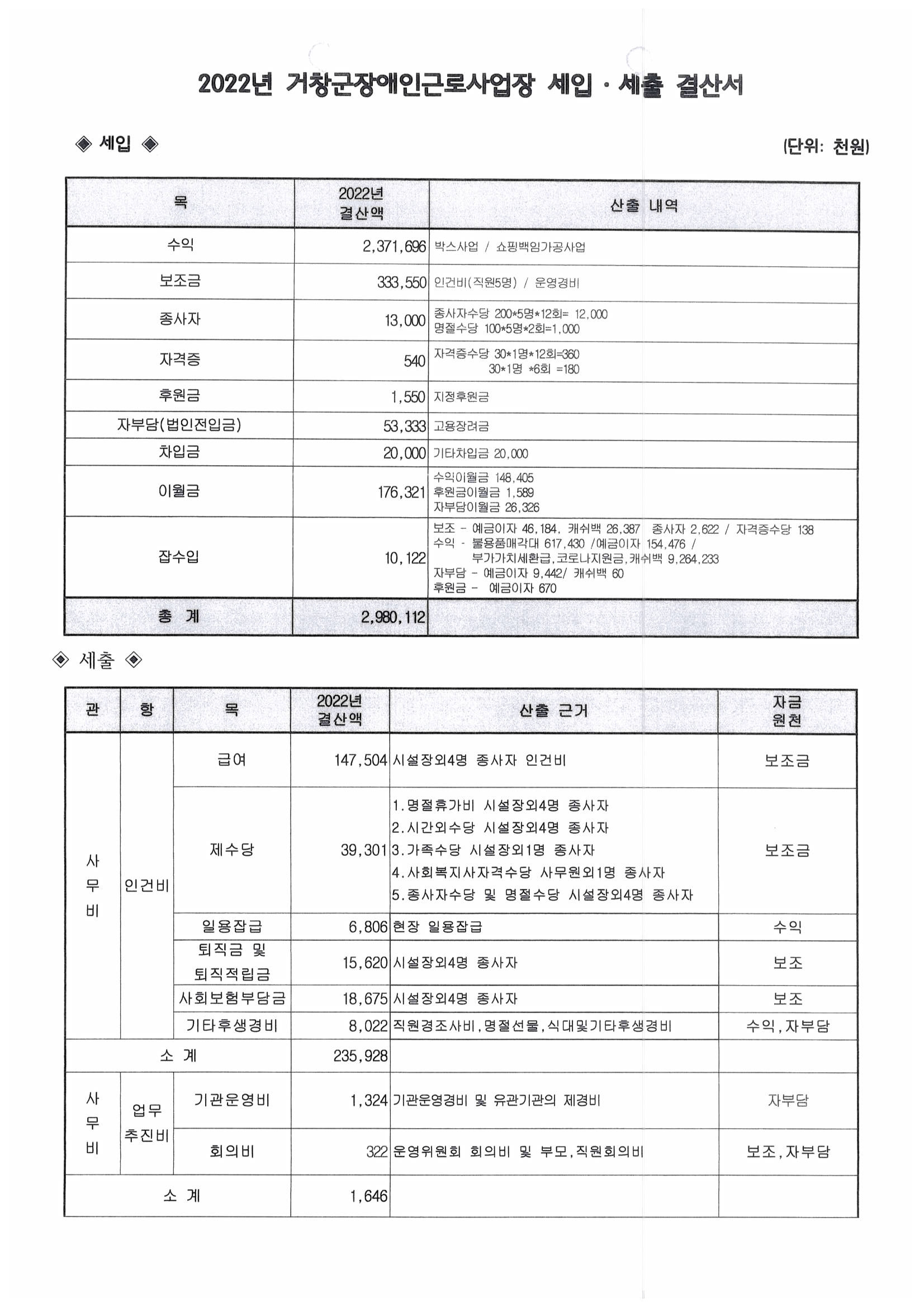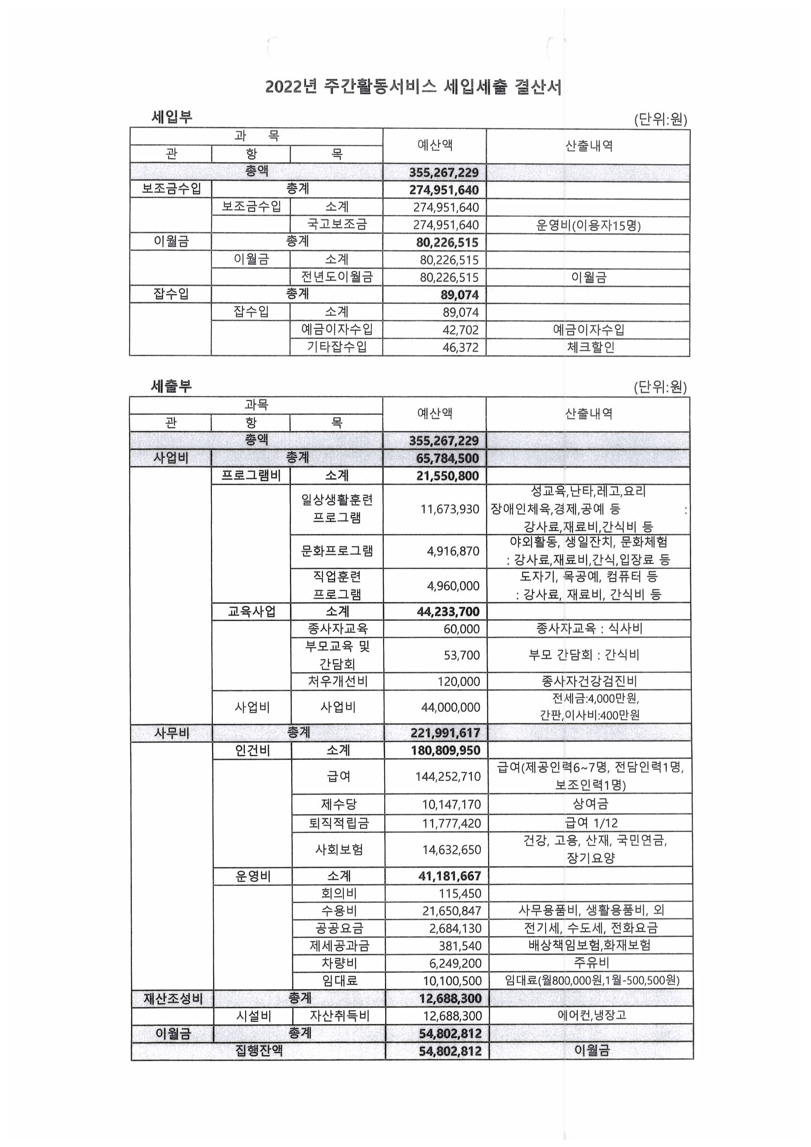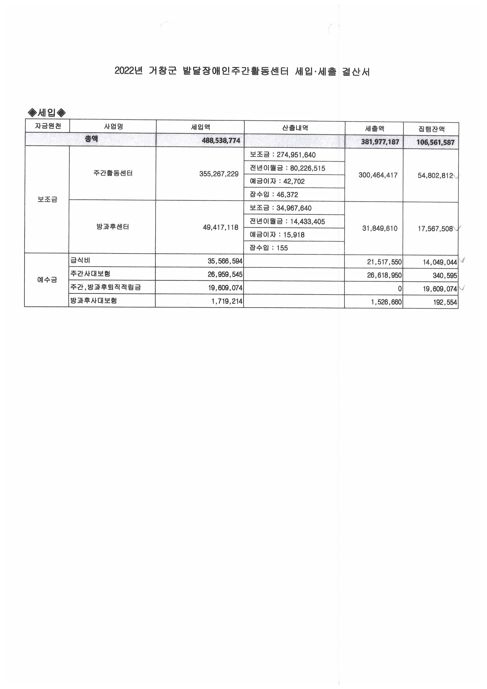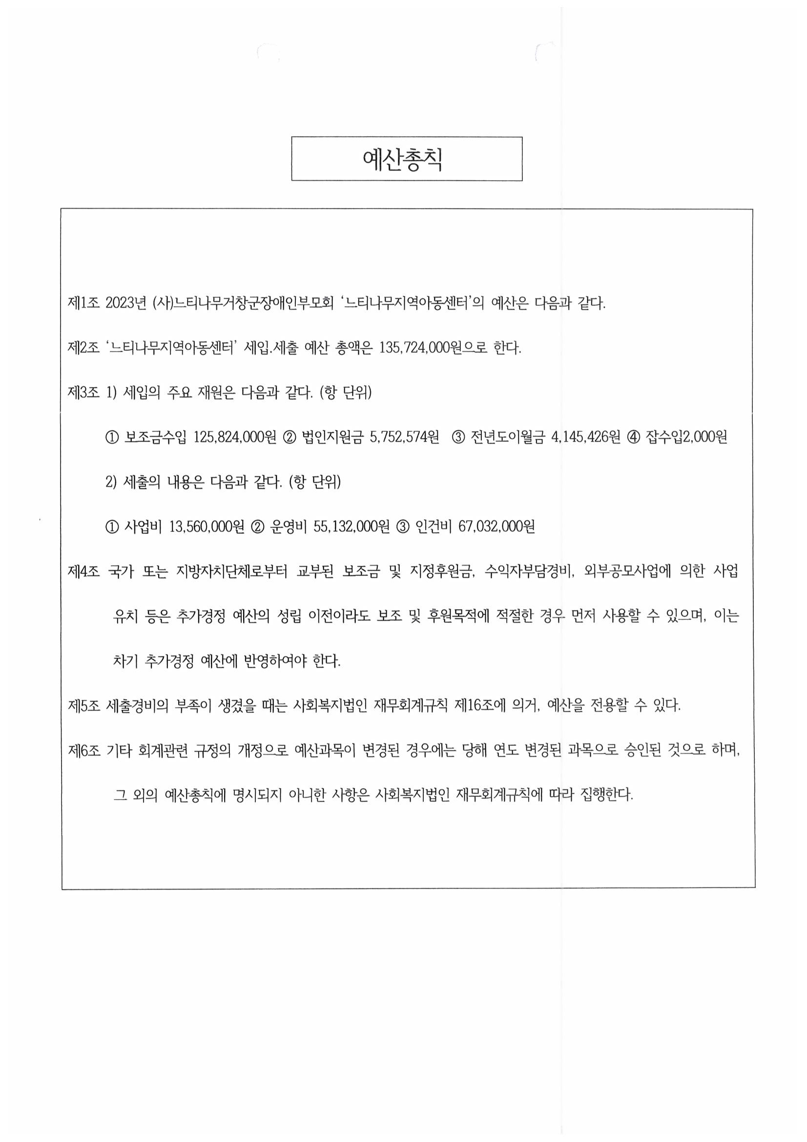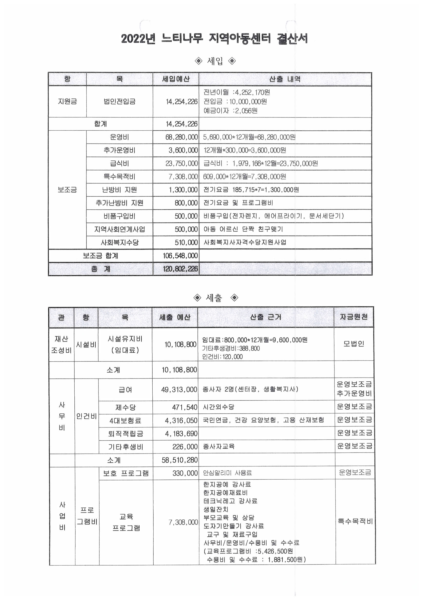 2022년 느티나무장애인부모회 거창군지부 세입·세출 결산서 및 2023년 세입·세출 예산서·예산총칙 작성자느티나무|작성시간25.05.15|조회수50 목록 댓글 0 글자크기 작게가 글자크기 크게가 다음검색 현재 게시글 추가 기능 열기 북마크 공유하기 신고 센터로 신고 댓글 댓글 0 댓글쓰기 답글쓰기 댓글 리스트