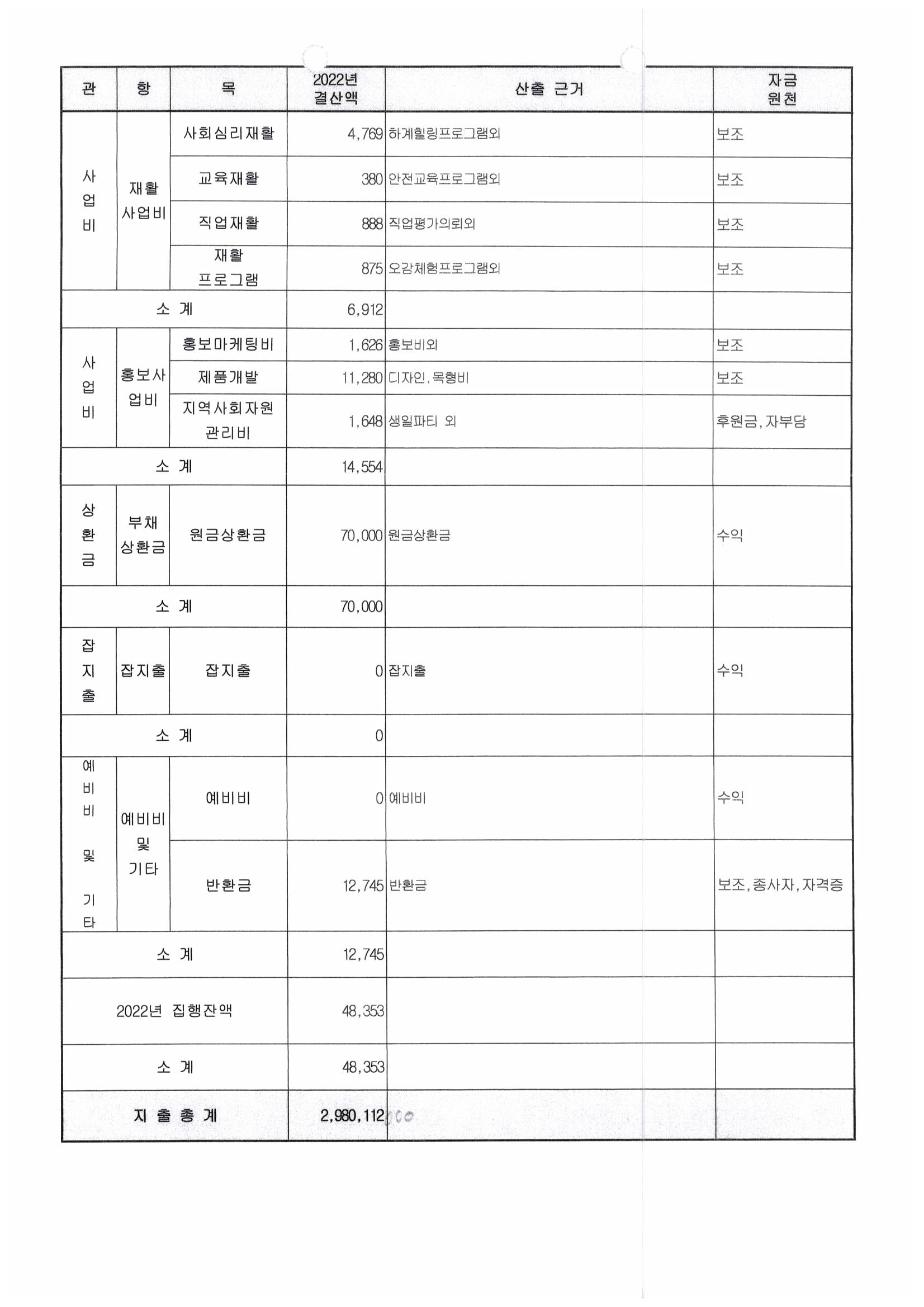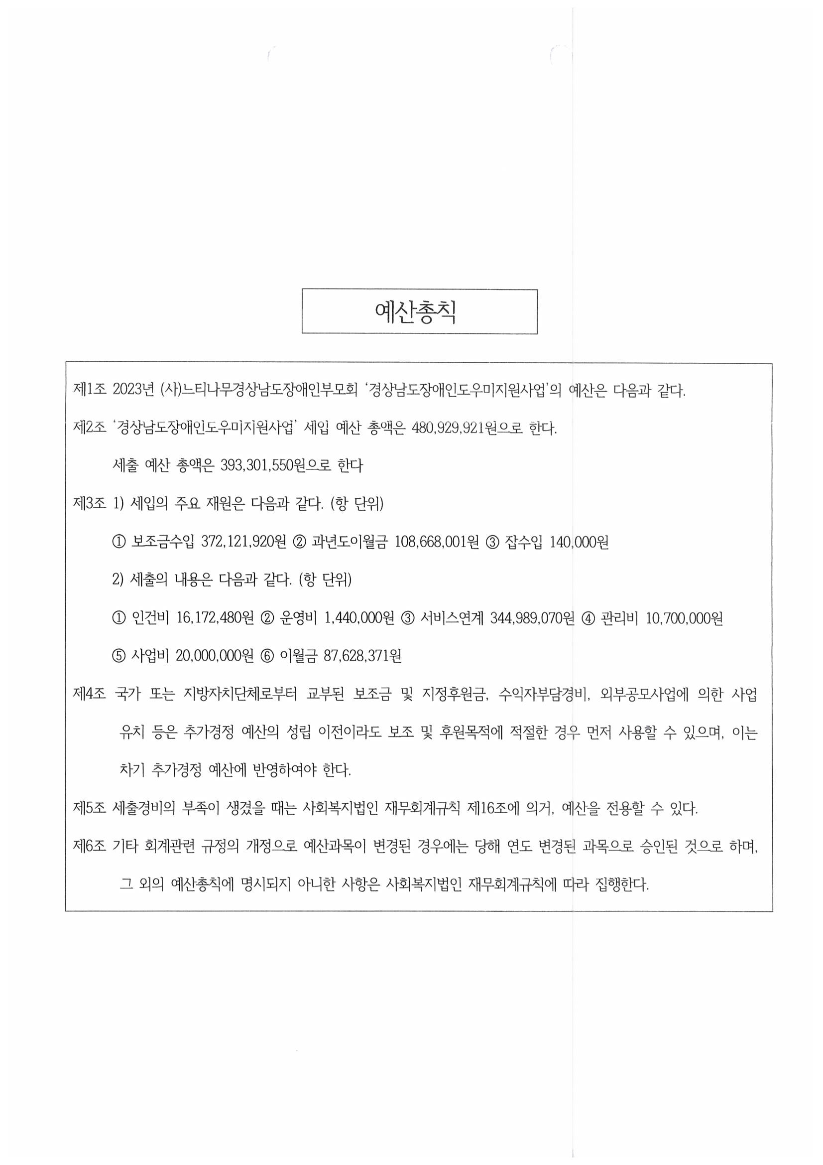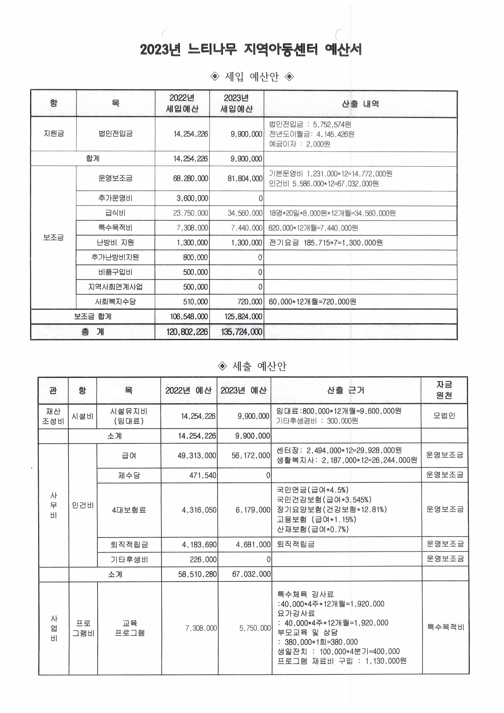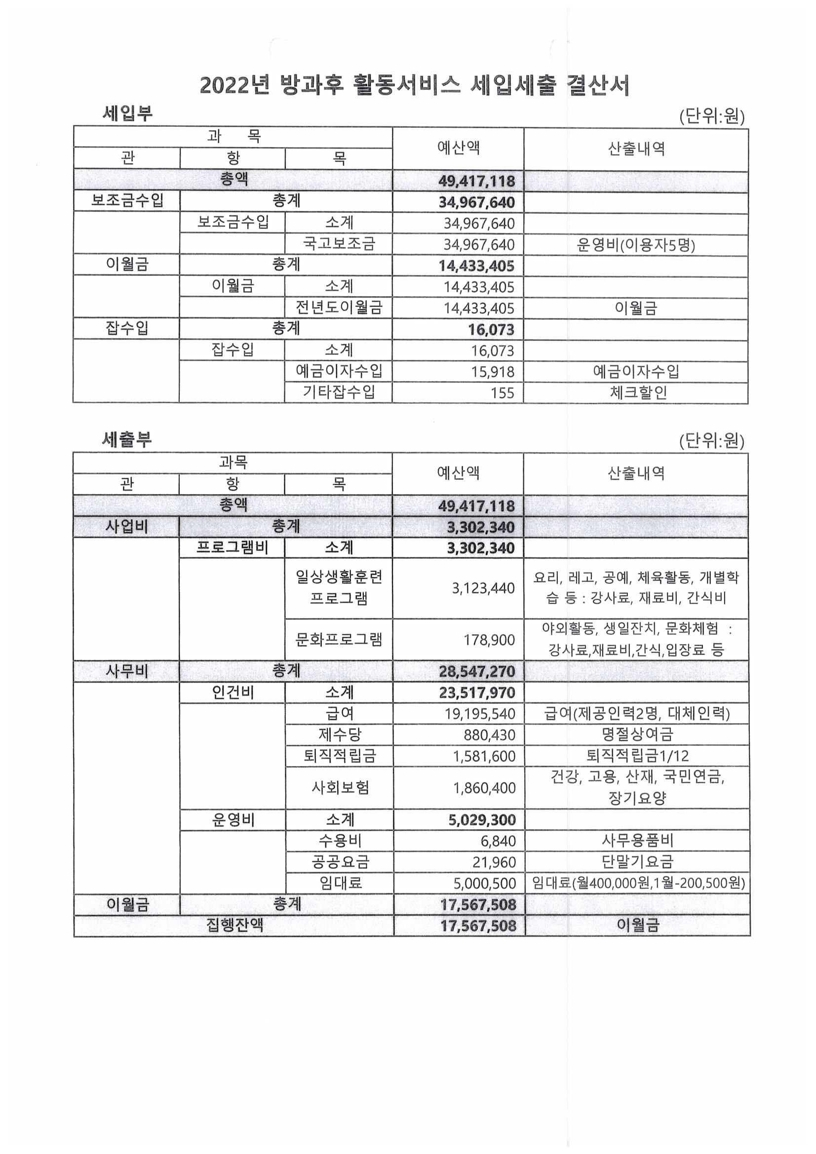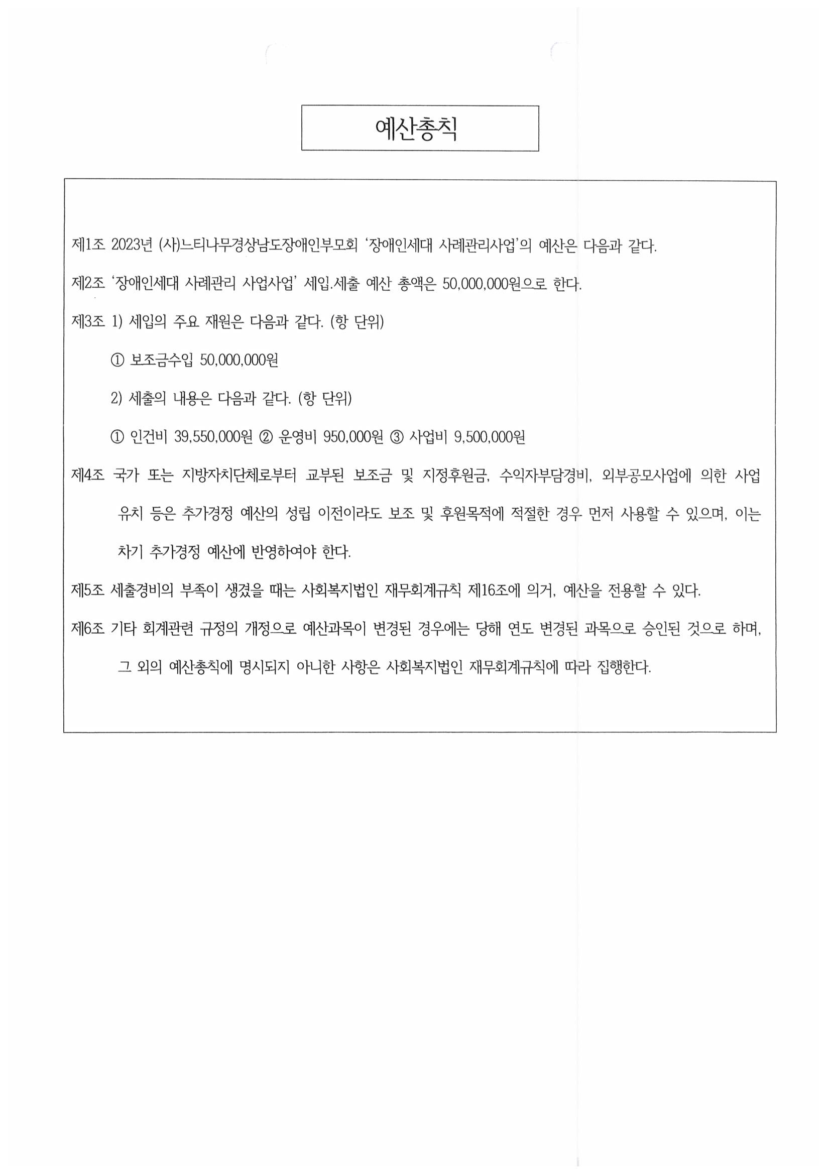 2022년 느티나무장애인부모회 거창군지부 세입·세출 결산서 및 2023년 세입·세출 예산서·예산총칙 작성자느티나무|작성시간25.05.15|조회수50 목록 댓글 0 글자크기 작게가 글자크기 크게가 다음검색 현재 게시글 추가 기능 열기 북마크 공유하기 신고 센터로 신고 댓글 댓글 0 댓글쓰기 답글쓰기 댓글 리스트