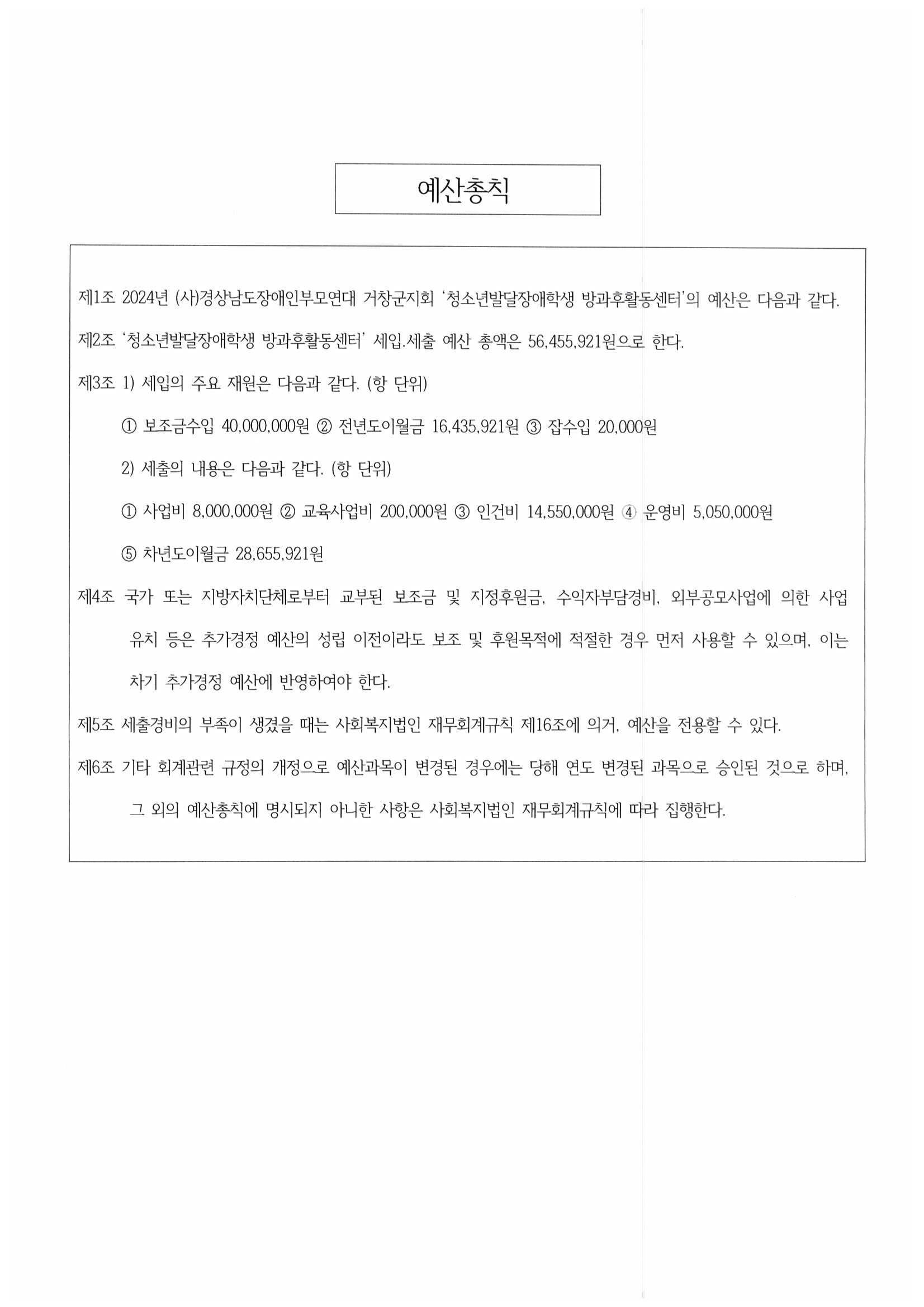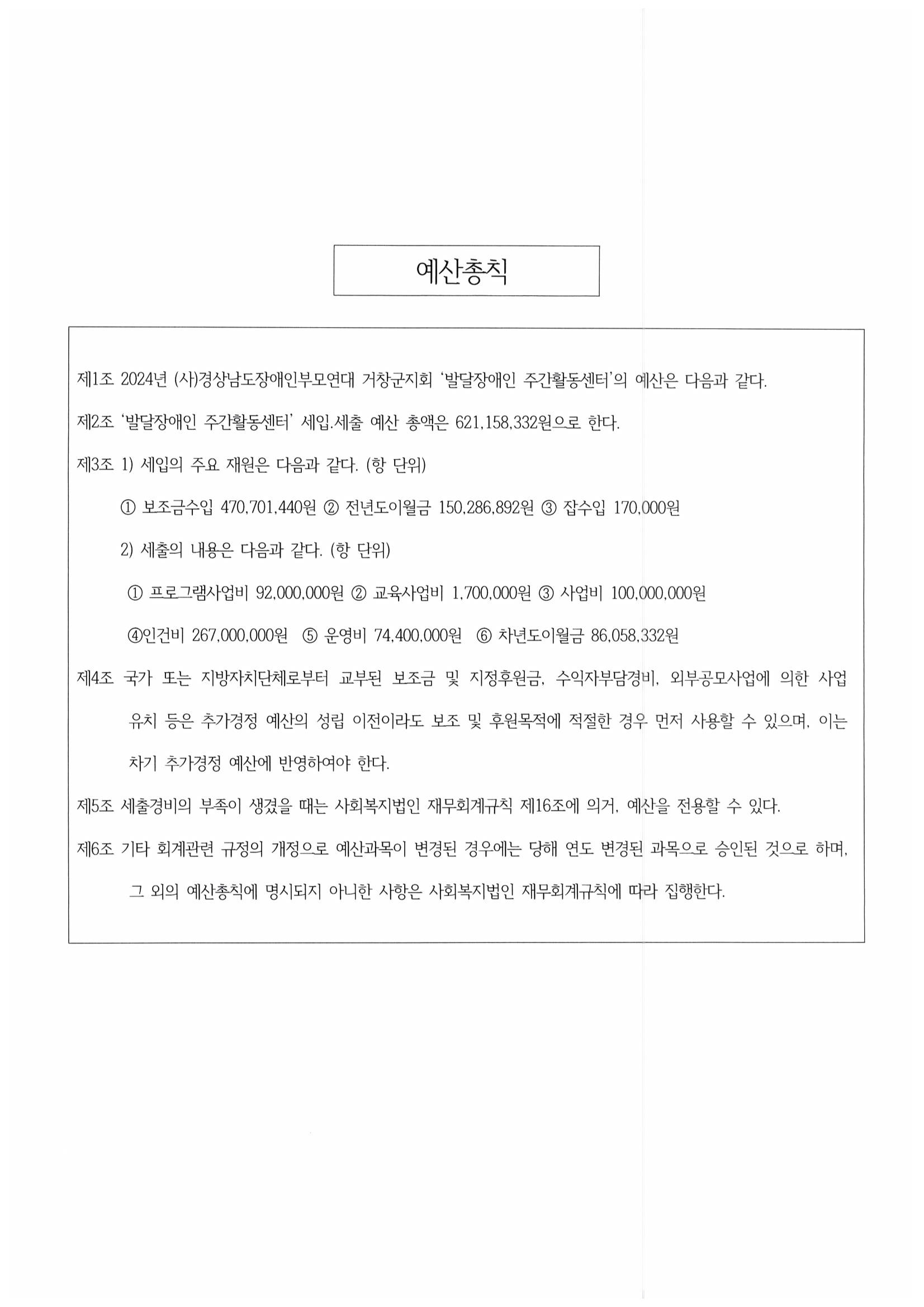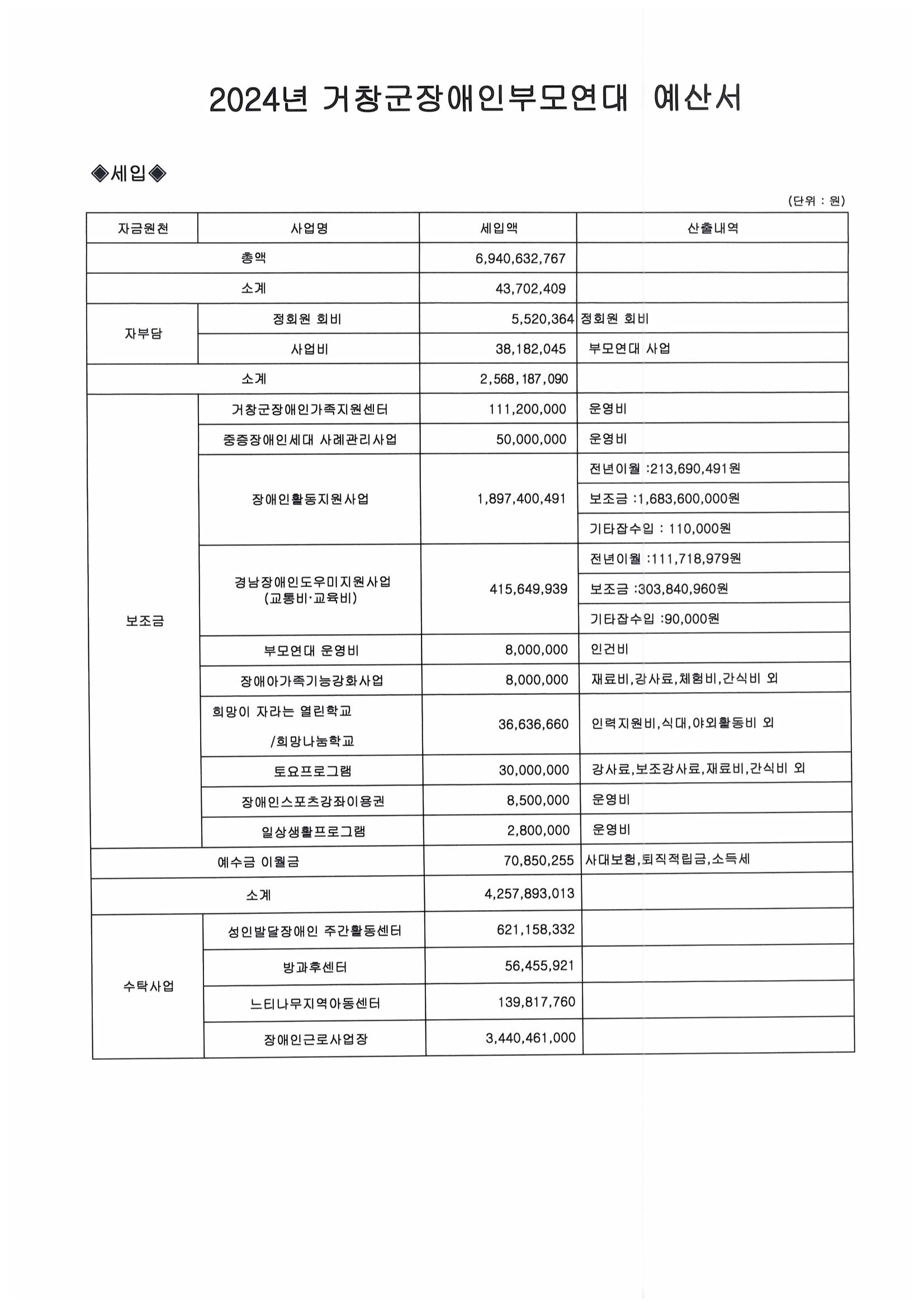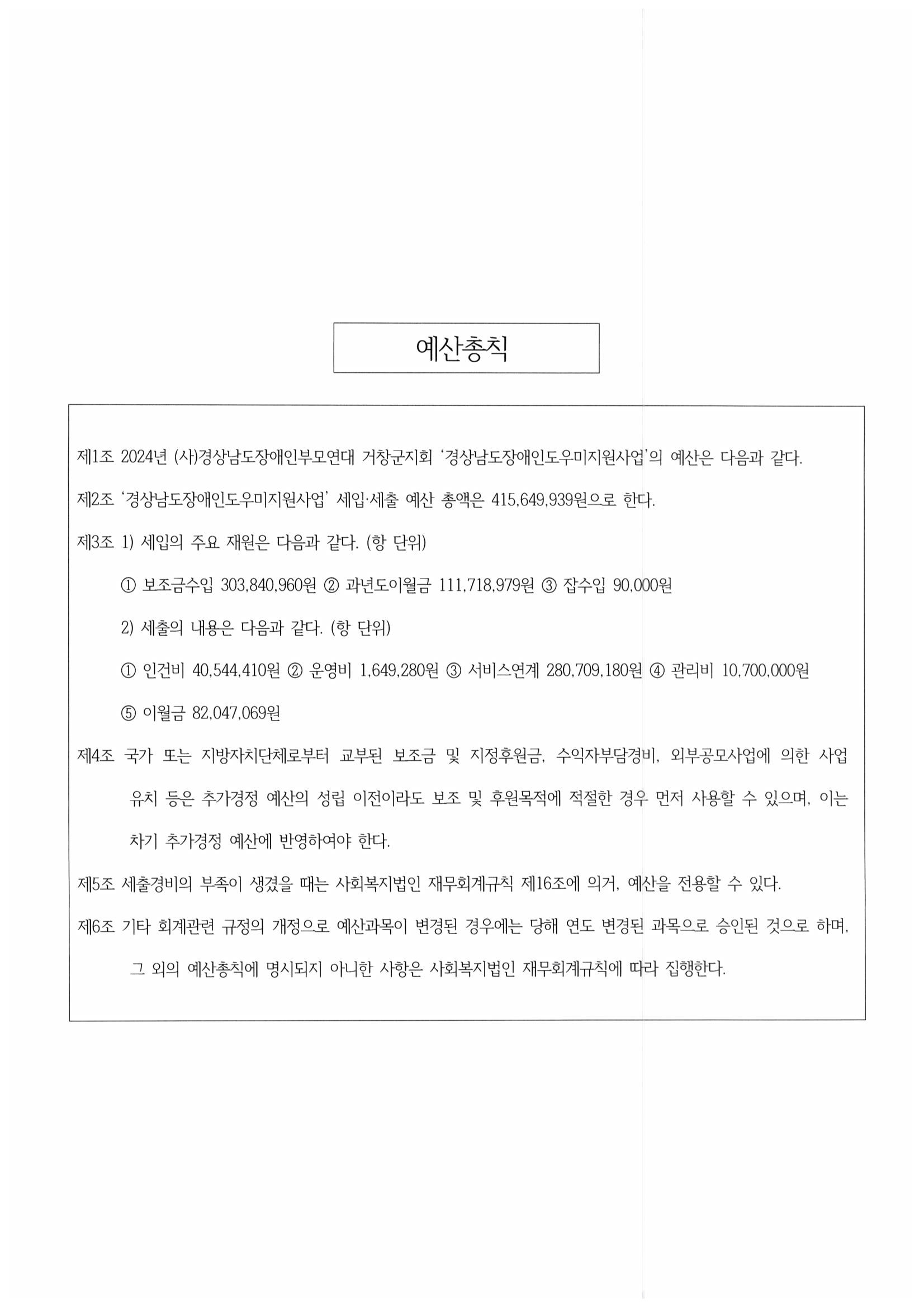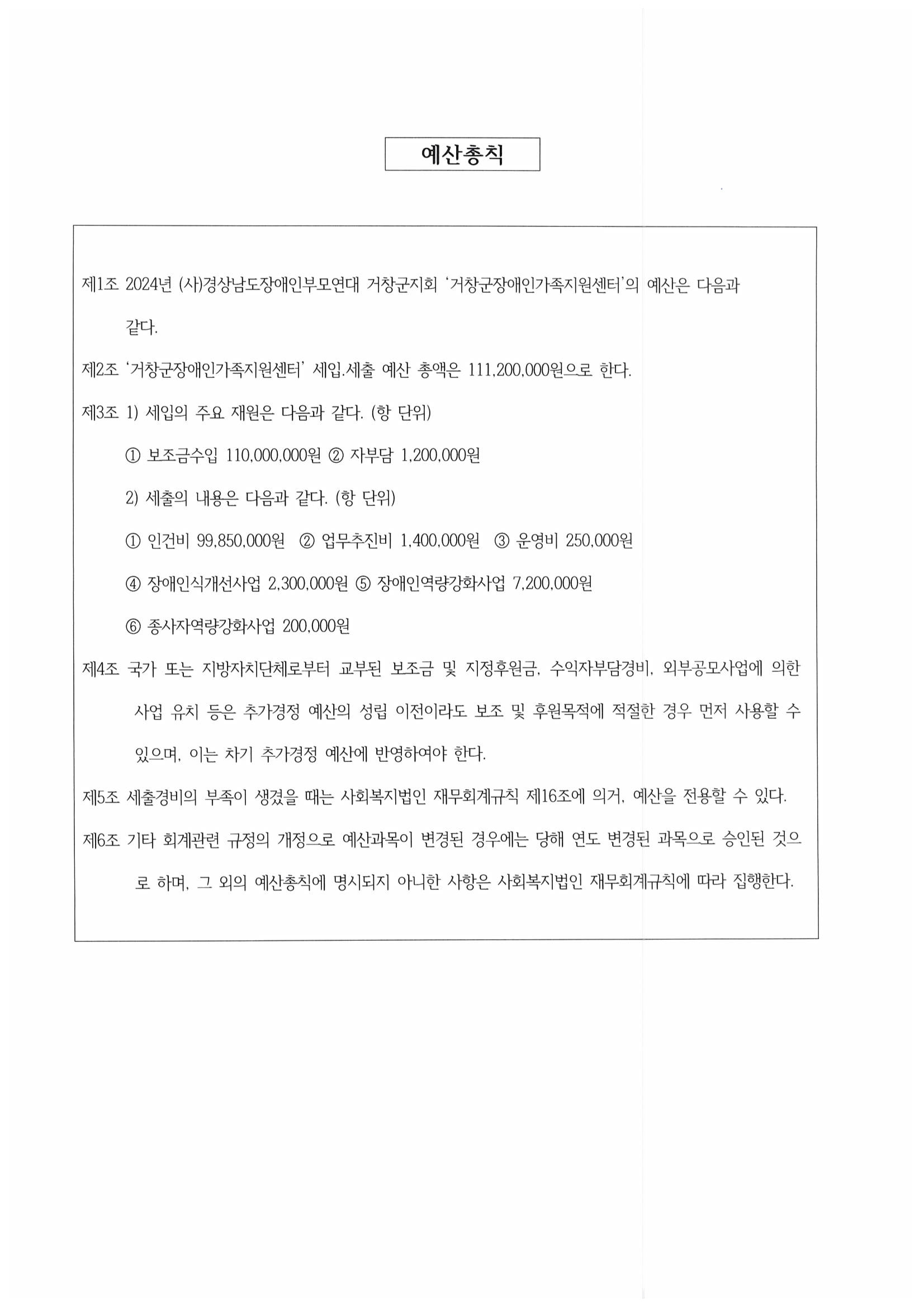 2023년 사단법인 경상남도장애인부모연대 거창군지회 세입·세출 결산서 및 2024년 세입·세출 예산서·예산총칙 작성자느티나무|작성시간25.05.15|조회수9 목록 댓글 0 글자크기 작게가 글자크기 크게가 다음검색 현재 게시글 추가 기능 열기 북마크 공유하기 신고 센터로 신고 댓글 댓글 0 댓글쓰기 답글쓰기 댓글 리스트