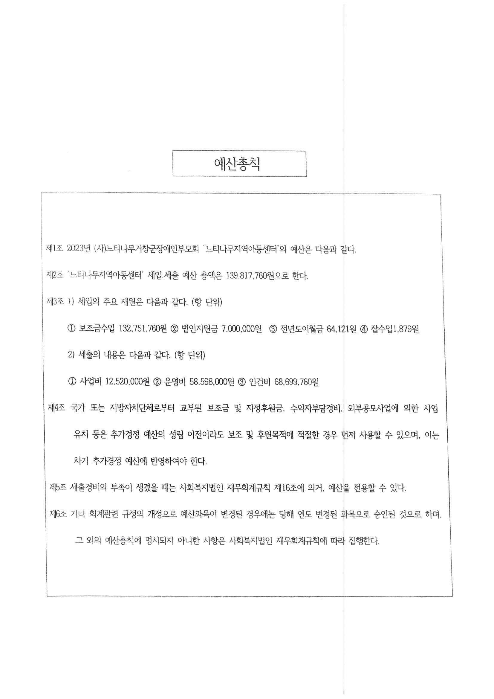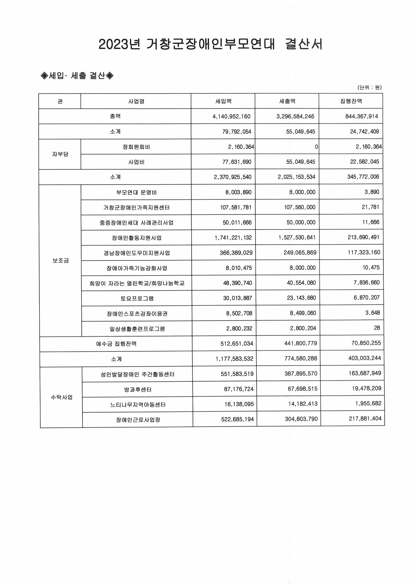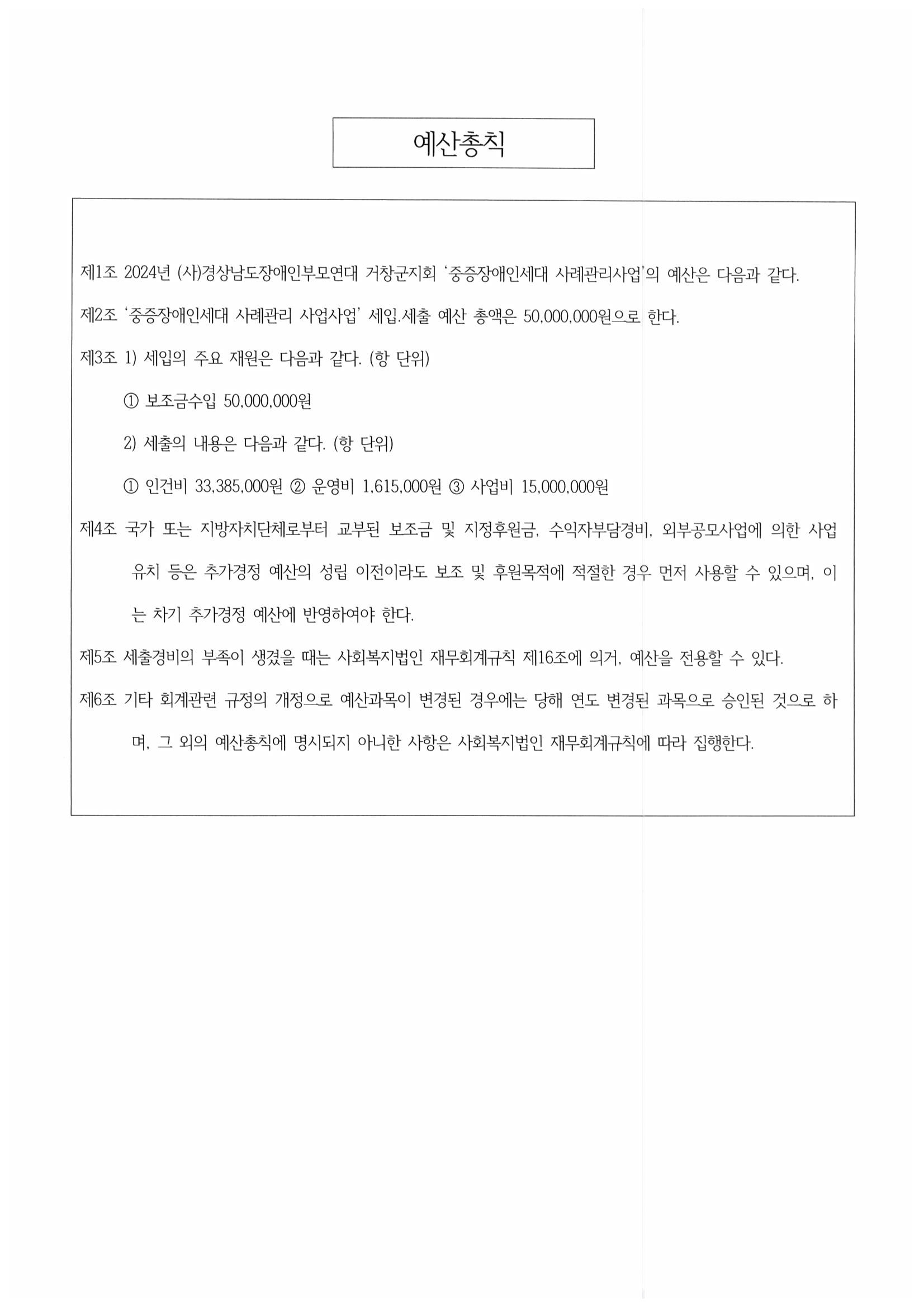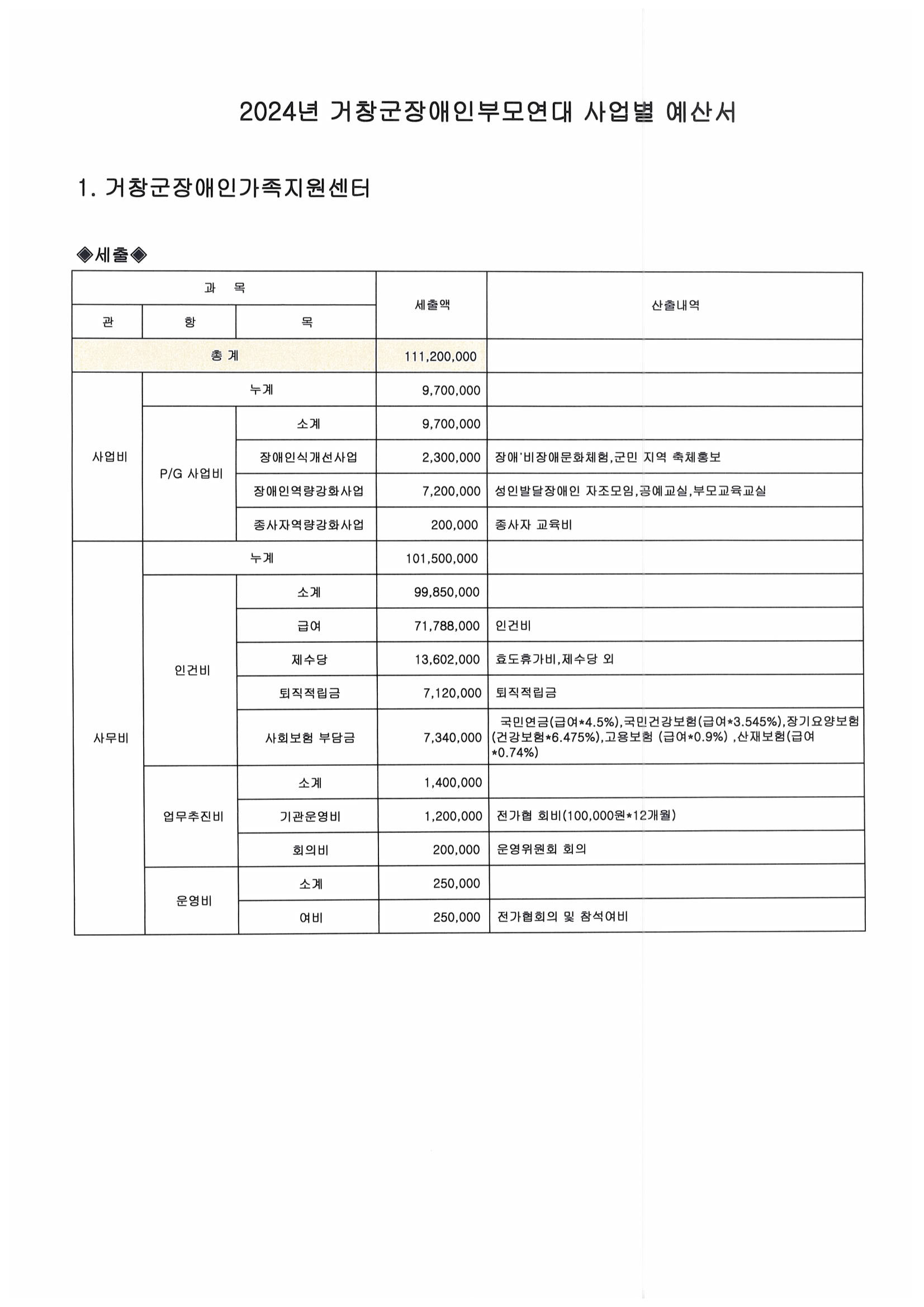 2023년 사단법인 경상남도장애인부모연대 거창군지회 세입·세출 결산서 및 2024년 세입·세출 예산서·예산총칙 작성자느티나무|작성시간25.05.15|조회수9 목록 댓글 0 글자크기 작게가 글자크기 크게가 다음검색 현재 게시글 추가 기능 열기 북마크 공유하기 신고 센터로 신고 댓글 댓글 0 댓글쓰기 답글쓰기 댓글 리스트