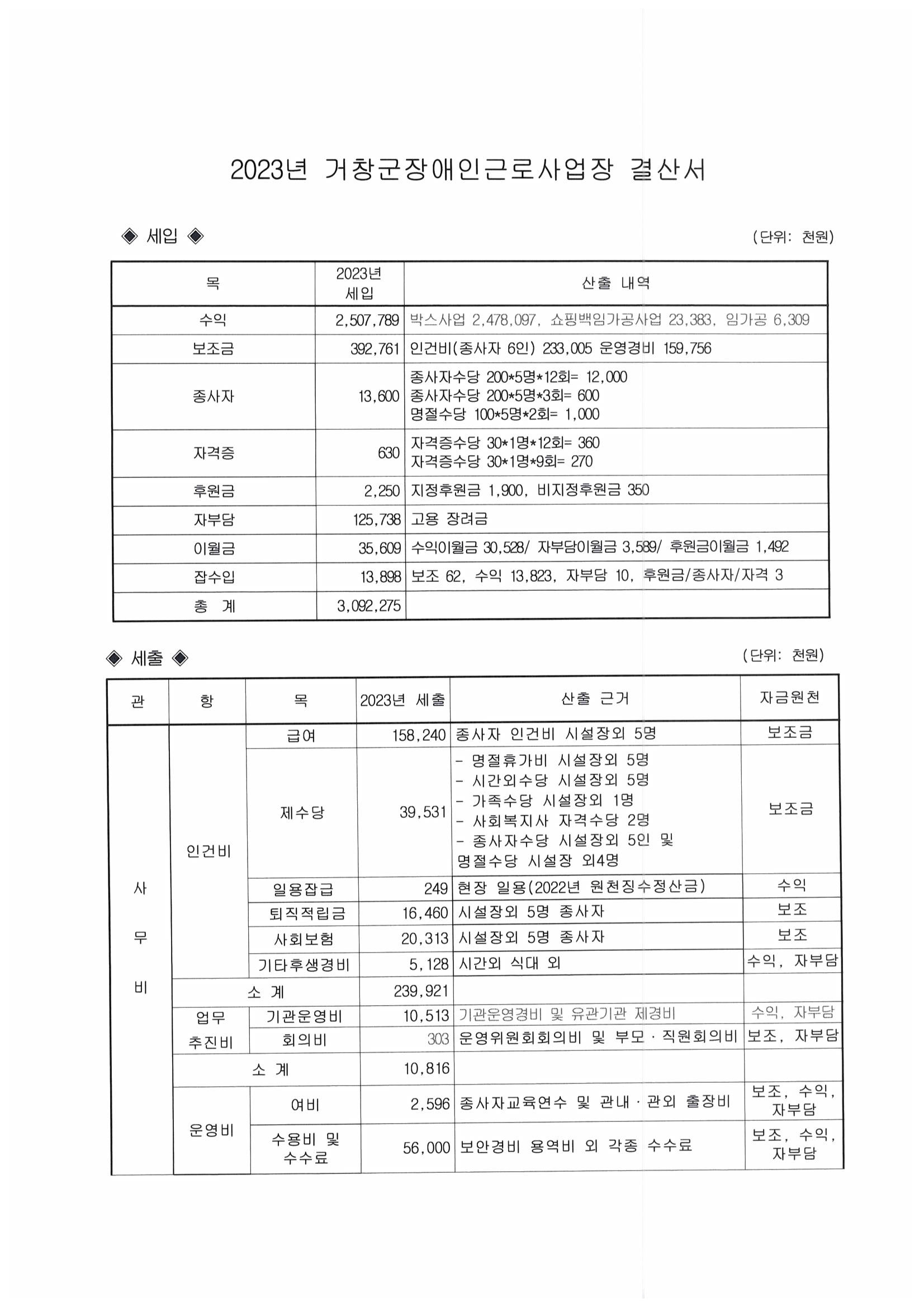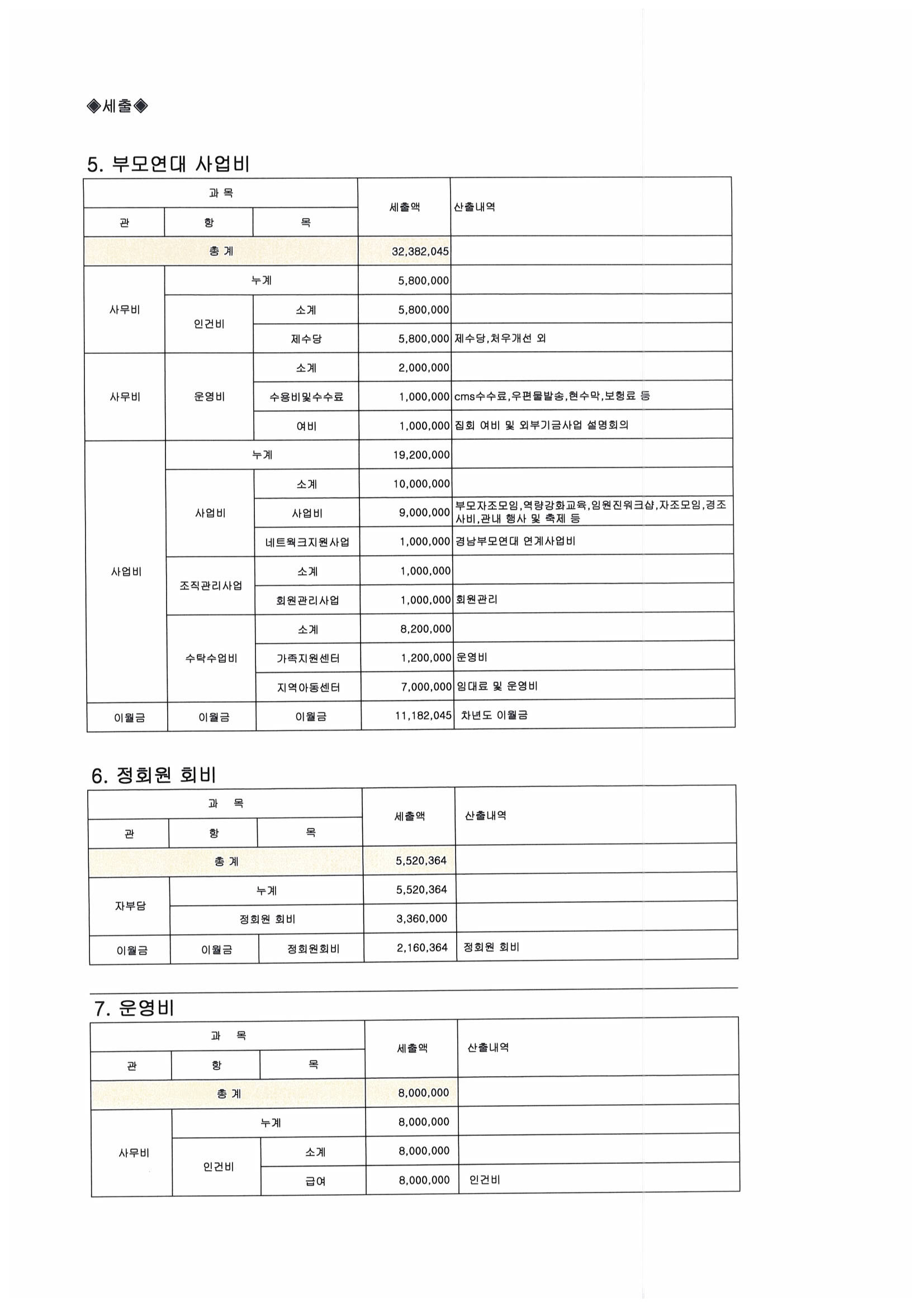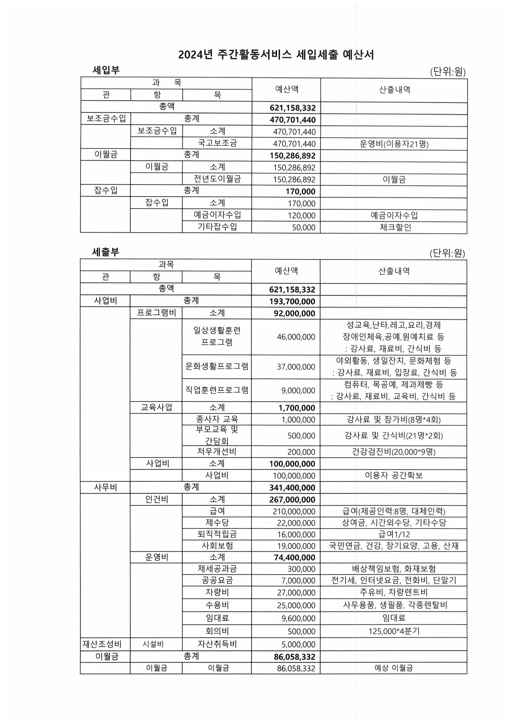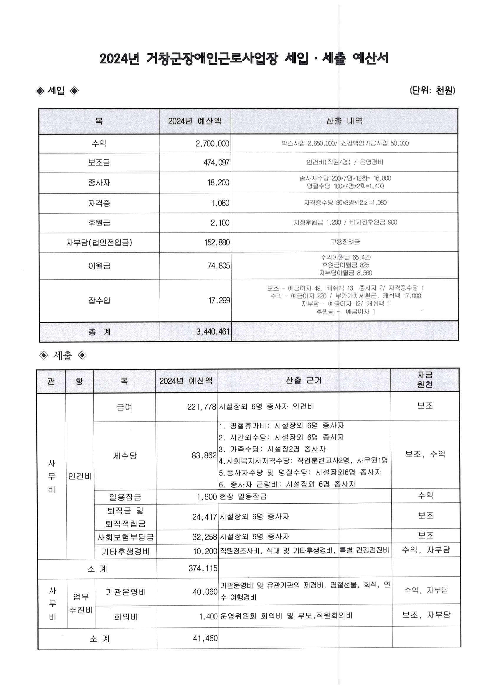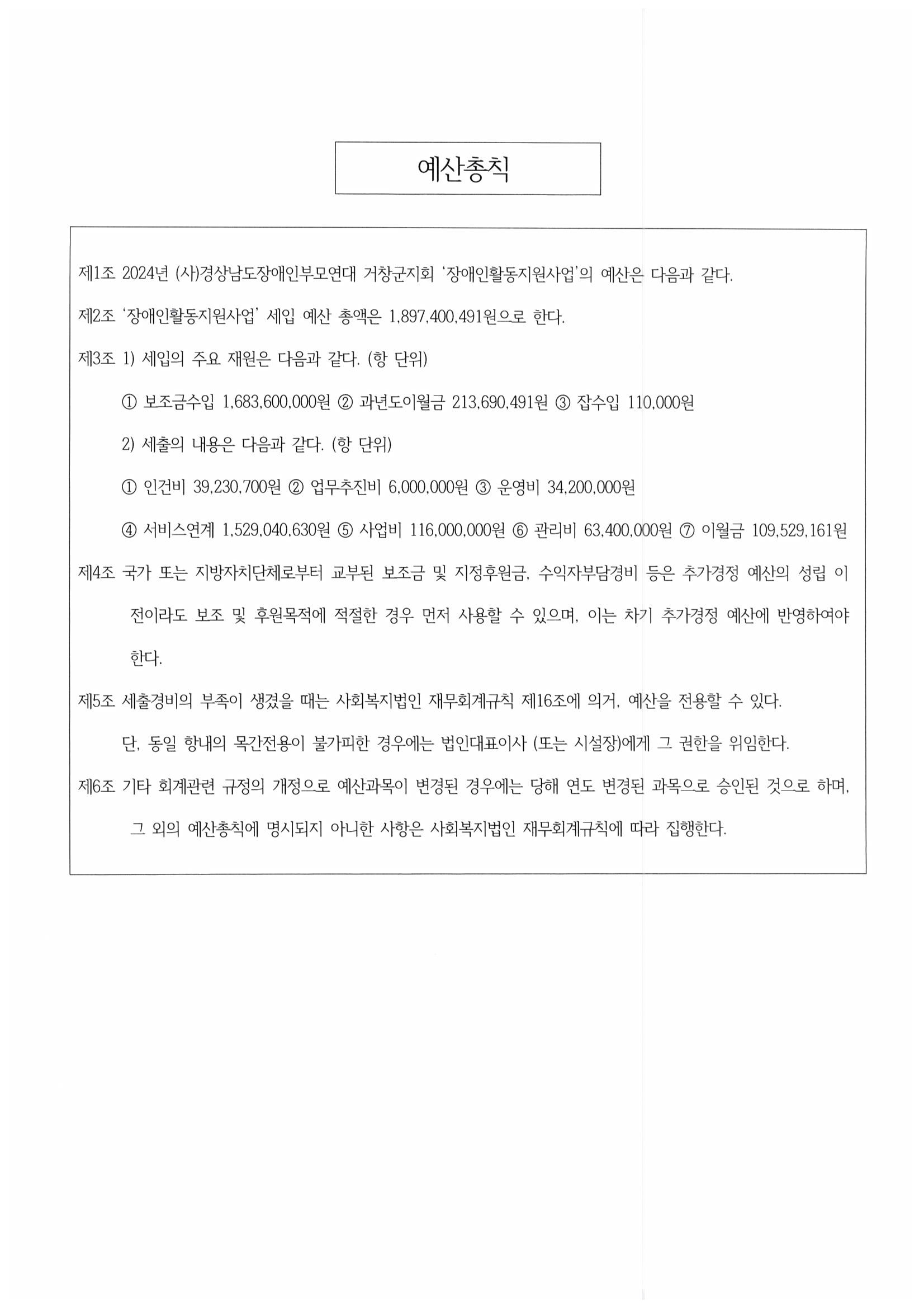 2023년 사단법인 경상남도장애인부모연대 거창군지회 세입·세출 결산서 및 2024년 세입·세출 예산서·예산총칙 작성자느티나무|작성시간25.05.15|조회수9 목록 댓글 0 글자크기 작게가 글자크기 크게가 다음검색 현재 게시글 추가 기능 열기 북마크 공유하기 신고 센터로 신고 댓글 댓글 0 댓글쓰기 답글쓰기 댓글 리스트