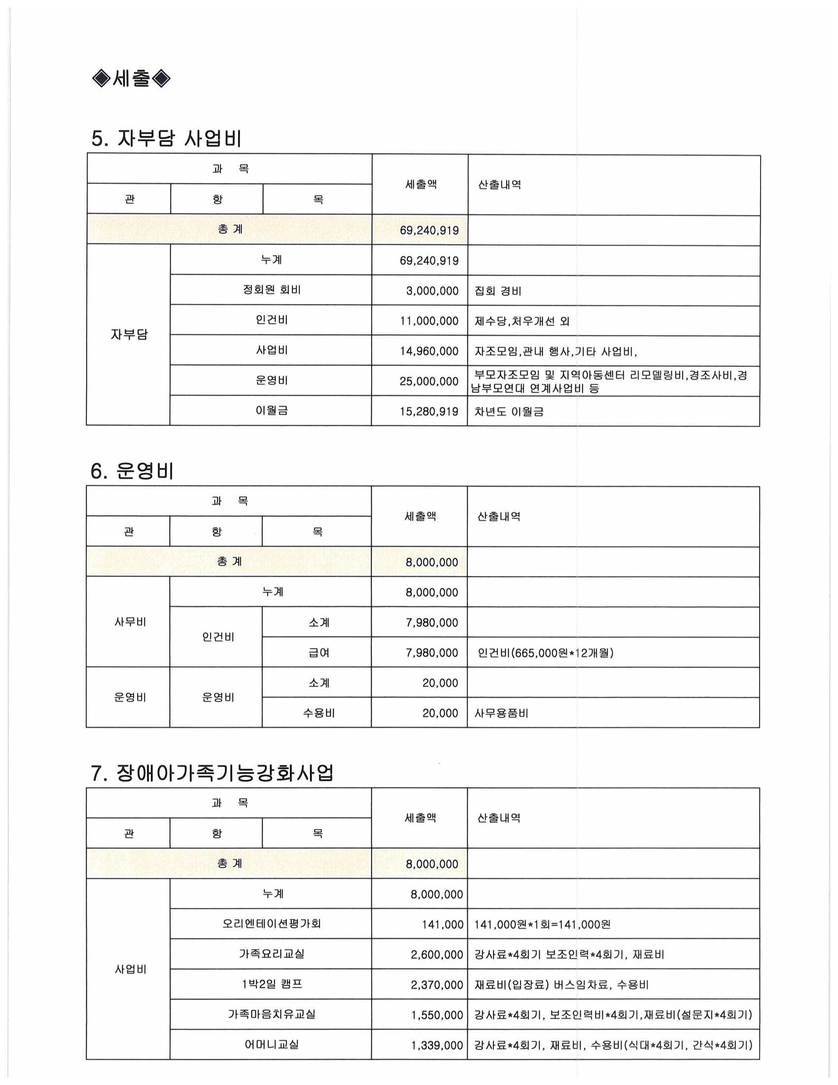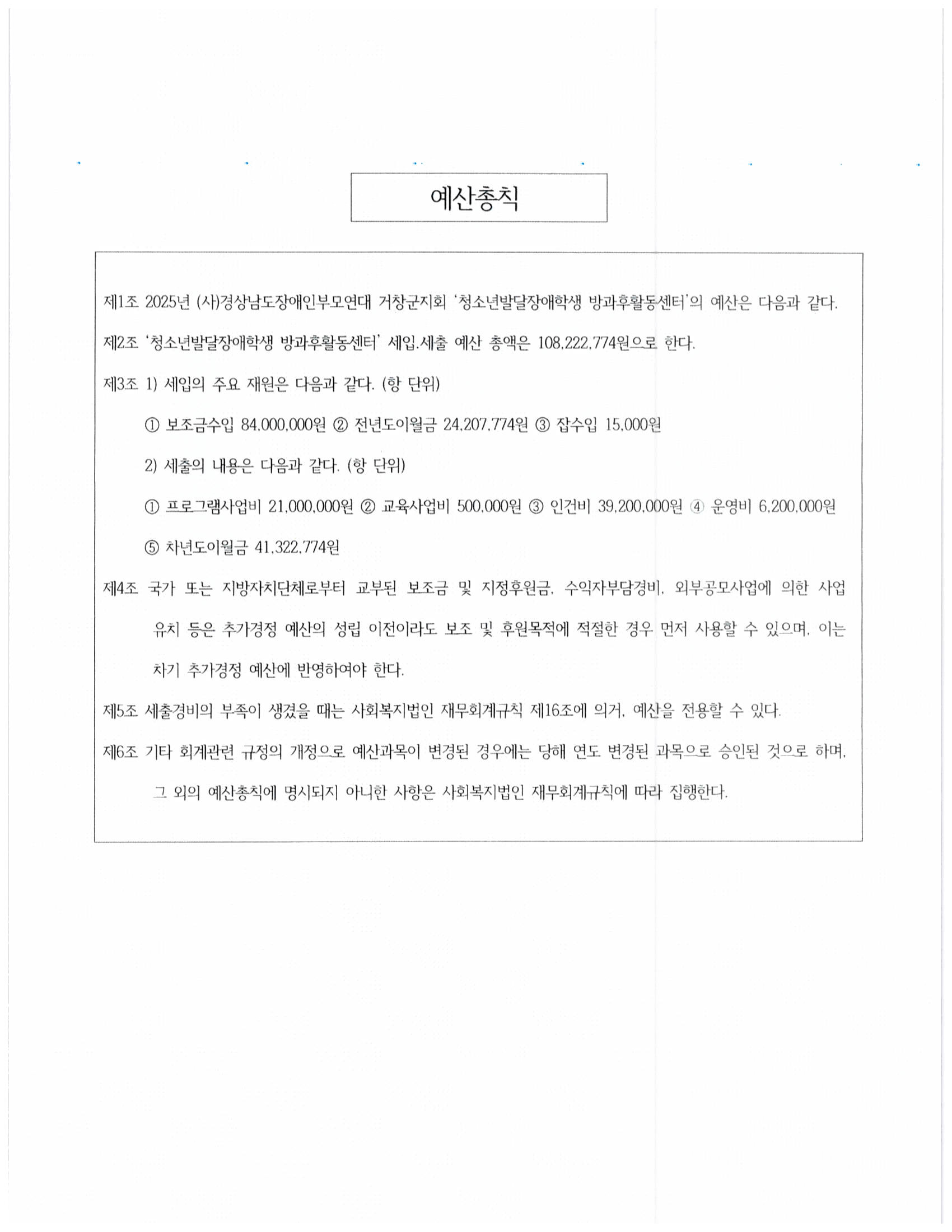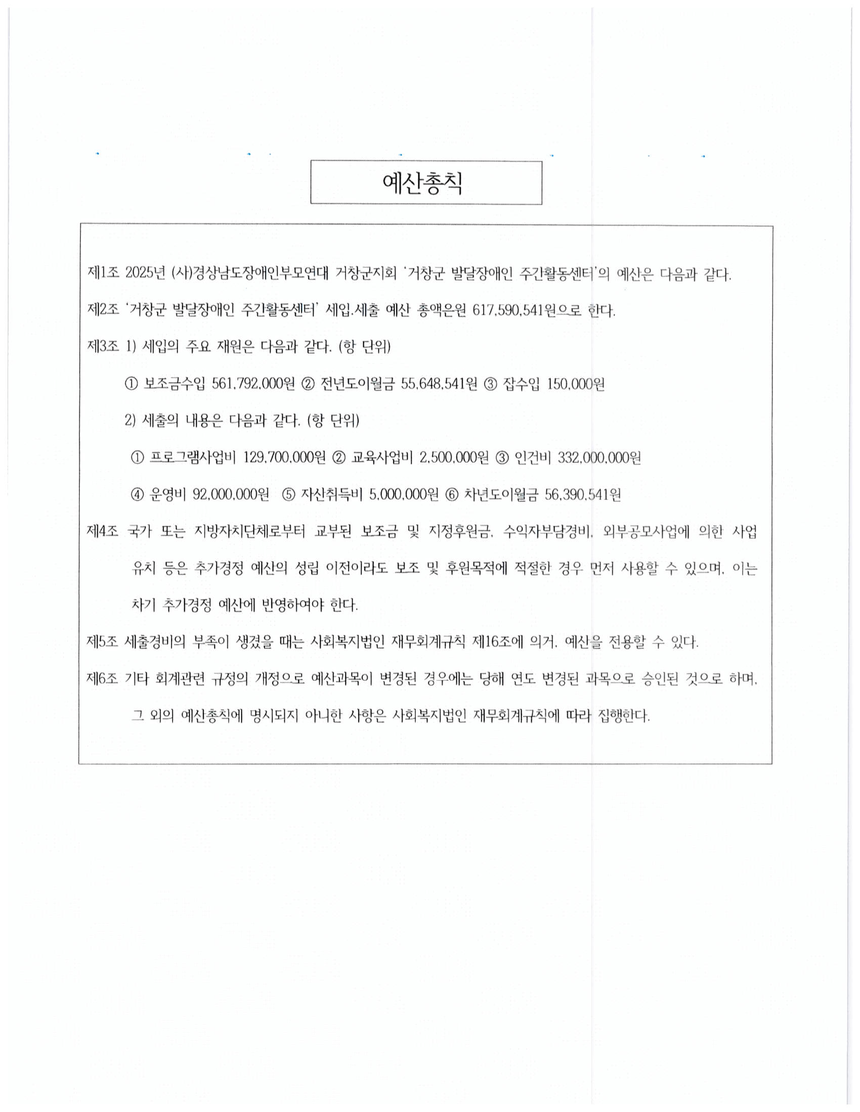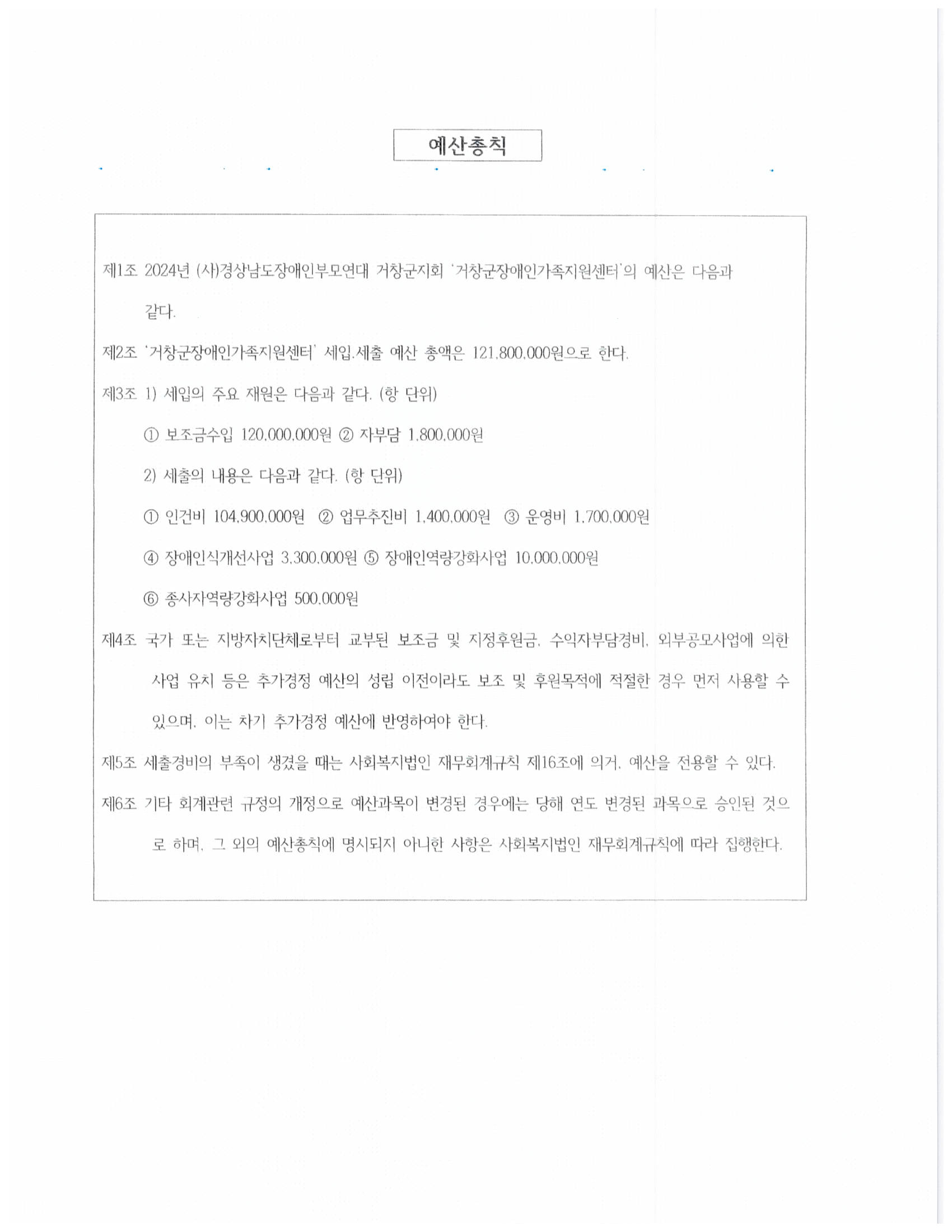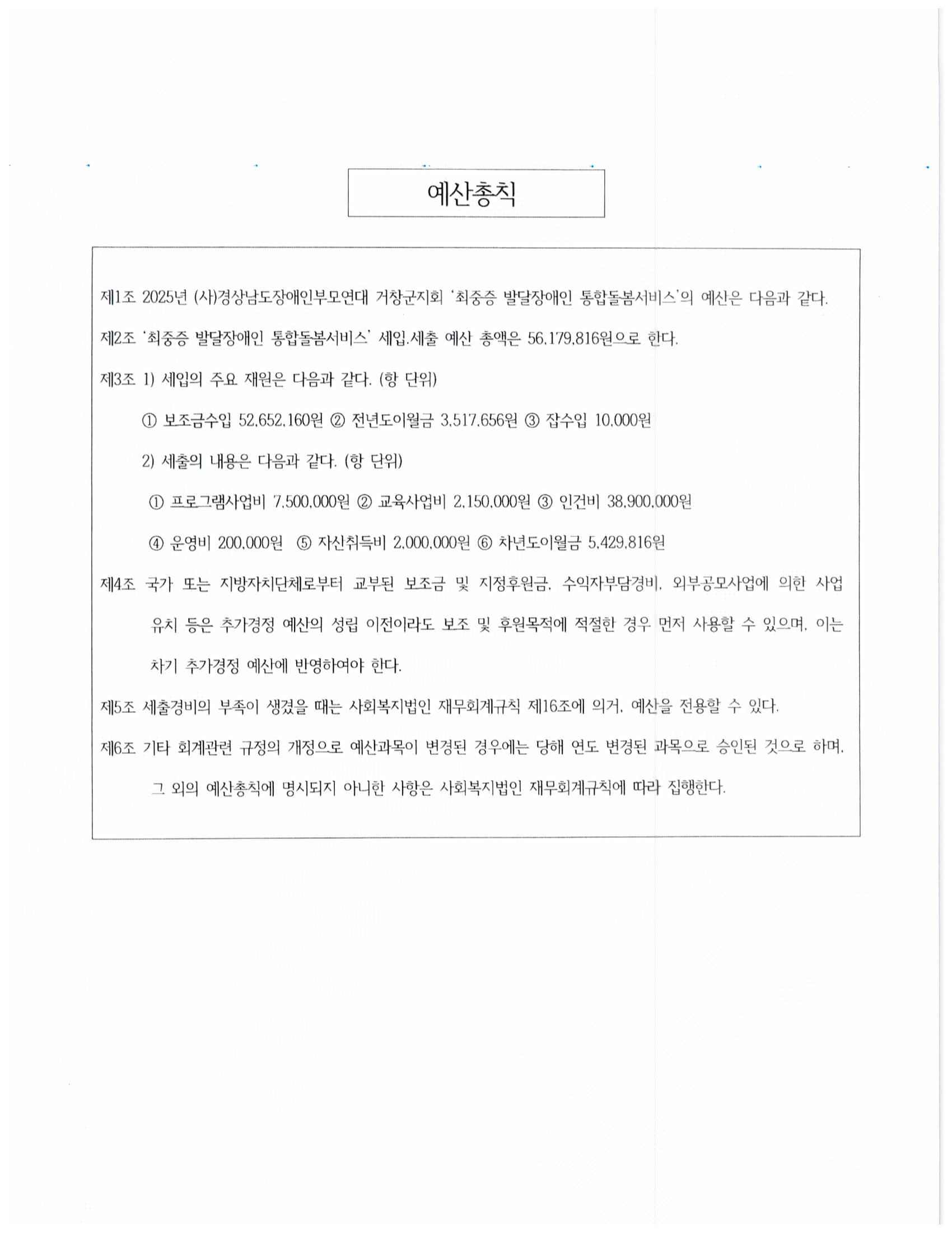 2024년 사단법인 경상남도장애인부모연대 거창군지회 세입·세출 결산서 및 2025년 세입·세출 예산서·예산총칙 작성자느티나무|작성시간25.05.15|조회수27 목록 댓글 0 글자크기 작게가 글자크기 크게가 다음검색 현재 게시글 추가 기능 열기 북마크 공유하기 신고 센터로 신고 댓글 댓글 0 댓글쓰기 답글쓰기 댓글 리스트