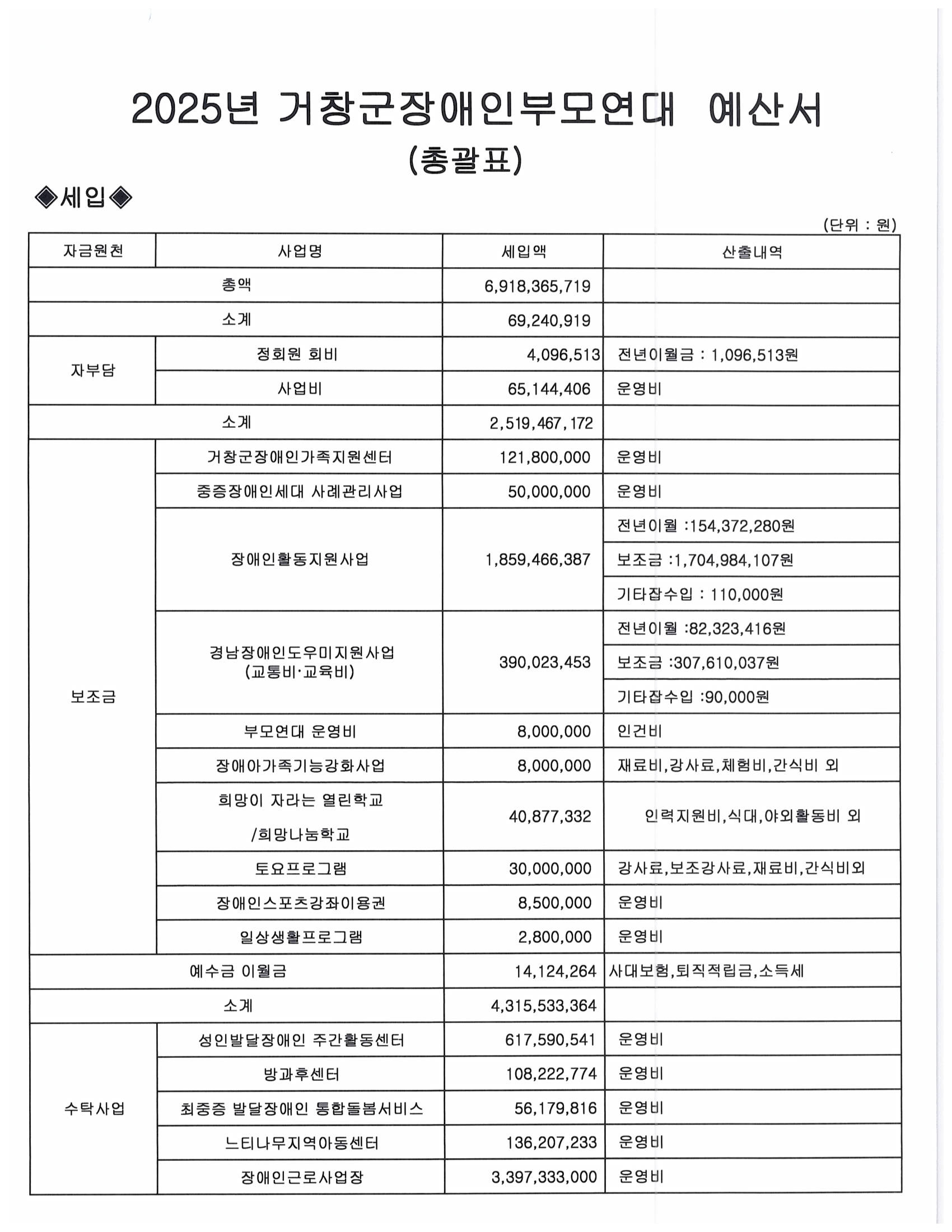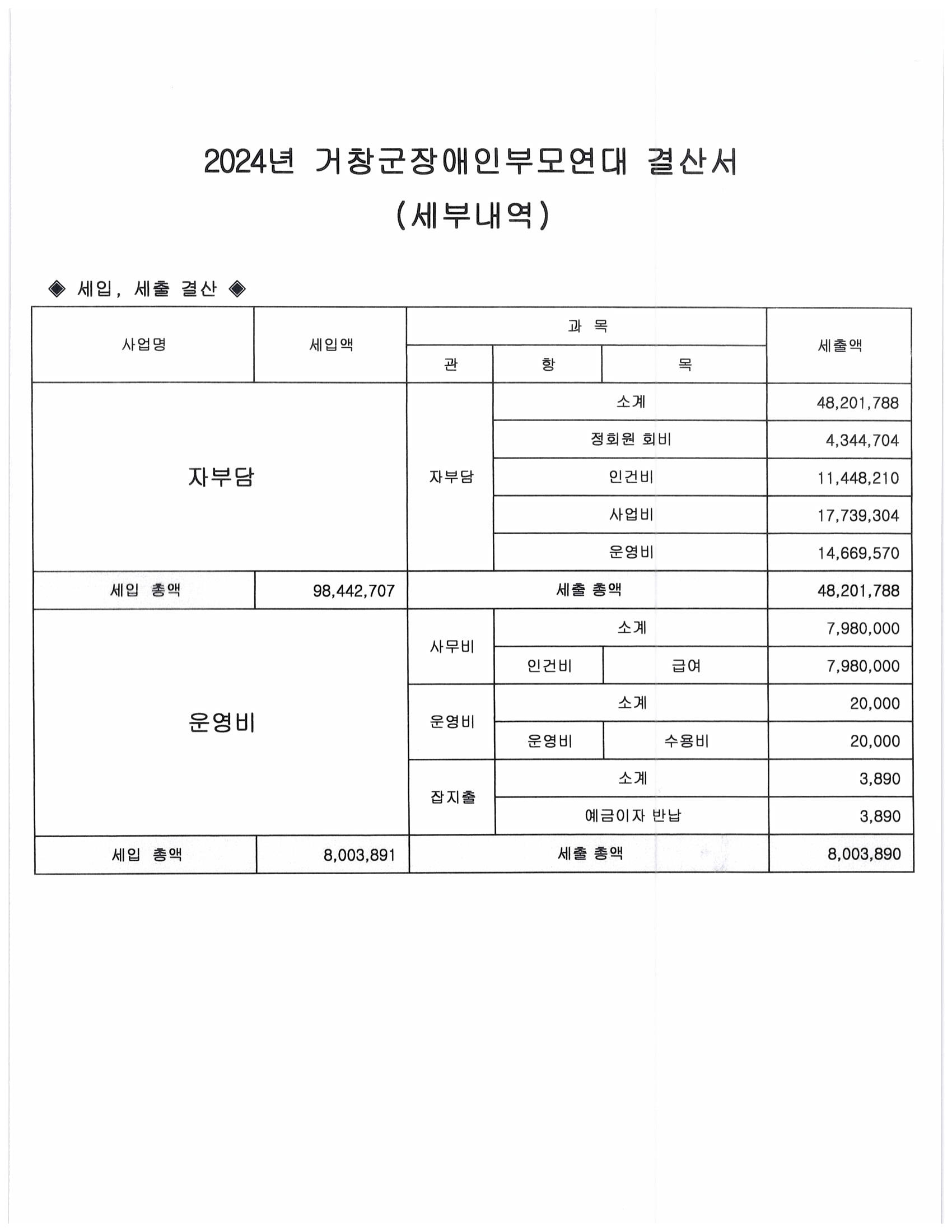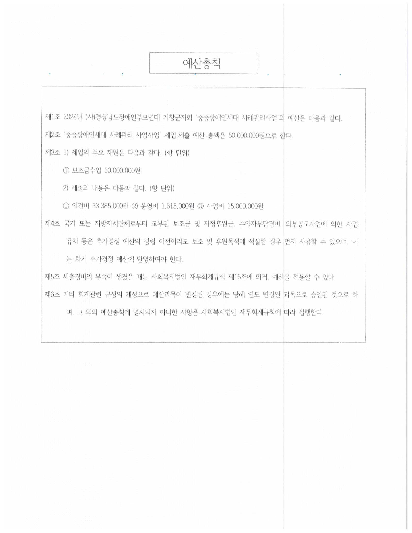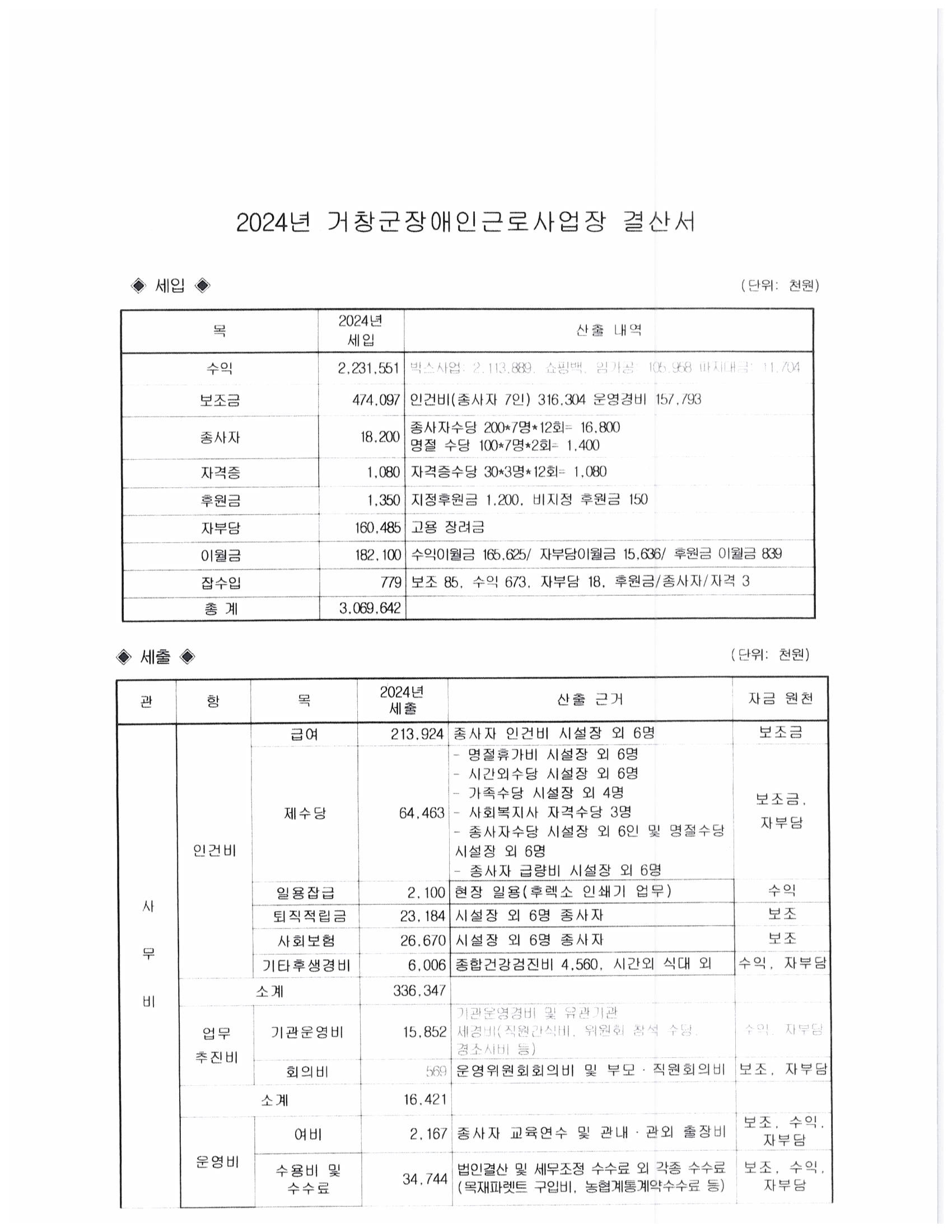 2024년 사단법인 경상남도장애인부모연대 거창군지회 세입·세출 결산서 및 2025년 세입·세출 예산서·예산총칙 작성자느티나무|작성시간25.05.15|조회수27 목록 댓글 0 글자크기 작게가 글자크기 크게가 다음검색 현재 게시글 추가 기능 열기 북마크 공유하기 신고 센터로 신고 댓글 댓글 0 댓글쓰기 답글쓰기 댓글 리스트