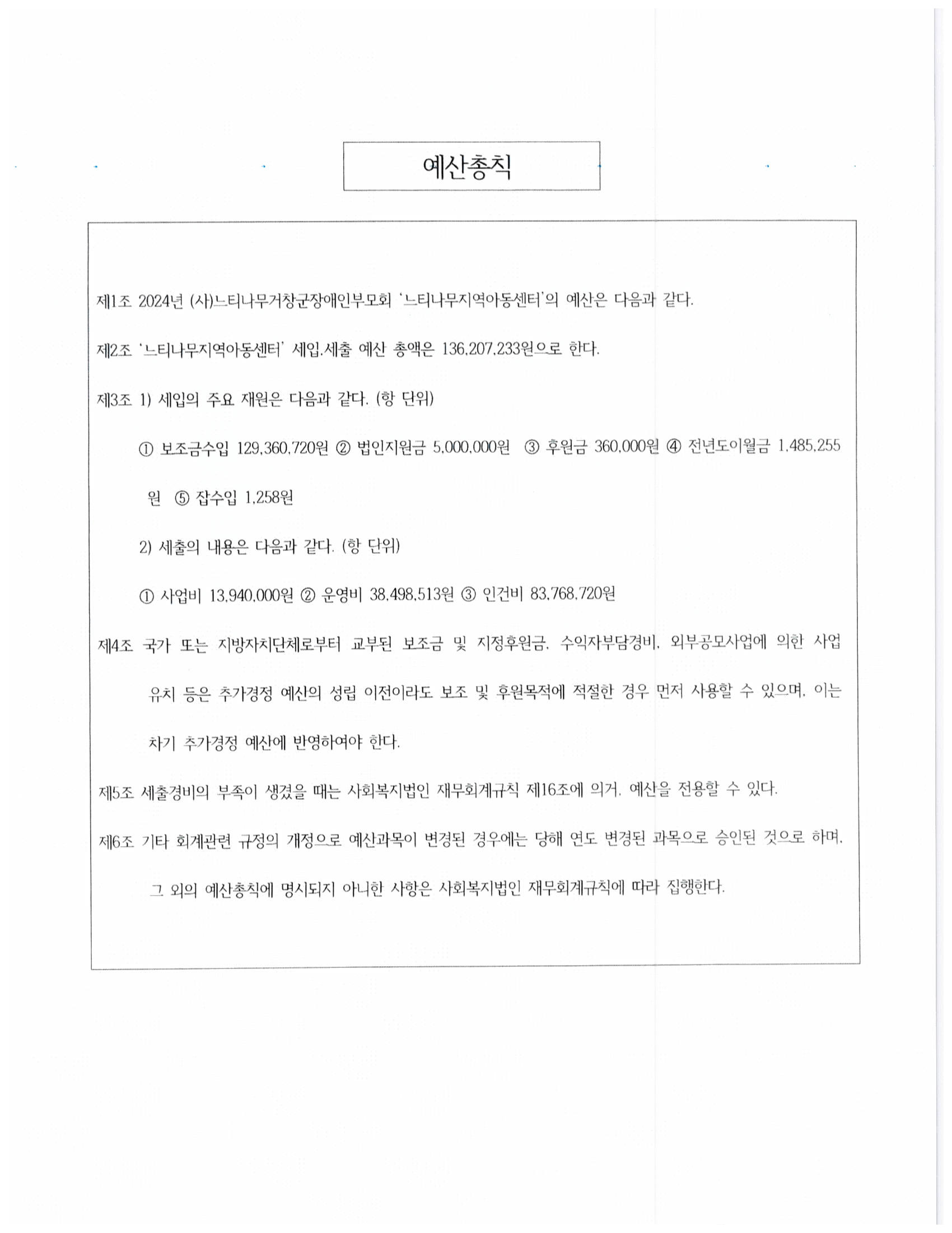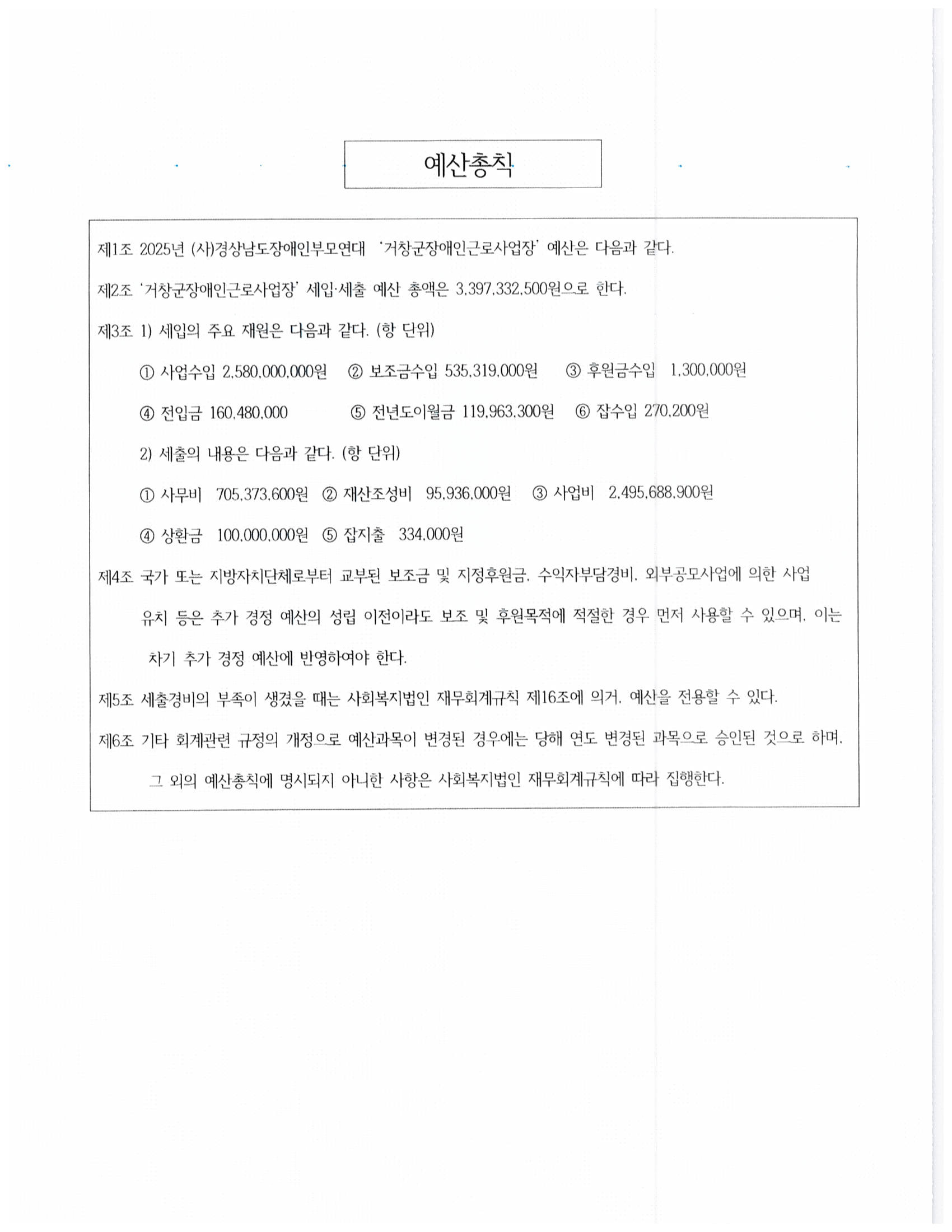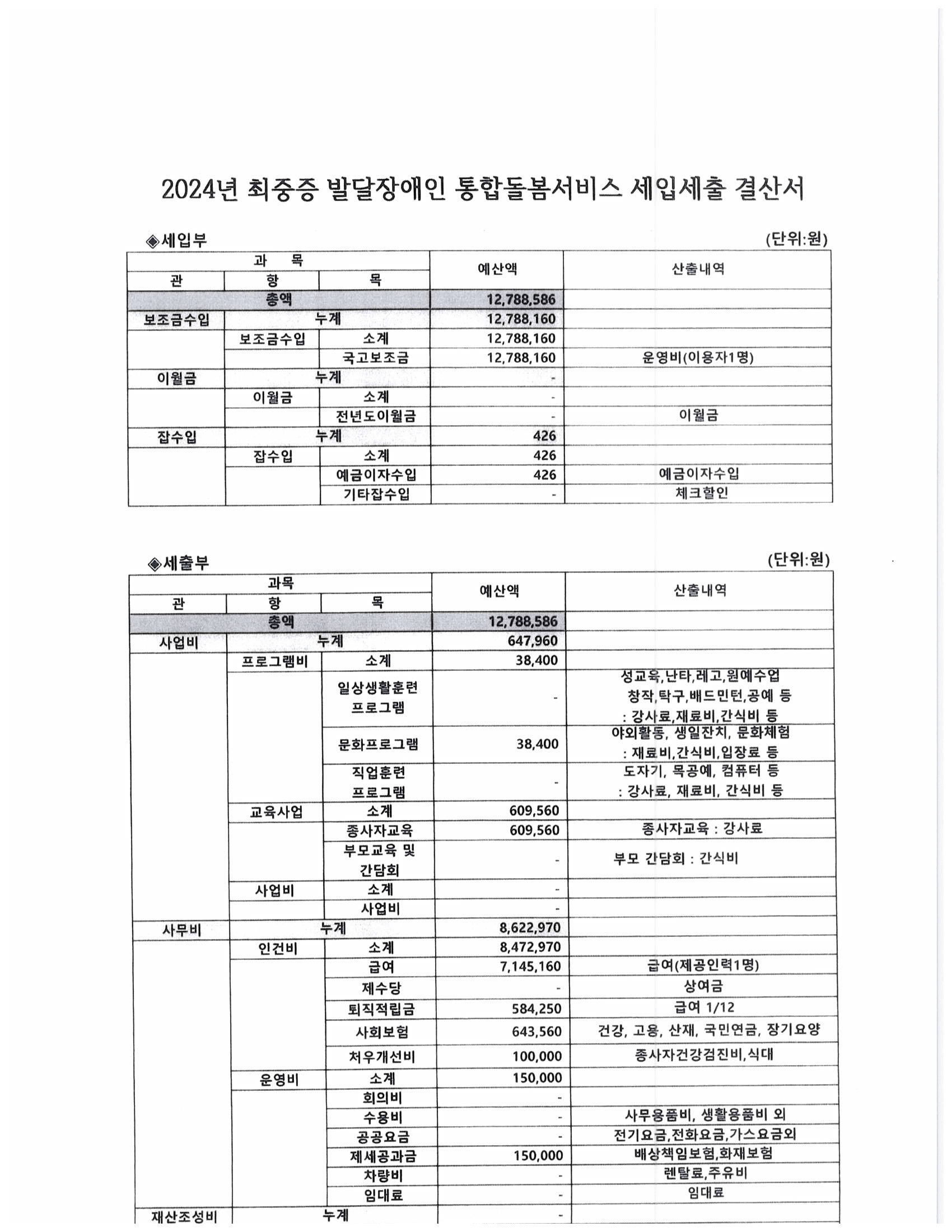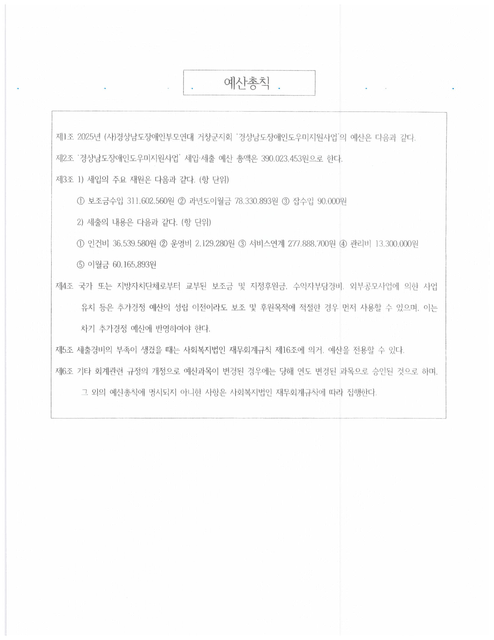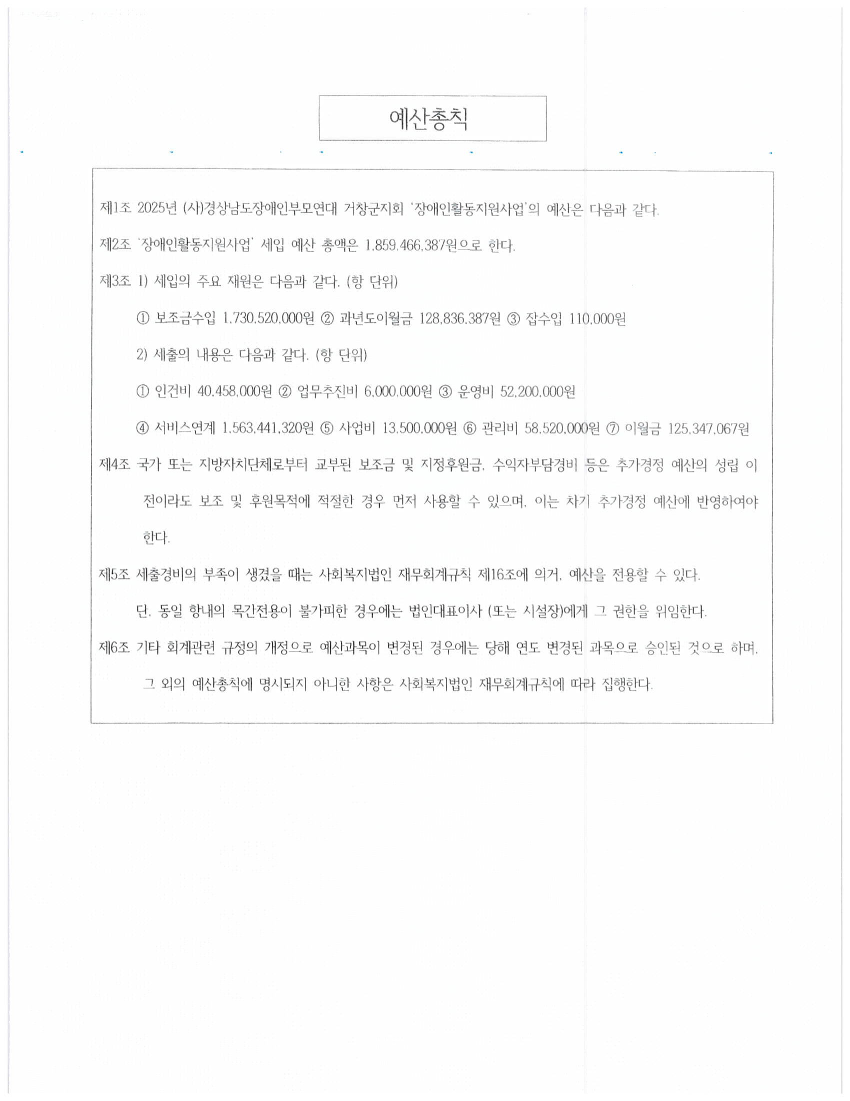 2024년 사단법인 경상남도장애인부모연대 거창군지회 세입·세출 결산서 및 2025년 세입·세출 예산서·예산총칙 작성자느티나무|작성시간25.05.15|조회수27 목록 댓글 0 글자크기 작게가 글자크기 크게가 다음검색 현재 게시글 추가 기능 열기 북마크 공유하기 신고 센터로 신고 댓글 댓글 0 댓글쓰기 답글쓰기 댓글 리스트