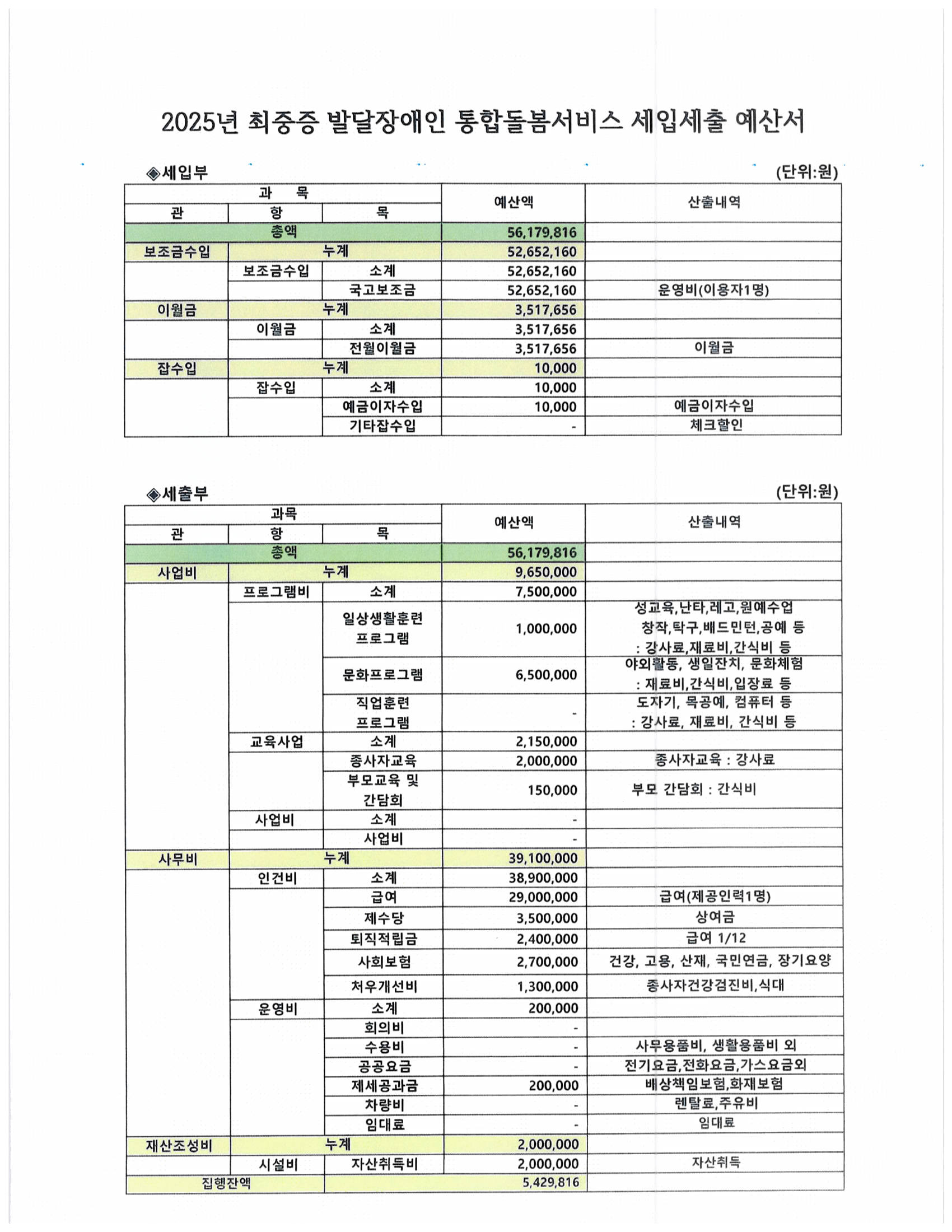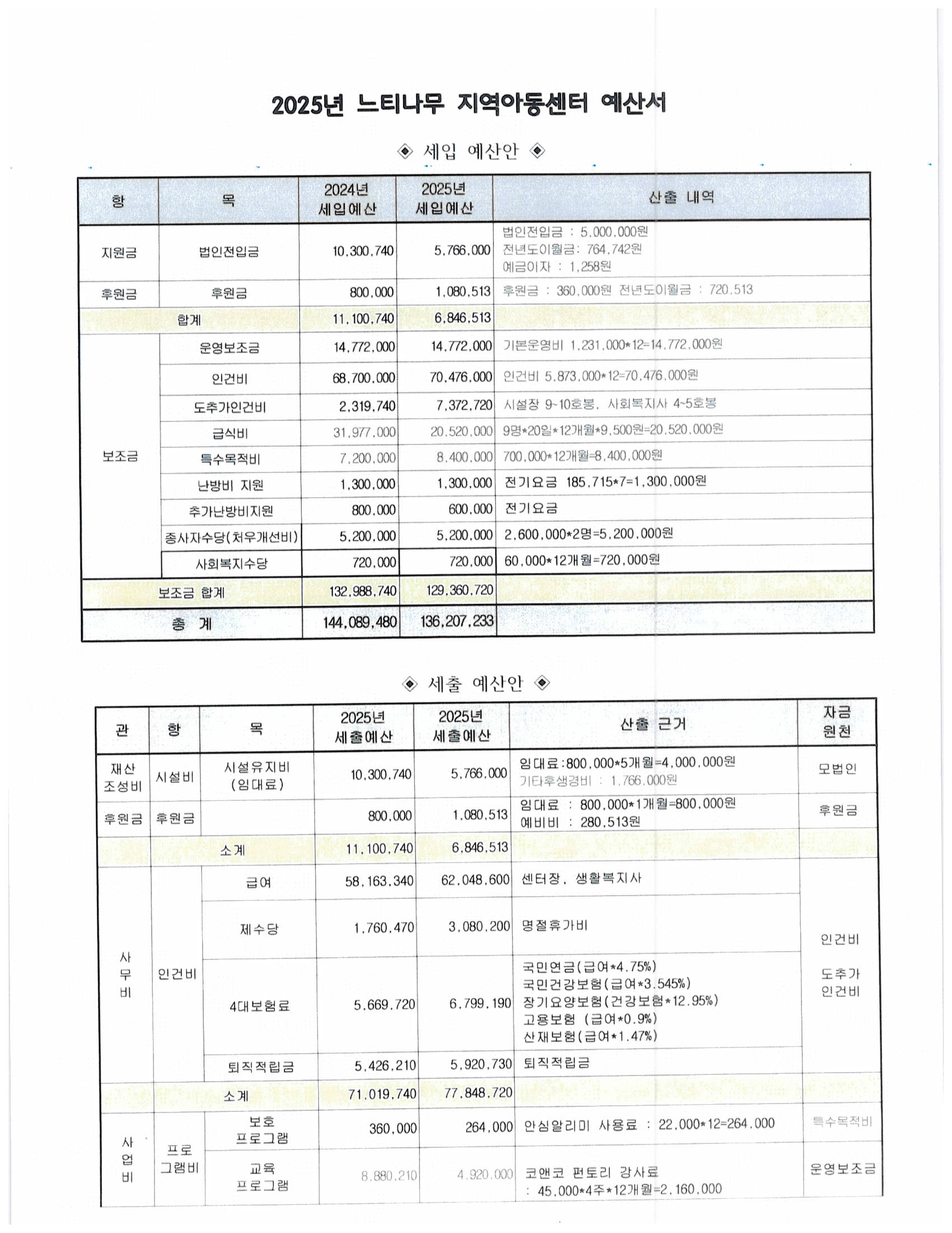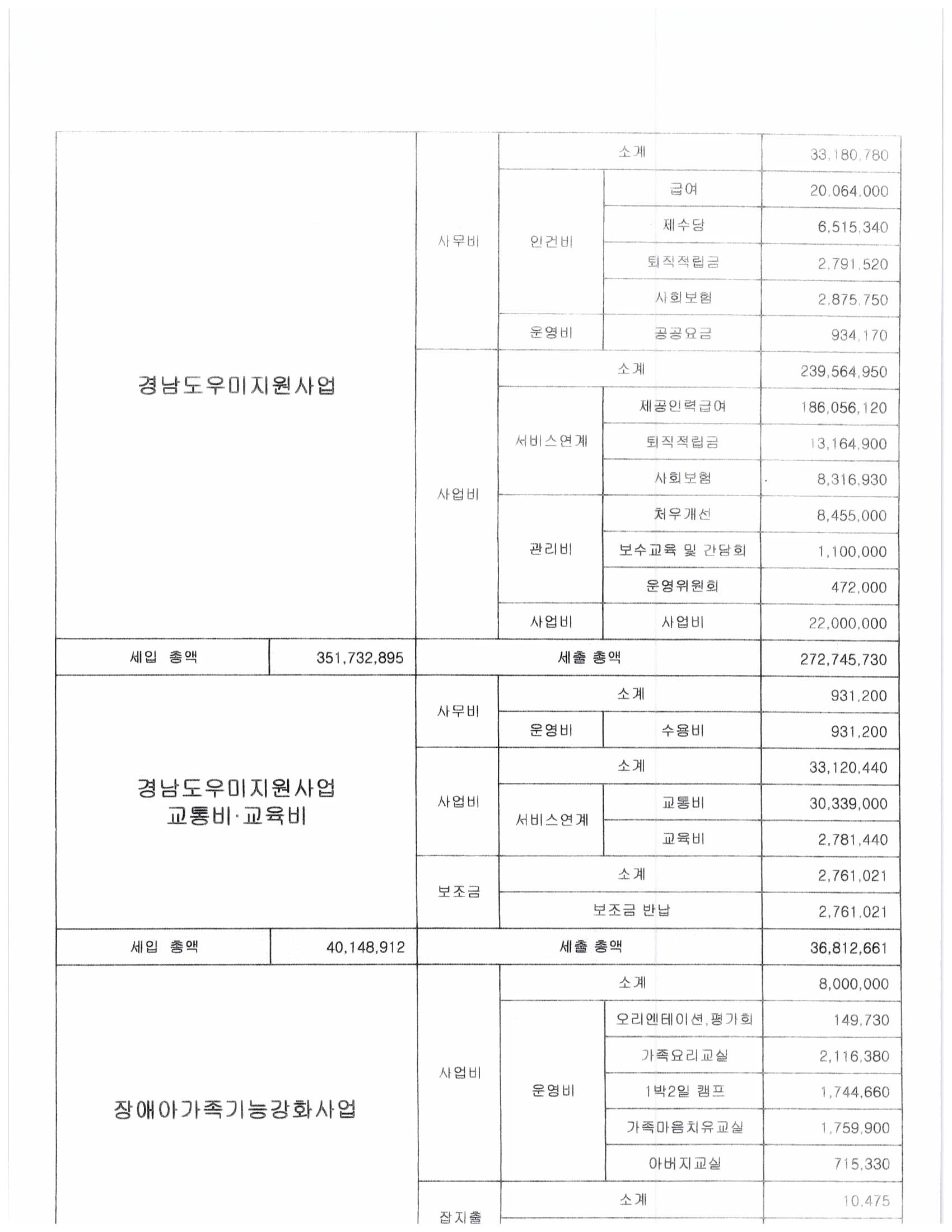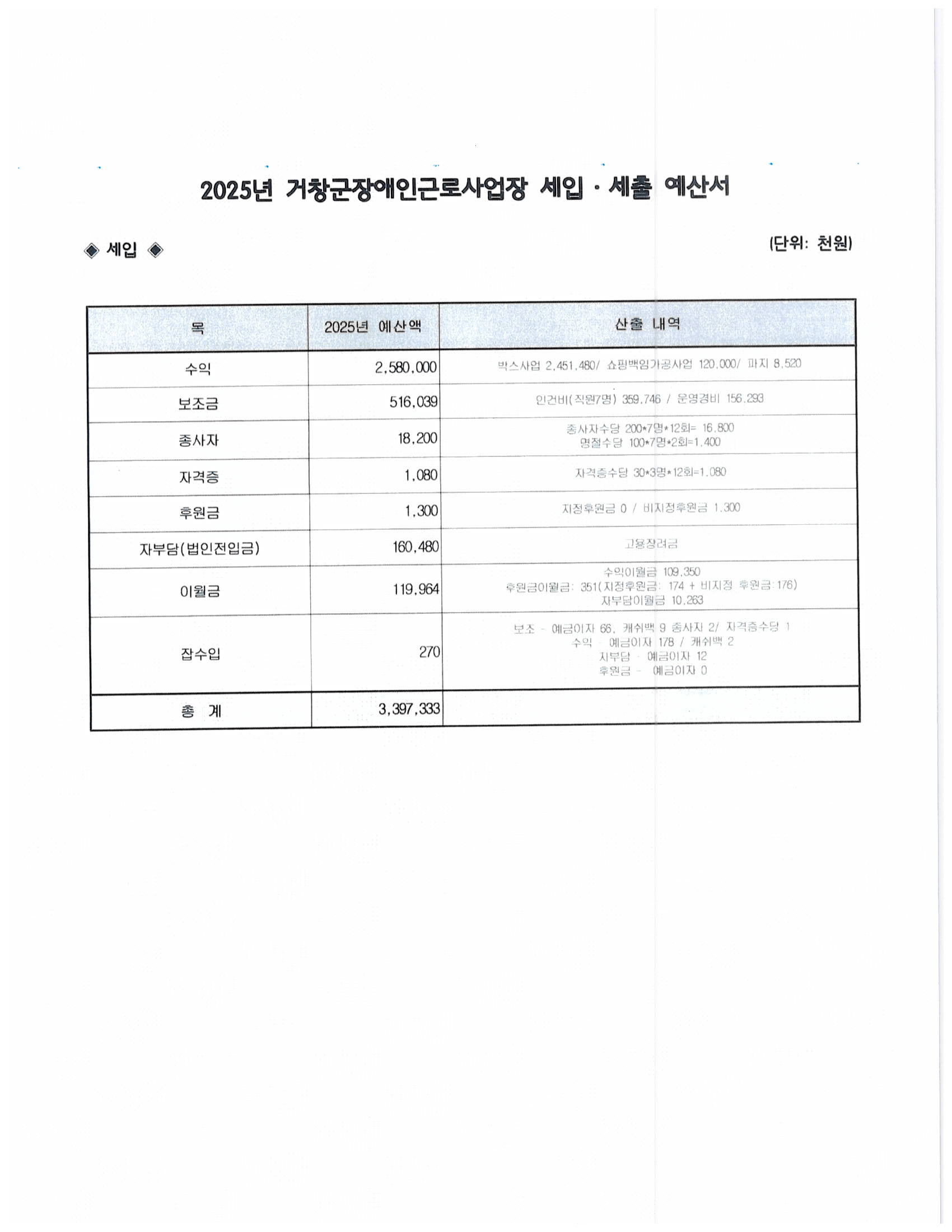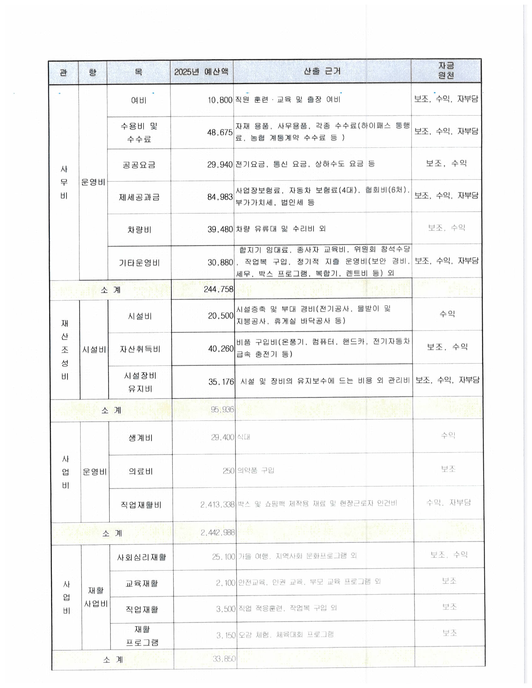 2024년 사단법인 경상남도장애인부모연대 거창군지회 세입·세출 결산서 및 2025년 세입·세출 예산서·예산총칙 작성자느티나무|작성시간25.05.15|조회수27 목록 댓글 0 글자크기 작게가 글자크기 크게가 다음검색 현재 게시글 추가 기능 열기 북마크 공유하기 신고 센터로 신고 댓글 댓글 0 댓글쓰기 답글쓰기 댓글 리스트