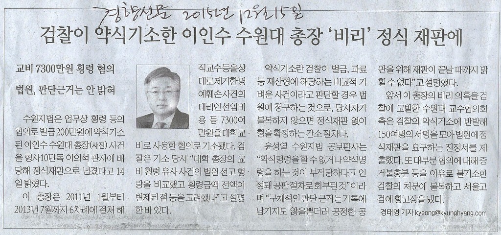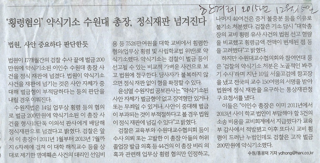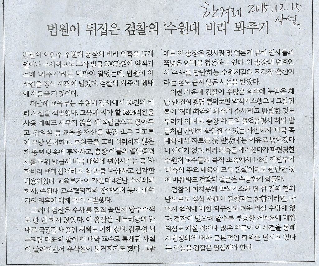 작성자교협 홍보실 작성시간 15.12.15 검찰이 가장 무서워하는 것은 언론이라는데, 검찰이 이인수씨를 봐주기가 점점 어렵게 되었습니다.