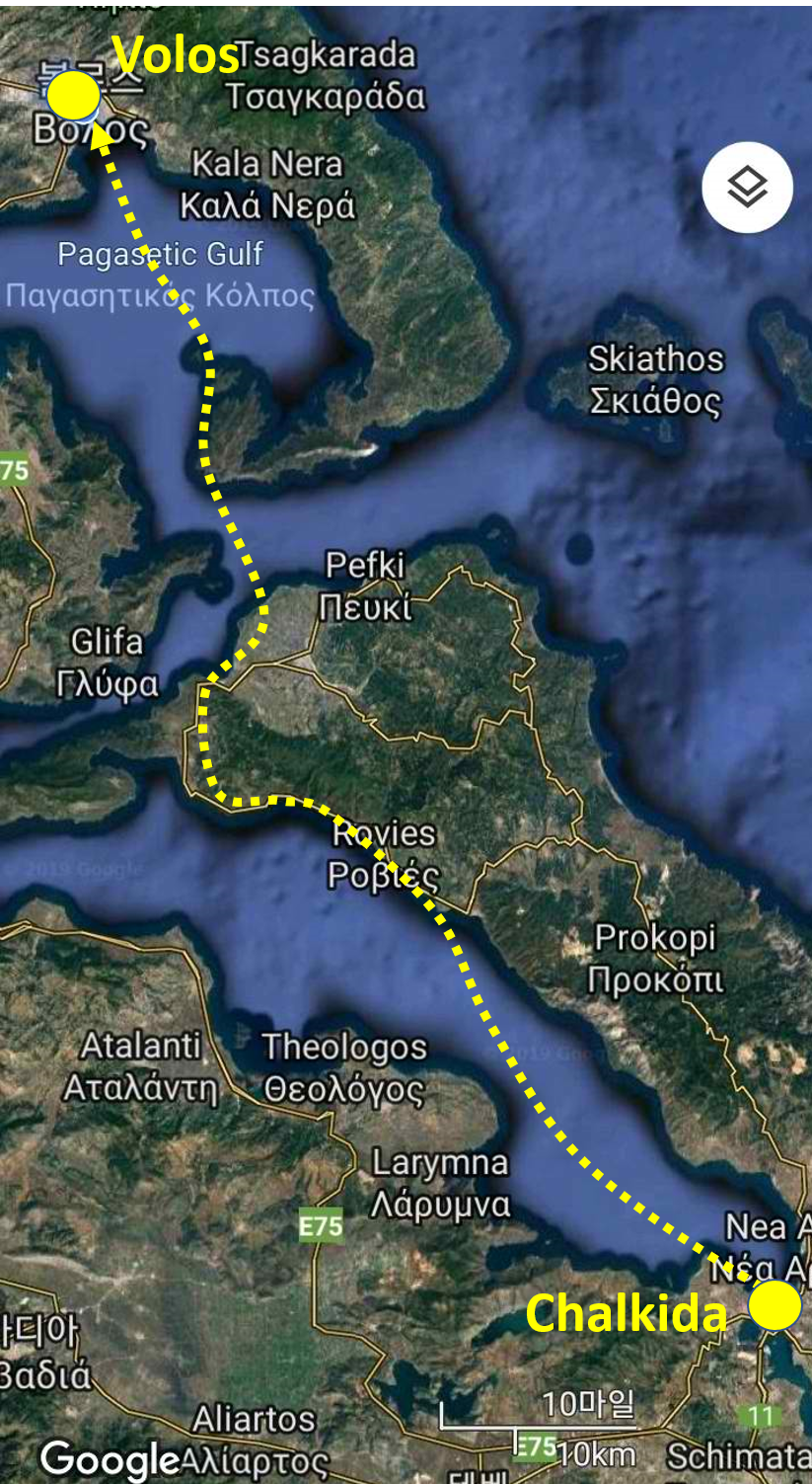 1. 원래 오늘부터 Chalkida에서 Volos로 물을 건너 가는 코스를 3일 정도로 예정했었다.