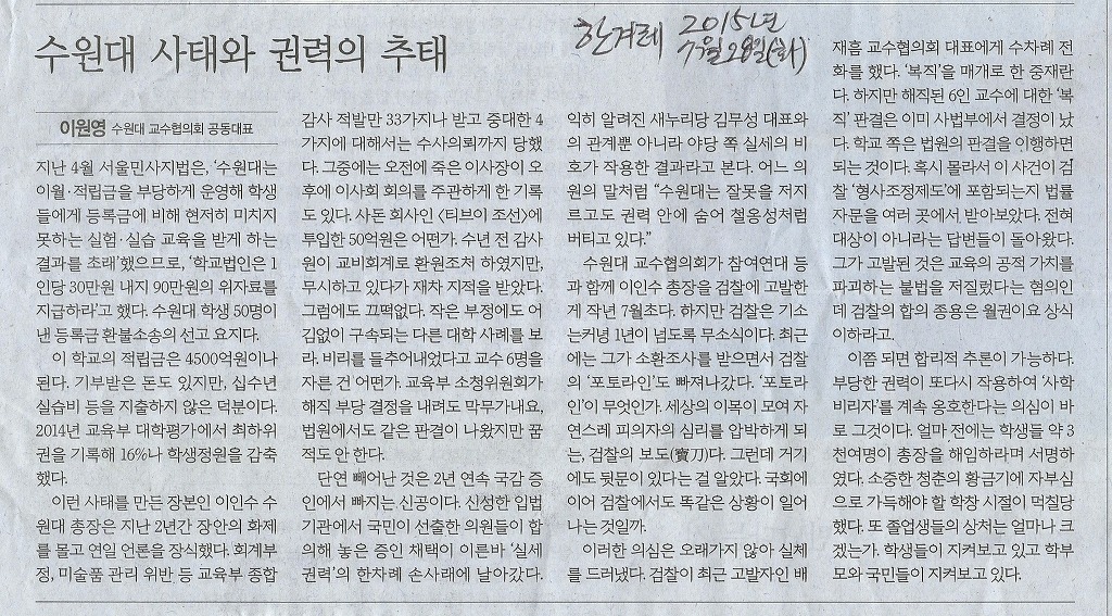 [한겨레 왜냐면] 수원대 사태와 권력의 추태 / 이원영 작성자상생21|작성시간15.07.28|조회수306 목록 댓글 0 글자크기 작게가 글자크기 크게가 다음검색 현재 게시글 추가 기능 열기 북마크 공유하기 신고 센터로 신고 댓글 댓글 0 댓글쓰기 댓글 리스트