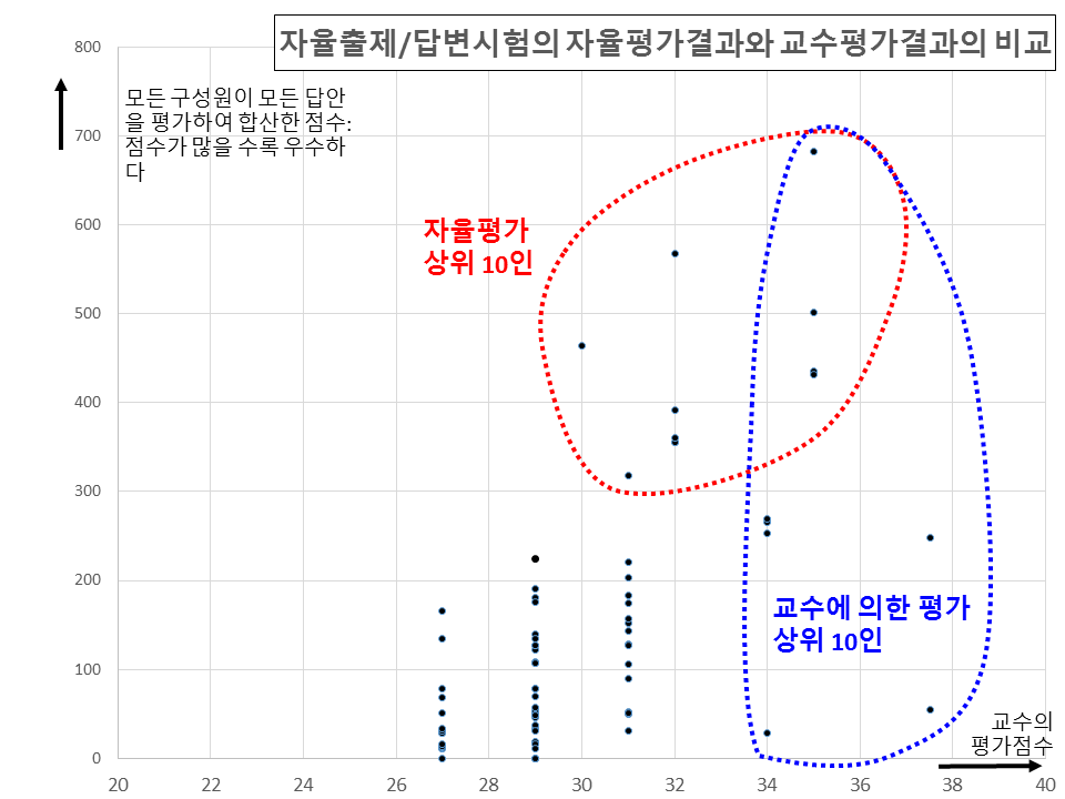 그리하여 최종성적평가는 교수의 평가를 주된 기준으로 하되 학생들의 평가통계는 보조적 기준으로 활용하였습니다.