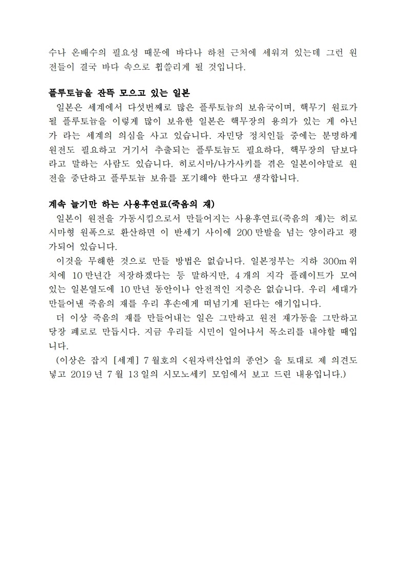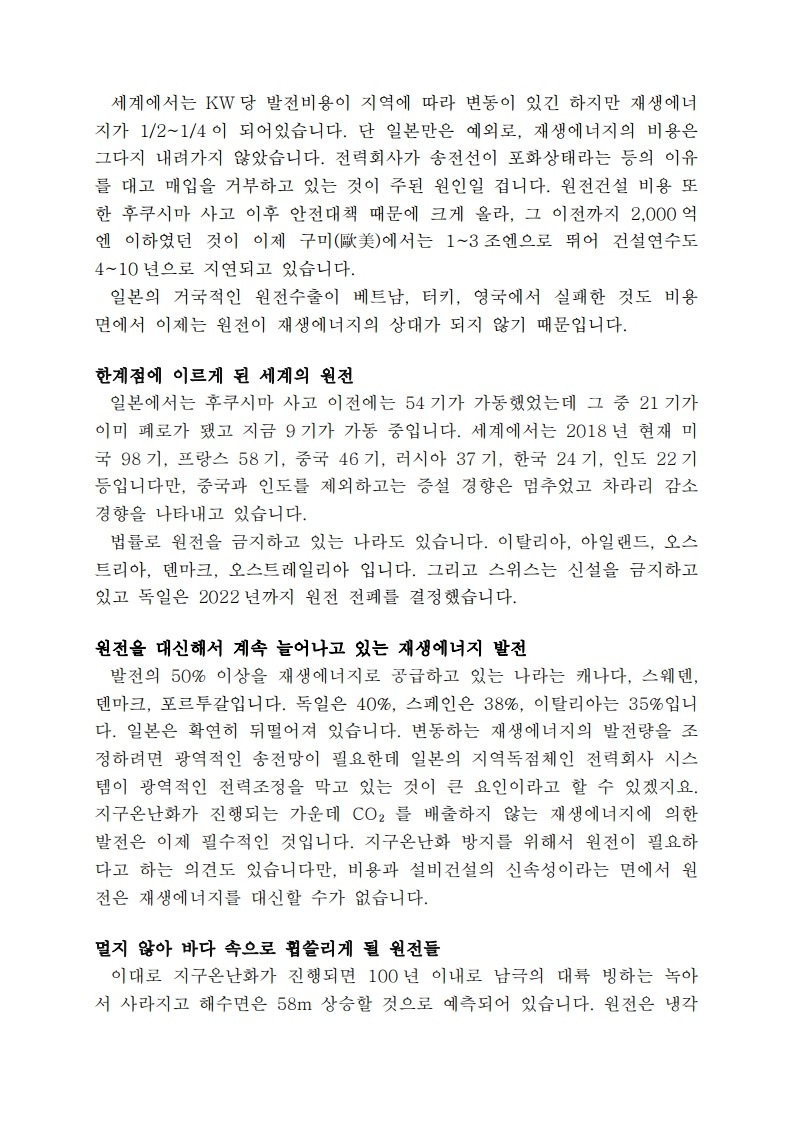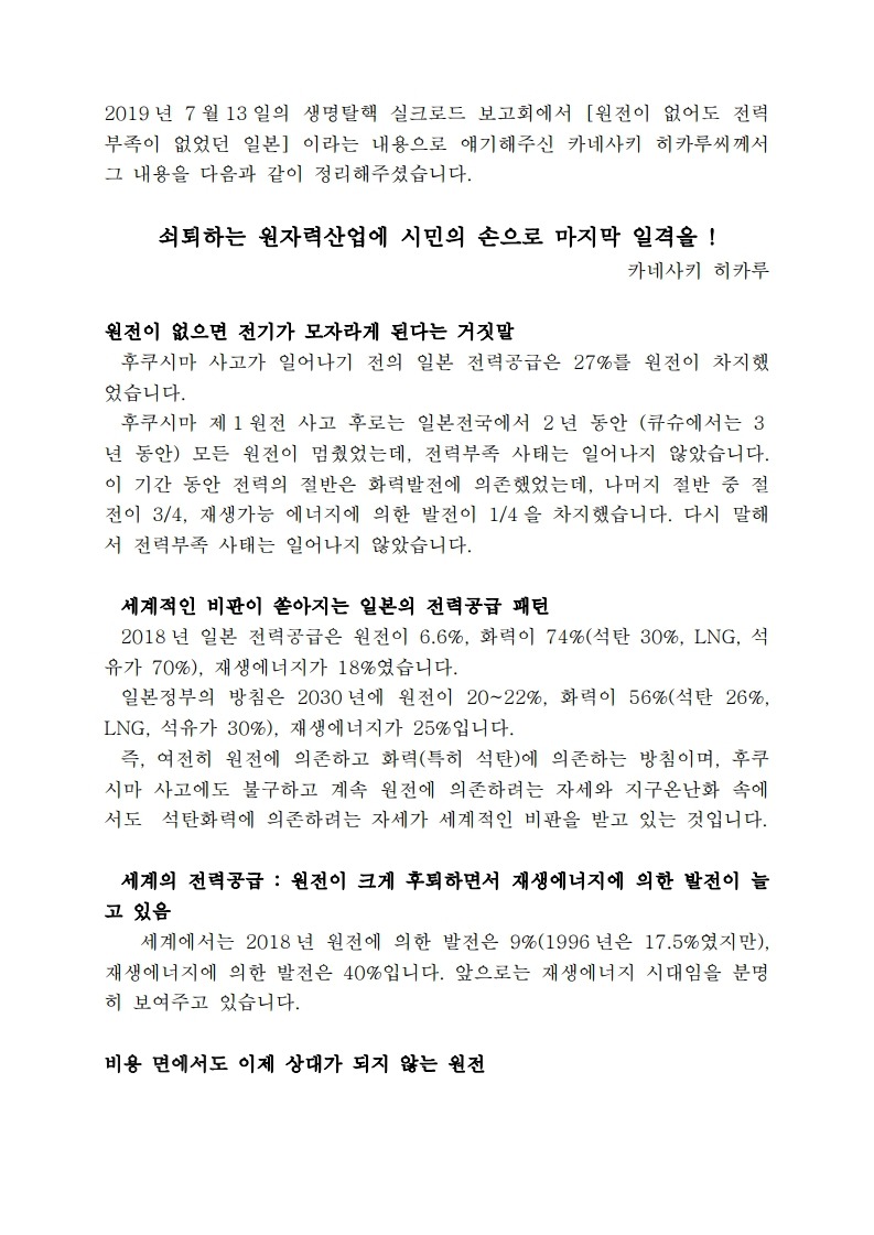 지난 2019년 7월 13일 일본 시모노세키에서는 생명탈핵실크로드 보고회가 열렸습니다. 이 자리에서 카네사키 히카루 선생은 “원전이 없어도 전력부족이 없었던 일본”이라는 주제로 발표를 하였습니다. 그 내용을 정리하여 함께 공유하고자 합니다. 감사합니다.