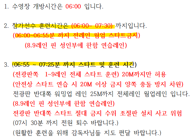내일 시간별/팀별 웜업레인 배정은 따로 없나요?