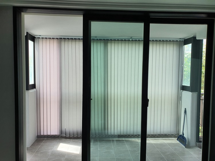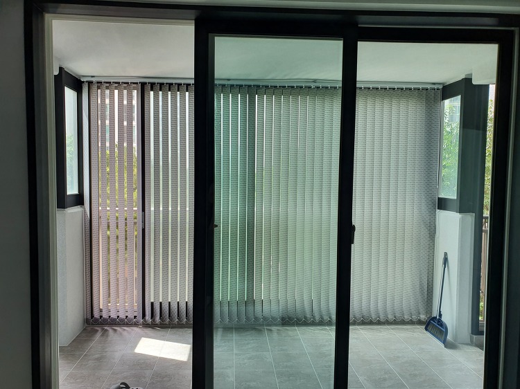 발코니에 그레이색상 디자인버티컬블라인드 설치하였어요.