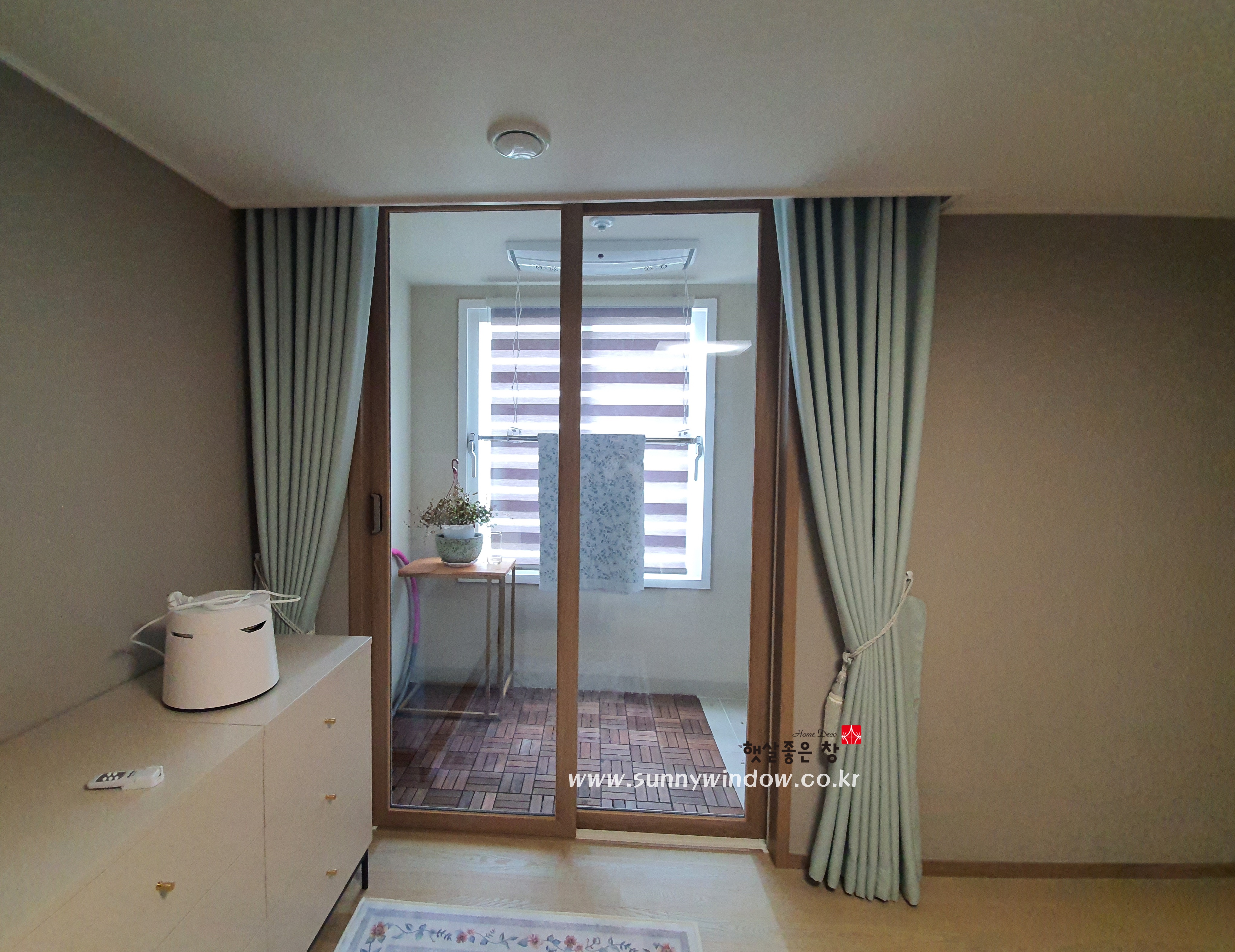 안방에 민트색상원단에 암막원단겹으로 제작하여 설치.