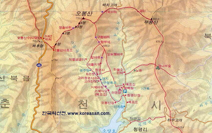 곳곳에 쇠줄을 잡고 오르내려야 하는 곳이 있지만 조심해서 운행하면 짜릿한 스릴을 만끽하면서 산행할 수 있다. 또한 이 산을 찾아간다면 기차와 배를 타고 찾아가는 철도, 호반산행지이며 정상 남쪽에는 천년의 고찰 청평사가 자리잡고 있다-진혁진의 백두대간과정보에서