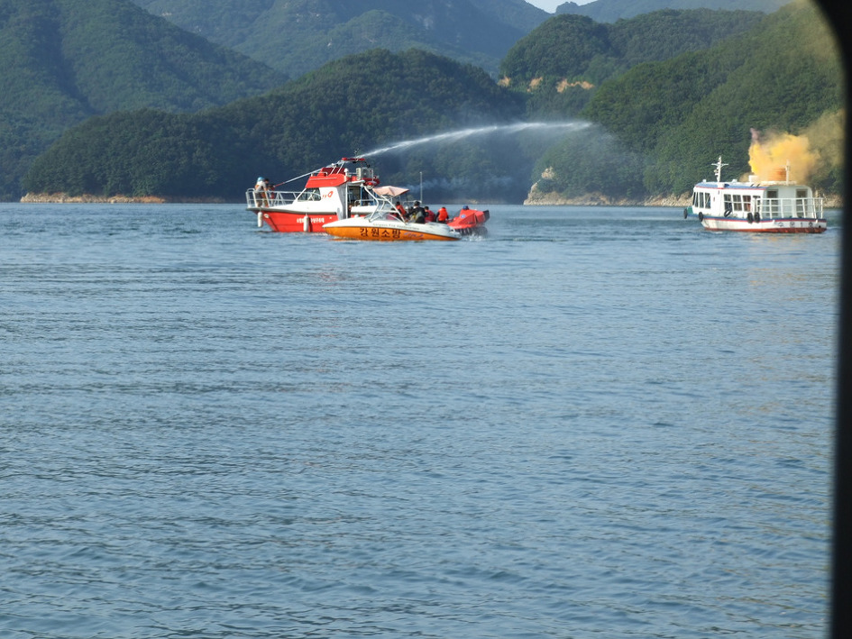 소양강 선착장 부근에서 마침 유람선 화재진압과 인명구조 훈련을 실시중인 광경을 보면서