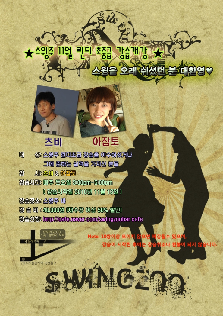 소수정예 멤버만을 대상으로한 세심한 강습, 가족적인 분위기의 스윙주에서 여러분의 스윙아웃을 완성하세요.^^