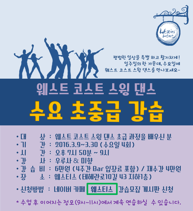 - 강습대상 : 웨스트 코스트 스윙 댄스 초급 과정을 배우신 분