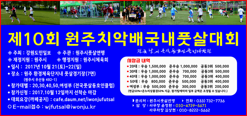 제10회 원주치악배국내풋살대회 개최요강 및 참가신청서 작성자원풋연|작성시간17.09.28|조회수111 목록 댓글 0 글자크기 작게가 글자크기 크게가 제10회 원주시치악배국내풋살대회 대회요강(2017).hwp 참가신청서 및 서약서.hwp 첨부파일첨부된 파일이 3개 있습니다. jpg 파일 홍보이미지.jpg 다운로드 hwp 파일 제10회 원주시치악배국내풋살대회 대회요강(2017).hwp 다운로드 hwp 파일 참가신청서 및 서약서.hwp 다운로드 다음검색 현재 게시글 추가 기능 열기 북마크 공유하기 신고 센터로 신고 댓글 댓글 0 댓글쓰기 답글쓰기 댓글 리스트