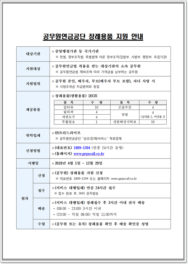 공무원연금공단 장례용품 지원!! 작성자우정|작성시간19.04.17|조회수3,540 목록 댓글 0 글자크기 작게가 글자크기 크게가 공무원연금공단 장례용품 지원!!수원시민주공무원노조(위원장 김해영)에서 알려드립니다.작년까지 국가직 공직자에게만 지원되었던 장례용품 지원이 전국통합공무원노동조합(수원시민주공무원노조)의 지속적인 형평성 문제 제기와 요구로 금년부터 공무원연금법을 적용받는 모든 공직자에게 확대되었습니다. 첨부파일을 참고하시어 이용하시기 바랍니다. 다음검색 현재 게시글 추가 기능 열기 북마크 신고 센터로 신고 댓글 댓글 0 댓글쓰기 답글쓰기 댓글 리스트