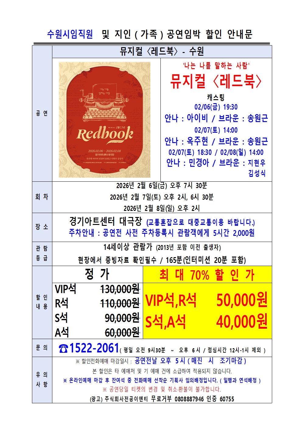 수원특례시민주공무원노조 조합원(후원회원)을 위한 뮤지컬 '레드북' 할인 안내드립니다. 다음 내용을 참고하시어 이용하시기 바랍니다. 감사합니다.