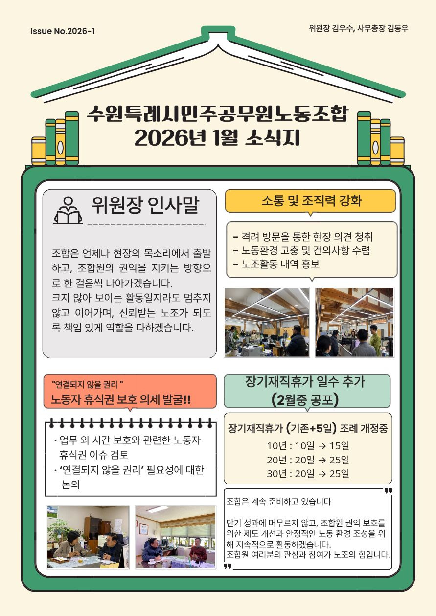 (소식지) 수원특례시민주공무원노조 2026년1월 소식지 작성자hihoho95|작성시간26.01.30|조회수9 목록 댓글 0 글자크기 작게가 글자크기 크게가 다음검색 현재 게시글 추가 기능 열기 북마크 신고 센터로 신고 댓글 댓글 0 댓글쓰기 답글쓰기 댓글 리스트