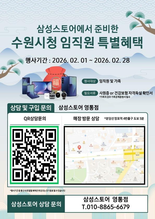 수원특례시민주공무원노조 협약업체 중 하나인 삼성스토어 영통점 우대혜택을 안내드립니다. 조합원 후원회원께서는 다음 내용을 참고하시어 이용하시기 바랍니다.