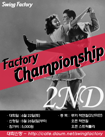 스윙♥팩토리 제2회 팩토리챔피언쉽 안내 ★ 대회 신청 안내 ★ 신청일 : 5월26일 부터 대회일 : 6월22일(토) 참가비 : 5,000원