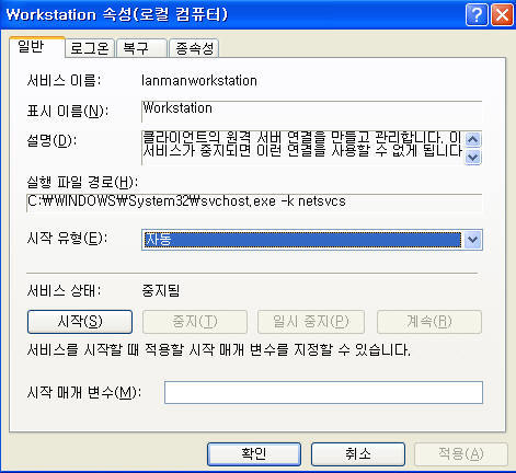 ⑤ 『 Workstation 속성(로컬 컴퓨터 』화면에서 시작유형을 자동으로 하고【 시작 】하면됩니다.