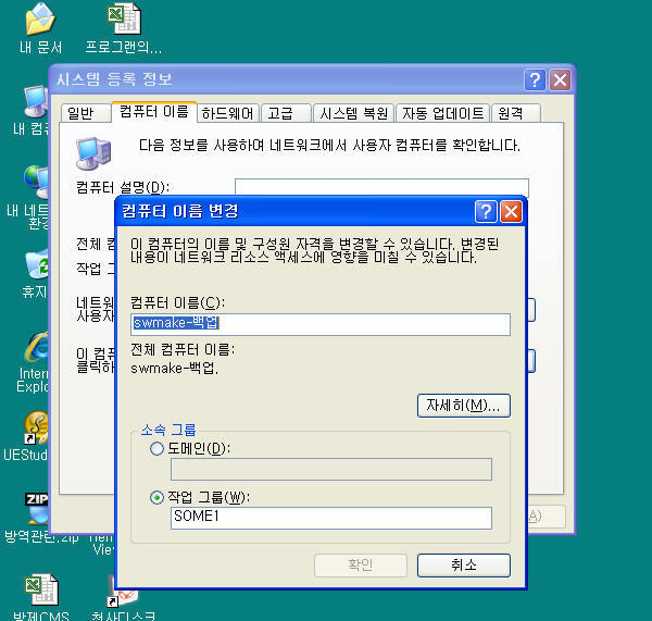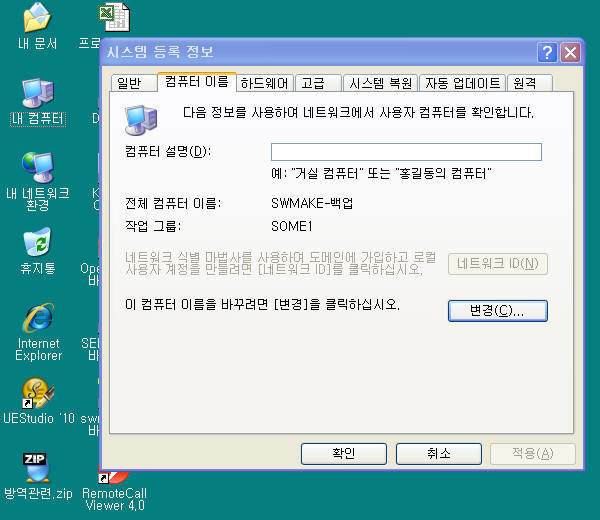 ② 아래와 같은『 컴퓨터 이름 변경 』】화면에서 컴퓨터 이름이나 작업그룹을 변경할 수