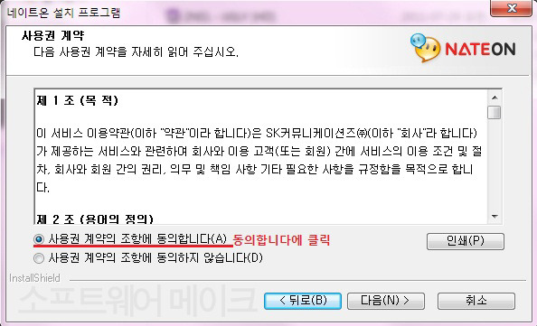 다운이 완료되면 네이트온 설치화면이 뜹니다. 동의합니다를 클릭하고 다음을 누릅니다.