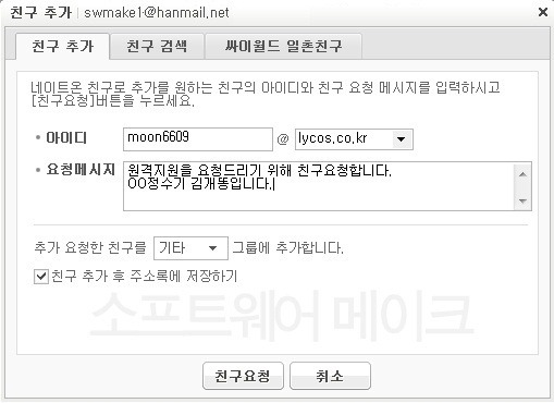 친구추가 창에 안내받으신 고객지원센터 직원의 아이디를 쓰고서 친구요청을 누릅니다.