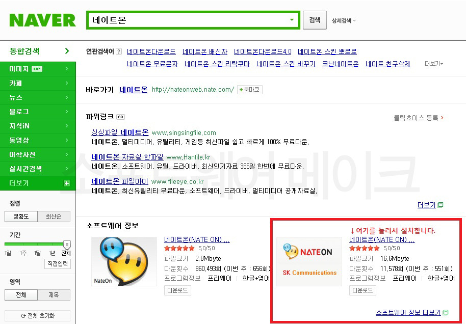 이렇게 검색을 하면 네이트 온과 관련된 프로그램을 소프트웨어 정보에서 찾아볼 수 있습니다.