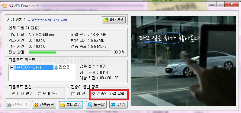 전 네이버에서 받다보니 이런 창이 뜨는군요. 오른쪽 보시면 전송된 파일 실행에 체크해두시면 다운이 완료되면