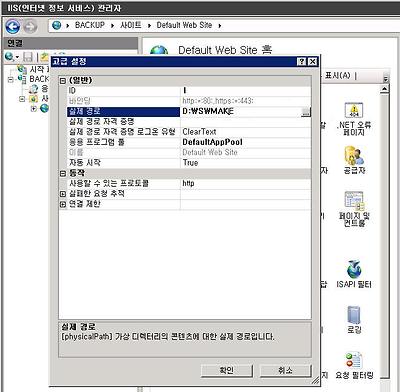 아래 그림과 같이 웹 서버의 Default Web Site 에서 이 서버에서 운영할 홈페이지에 대한 정보를