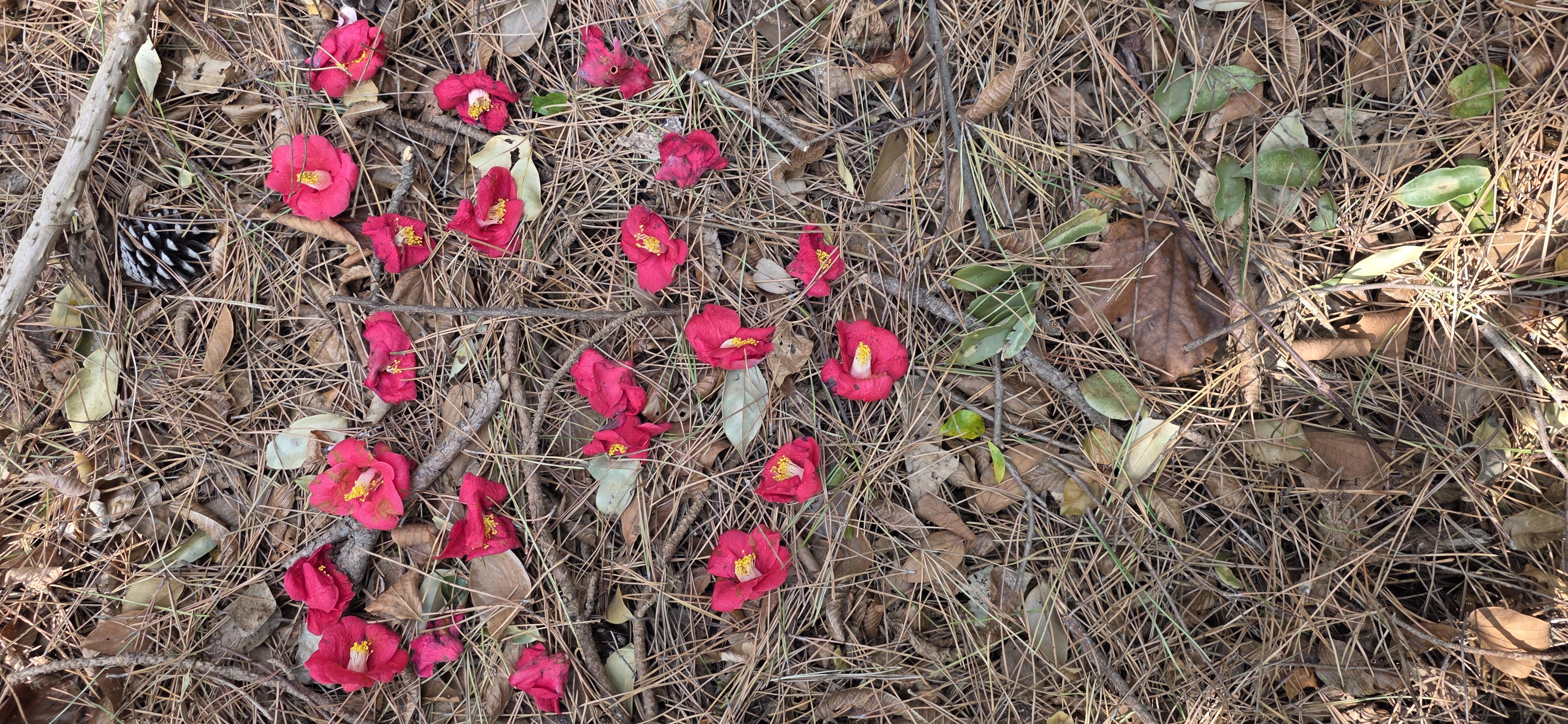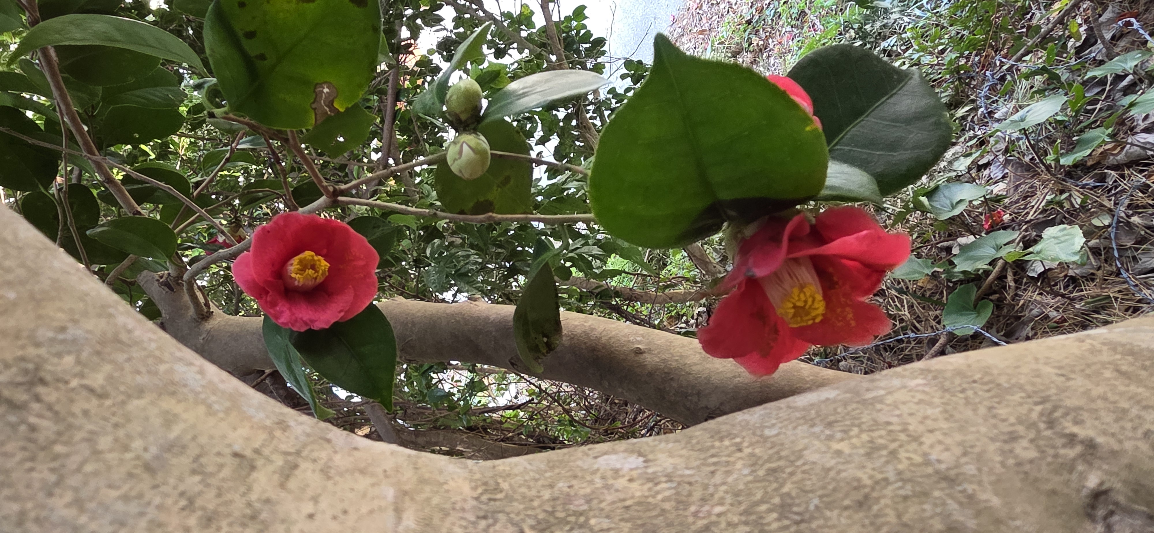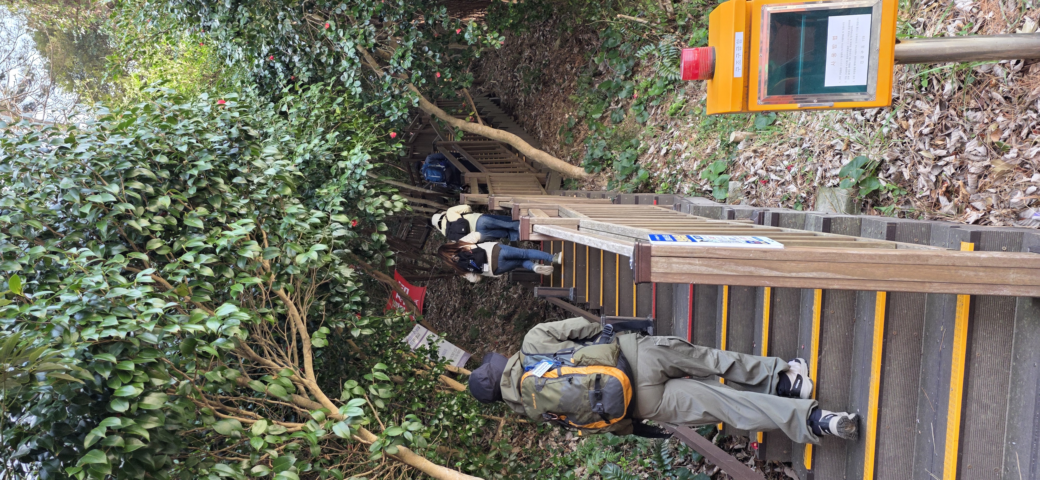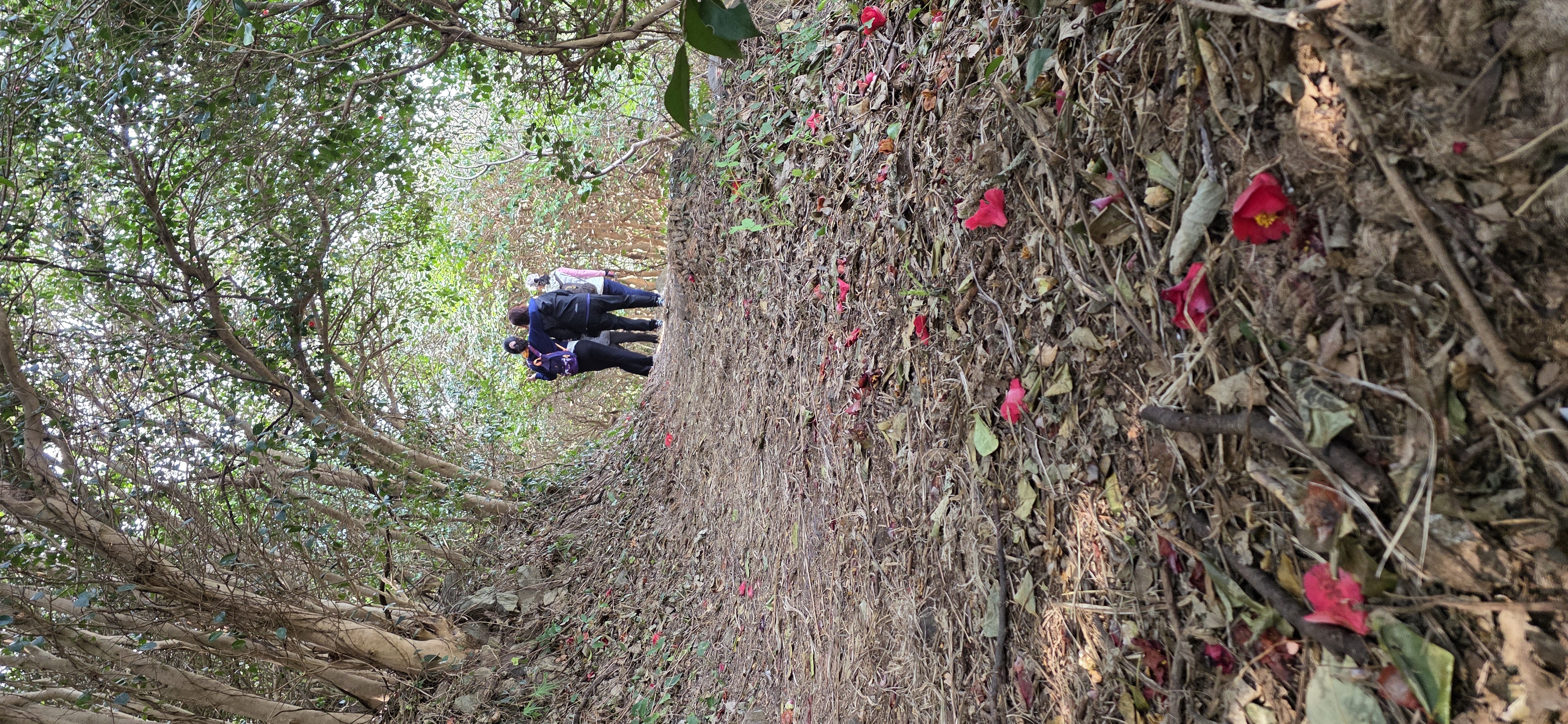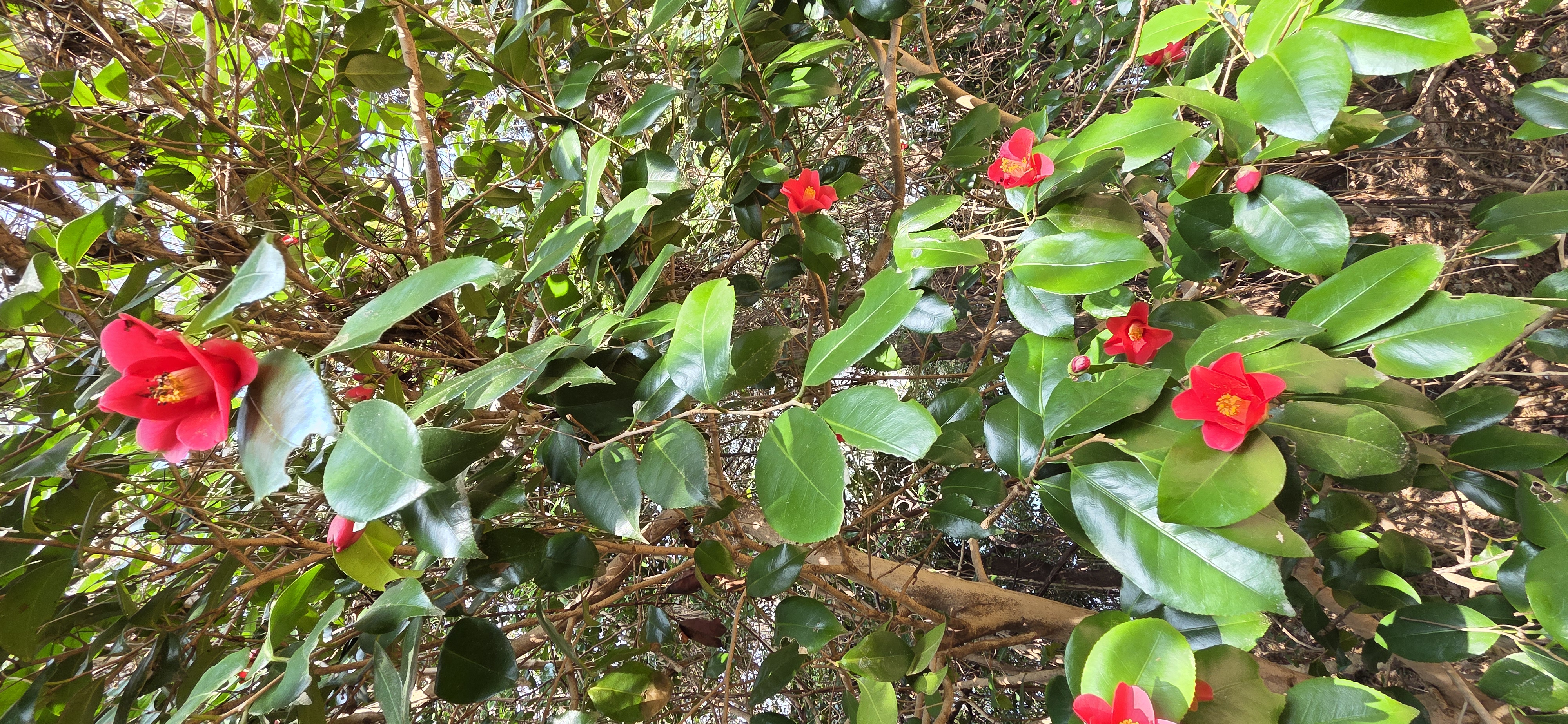 우거진 동백꽃나무숲에 꽃두있다.
