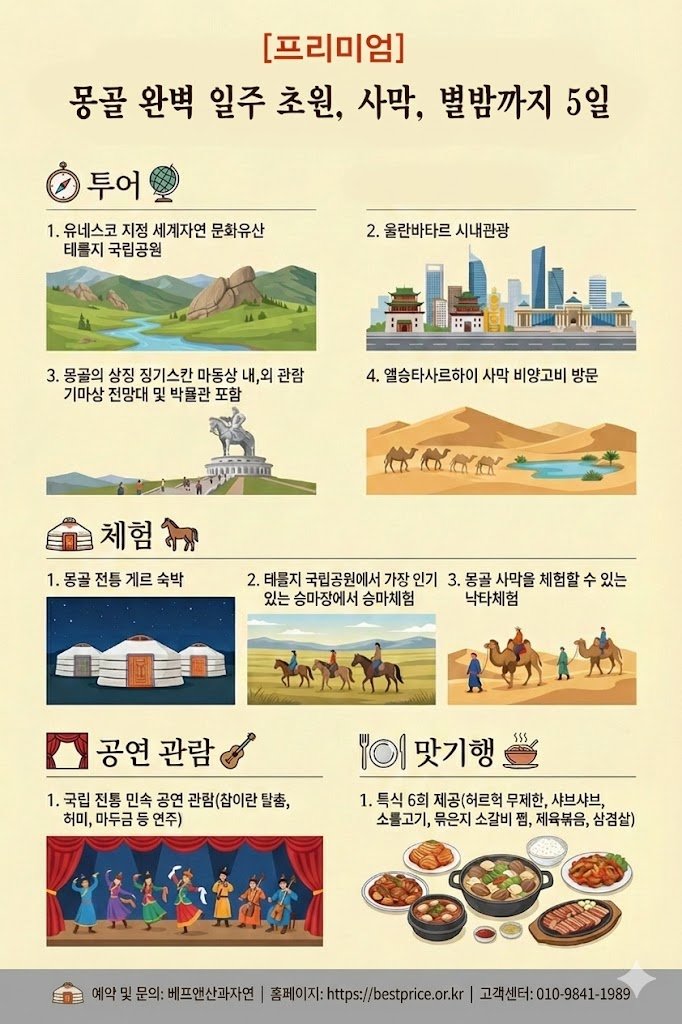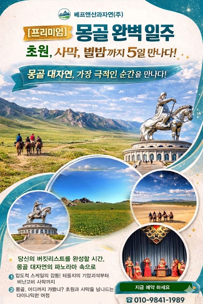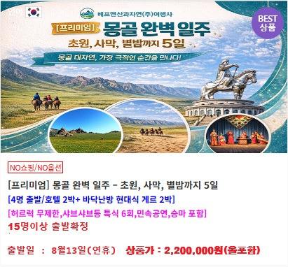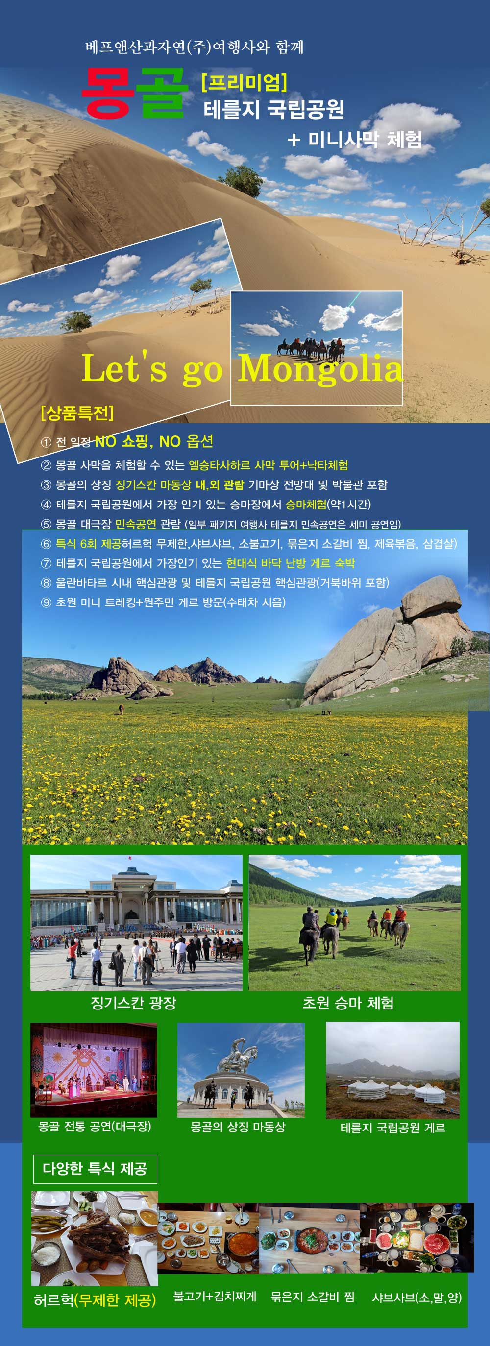 상품명 : [프리미엄] 몽골 완벽 일주 – 초원, 사막, 별밤까지 5일 출발일 : 8월13일 - 17일[연휴] 상품가 : 2,200,000원[올포함] 출발인원 : 15명 이상 [상품소개] ✨ 몽골 테를지 국립공원 & 비냔고비 사막 & 울란바타르 핵심 탐험 ✨ 몽골 대자연의 극적인 순간을 경험하라! ✔ 몽골 최고 인기 명소 ‘테를지 국립공원’ 게르 숙박 ✔ 웅장한 돌산, 신비로운 기암괴석, 끝없이 펼쳐진 대초원 탐방 ✔ 비냔고비(엘승타사하르) 사막에서 짜릿한 낙타 체험 ✔ 울란바타르 핵심 관광 & 전통 공연 관람 ✔ 몽골 대표 특식 5회 제공 – 초원의 맛을 제대로 즐기다! ✨ 광활한 몽골, 압도적인 자연과 문화를 한 번에! ✈️ ✨ 몽골 여행은 전문가와 함께! ✅ 몽골 전문 여행사가 보장하는 최고의 코스 & 완벽한 일정 ✅ 검증된 한국어 가이드 & 프리미엄 서비스 제공 ✅ 대자연 속에서 잊지 못할 모험을 선사합니다! [필독] 5명 출발시 호텔 싱글룸비용, 게르 1개 추가, 차량변경 등으로 인해 동일한 요금에 출발이 불가합니다. ✨ 몽골의 감동을 직접 경험하고 싶다면? 지금 예약하세요! [상품특전] ① 울란바타르 시내관광 - 자이승 전승탑 및 이태준 열사 기념공원 - 몽골의 마지막 황제 벅드칸 여름 및 겨울 궁전 방문 - 몽골 라마불교의 총본산 간등 사원/국립 역사 박물관 - 수흐바타르 광장 및 징기스칸 기념관 ② 엘승타사르하이 비양고비 방문 - 사막 모래언덕 자유시간(썰매 체험) - 몽골 사막을 체험할 수 있는 엘승타사하르 사막 투어+낙타체험 - 모래사막 남쪽에 있는 시웨트산(바위산) 산책(약 1시간 소요) ③ 유네스코 지정 세계자연 문화유산 테를지 국립공원 - 몽골 민간신앙의 상징 어워(성황당) 감상 - 테를지 국립공원 명소 거북바위, 책읽는 바위, 아르야발 사원 등 관광 - 테를지 국립공원에서 가장 인기 있는 승마장에서 승마체험(약1시간) ④ 국립 전통 민속 공연 관람(참이란 탈춤, 허미, 마두금 등 연주) ⑤ 몽골의 상징 징기스칸 마동상 내,외 관람 기마상 전망대 및 박물관 포함 ⑥ 테를지 국립공원에서 가장인기 있는 현대식 바닥 난방 게르 숙박(3~4인 1실) ⑦ 특식 6회 제공(허르헉 무제한,샤브샤브, 소불고기, 묵은지 소갈비 찜, 제육볶음, 삼겹살) ⑧ 테를지 이동 중 초원 미니 트레킹+원주민 게르 방문(수태차 시음) ⑨ 오리지날 노마틱 체험(선택사항)요금 원가 $50불/1인 [포함사항] ▣ 국제선 왕복 항공요금 (인천-몽골) ▣ 정 4성급(★★★★) 호텔(2인 1실) ▣ 테를지 현대식 바닥난방 게르 3~4인1실(공동화장실&샤워장)/엘승타사르 일반게르(3~4인1실)] ▣ 전일정 차량비용 ▣ 전일정 한국어 가이드 ▣ 일정표에 명시된 전일정 식사비용(특식포함) ▣ 일정표에 명시된 관광지 입장료 ▣ 엘승타사르하이 (낙타 트레킹, 미니 오아시스 탐방) ▣ 징기스칸 마동산 관광 ▣ 테를지 국립공원 관광(초원 승마체험) ▣ 몽골 전통 민속공연 관람 ▣ 울란바타르 시티투어 ▣ 여행자보험(최고 1억원) DB화재 ▣ 기사/가이드팁 [불포함사항] ▣ 호텔 싱글룸 비용 $50불/1박/1인(게르 싱글룸 사용불가) 코스 소개 1일차 ▶ 8월12일 23:00 인천제1국제공항 K카운터 3시간전 “베프앤산과자연”미팅 ---------------------------------------------------------------------------------- ▶ 8월13일 01:50 인천 국제공항 출발(몽골) ▶ 8월13일 04:30 울란바타르 UBN 칭기스칸 국제공항 도착 입국 수속 후 수원 명산 산악회 가이드 미팅 (도착한국 보다 1시간 느립니다.) ** 항공편은 변경 될수 있습니다 ▶ 조식 후 노마틱 캠프 체험장으로 이동(100km 약 1시간 30분) ▶ 오리지날 노마틱 체험(10:00~12:00 2시간 노마틱 캠프에서 진행) - 작은 나담 축제 : 몽골 전통 씨름, 활 쏘기 체험, 유목민 아이들과 함께 춤추기등 ▶ 이동 중 소,말, 양떼와 유목민들의 삶과 대초원 감상하면서 이동 ▶ 엘승 타사르하이 사막 체험 - 엘승 타사르하이(모래의 단절)이란 뜻이며 초원에서 약 80km 이어진 모래언덕이다. 울란바타르 시내에서 가장 근거리에 위치한 사막이며, 이지역은 몽골의 자연백화점이라 부를 만큼 여러까지 장관을 연출 ☞ 사막 낙타 체험 ☞ 사막 썰매 체험 ☞ 모래사막 남쪽에 있는 시웨트산(바위산) 산책(약 1시간 소요) ▶ 별이 솟아 지는 밤하늘 감상하기 식사 : 조:현지식 중: 게르식 석:게르식 호텔: 허먹 전통 럭셔리 게르 (3~4인1실/ 내부 화장실,샤워실) 2일차 캠프 조식 후 울란바타르로 이동(약 5시간) 중식 유네스코 지정 세계자연 문화유산 테를지 국립공원 이동(약1시간 소요) ▶ 대형마트 현지인들이 즐겨 찾는 로컬 마트 방문 ▶ 몽골 샤머니즘의 상징물 어워(차창관광) ▶ 테를지 이동 중 초원 미니 트레킹+원주민 게르 방문(수태차 시음) * 트레킹은 못하는 분은 차량 근방 자유시간 ▶ 징기스칸 마동상 관광(내부 포함) 기마상 전망대 및 박물관 - 독수리와 사진 찍기(개별 지불) 몽골 전통 가옥에서 휴식하며 별이 쏟아지는 밤하늘의 별 감상 및 휴식 식사 : 조: 게르식 중:게르식 석: 특식(허르럭) 호텔 : 럭셔리 게르 숙박 (3~4인 1실)/내부화장실+욕실 3일차 캠프 조식 후 ▶ 테렐지 국립공원 관광 ☞ 테렐지 국립공원의 명물 <거북바위>관람 ▶ 승마 안전 교육 및 푸른 초원 배경으로 승마 트레킹 체험(