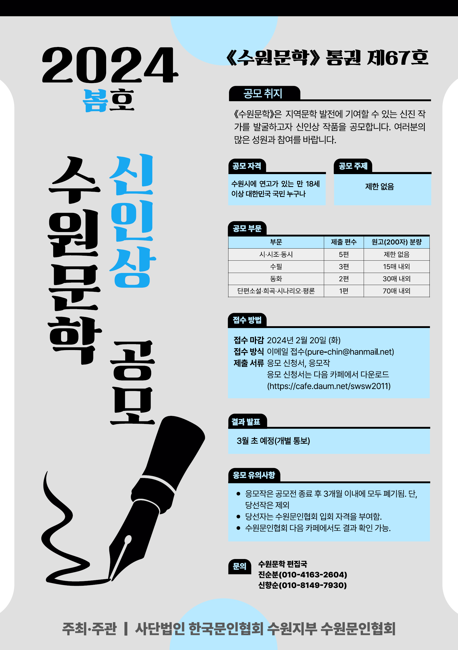 《수원문학》 신인상 공모 포스터 - 2024년 봄(67)호 작성자황남희|작성시간24.02.17|조회수127 목록 댓글 0 글자크기 작게가 글자크기 크게가 다음검색 현재 게시글 추가 기능 열기 북마크 공유하기 신고 센터로 신고 댓글 댓글 0 댓글쓰기 답글쓰기 댓글 리스트