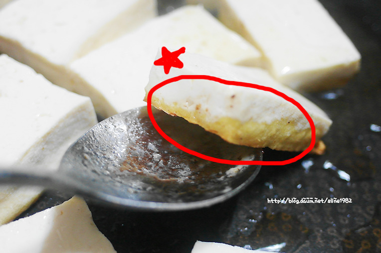 두부를 구워낼때는 요 딱 한번만 뒤집는것이 뽀인트입니다!!