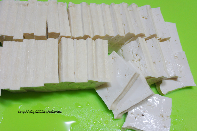 두부는 팩에서 꺼내서 물기를 최대한 빼 주신 후 적당한 두깨와 크기로 썰어주세요~