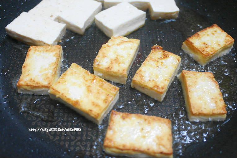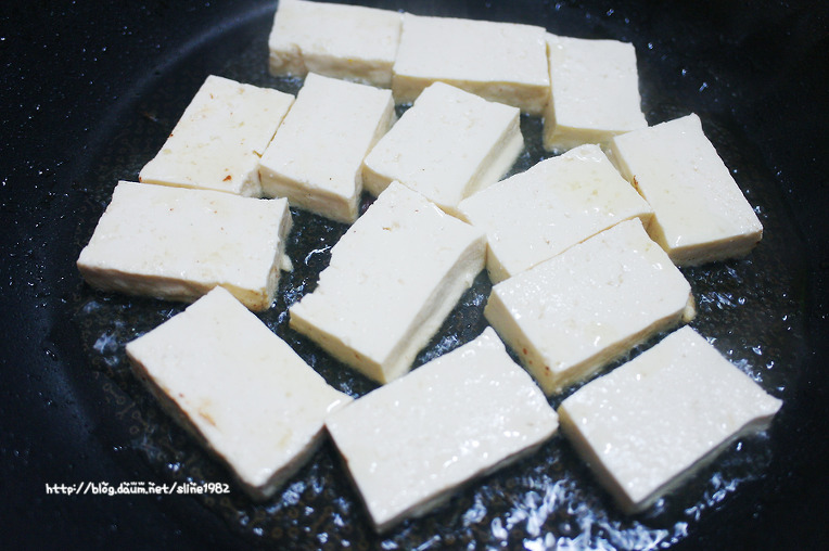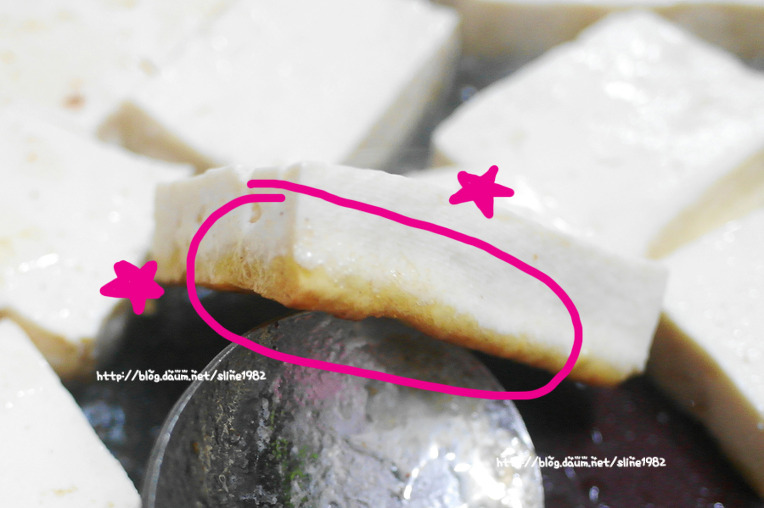 그런데 다들 아시겠지만 두부조림 만들때 가장 조심해야 되는건 두부가 찢어지지 않게 잘 부쳐내는거에요~