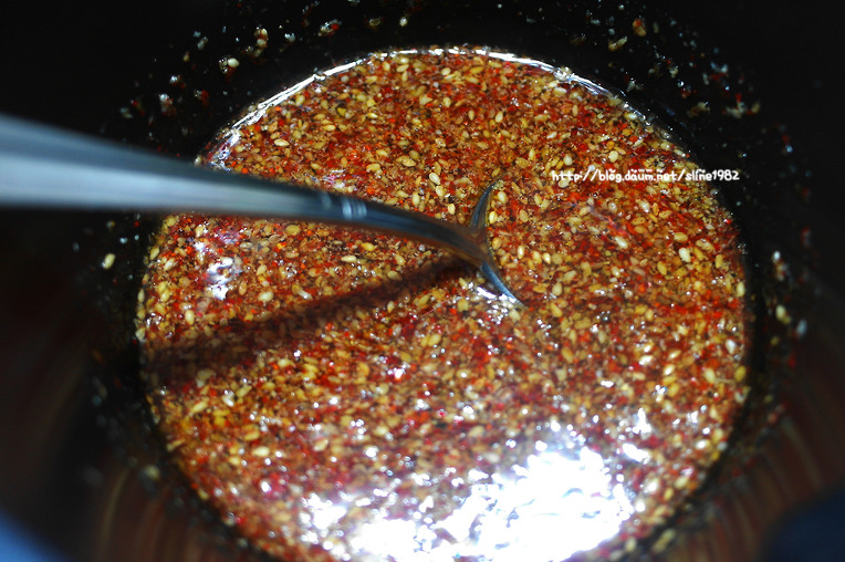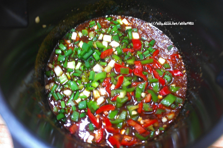적당히 식은 간장양념에 파와 고추를 넣고 잘 섞어주세요~~