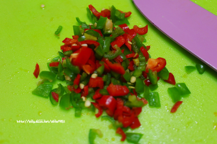 청고추와 홍고추도 배를 갈라 고추씨를 빼준 다음 송송 썰어주세요~~~